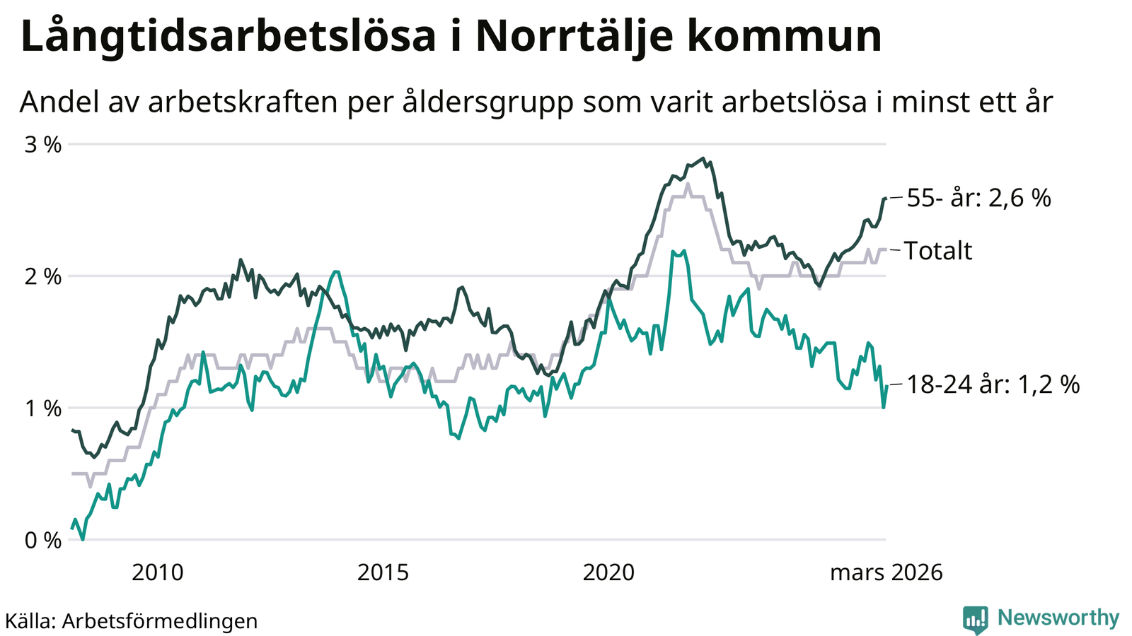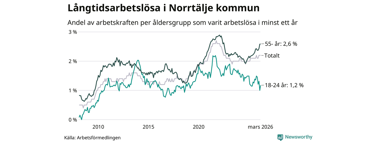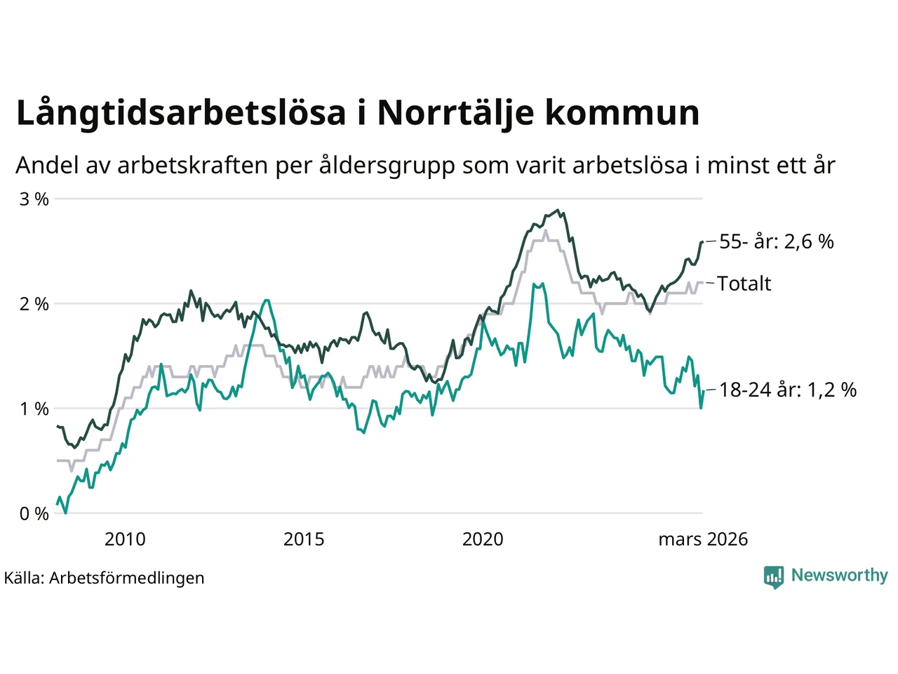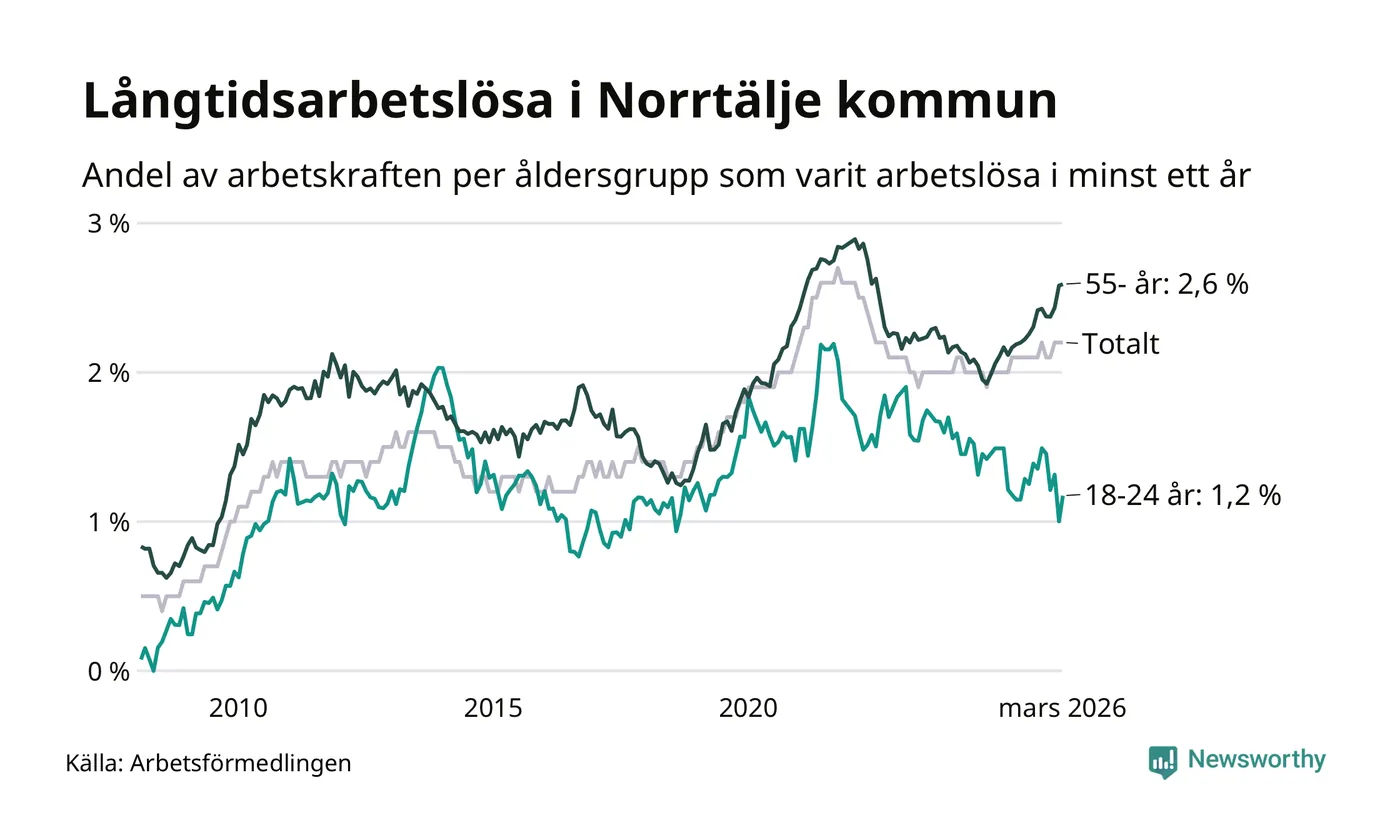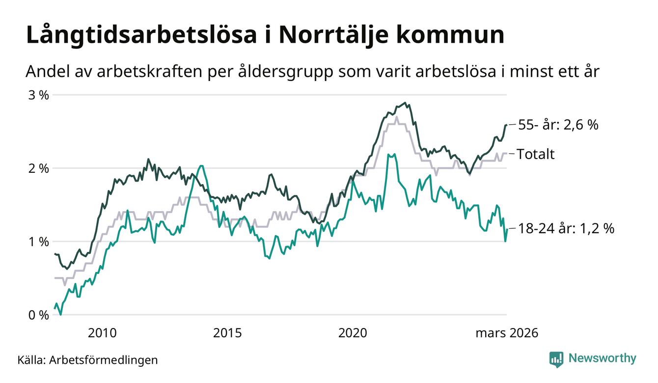 Av de 686 personerna som varit arbetslösa i mer än ett år i Norrtälje kommun är 207 personer mellan 55 och 661 år och 34 är mellan 18 och 24 år. För den äldre gruppen är andelen arbetslösa 2,6 procent medan den i den yngre gruppen är 1,2 procent. Även i riket som helhet är långtidsarbetslösheten högre i gruppen äldre.