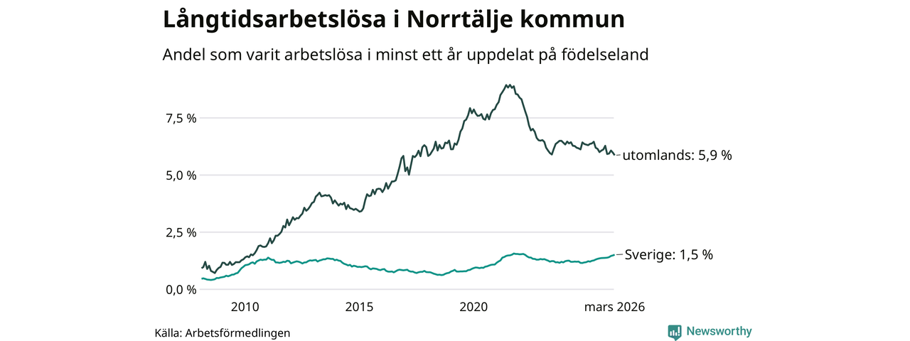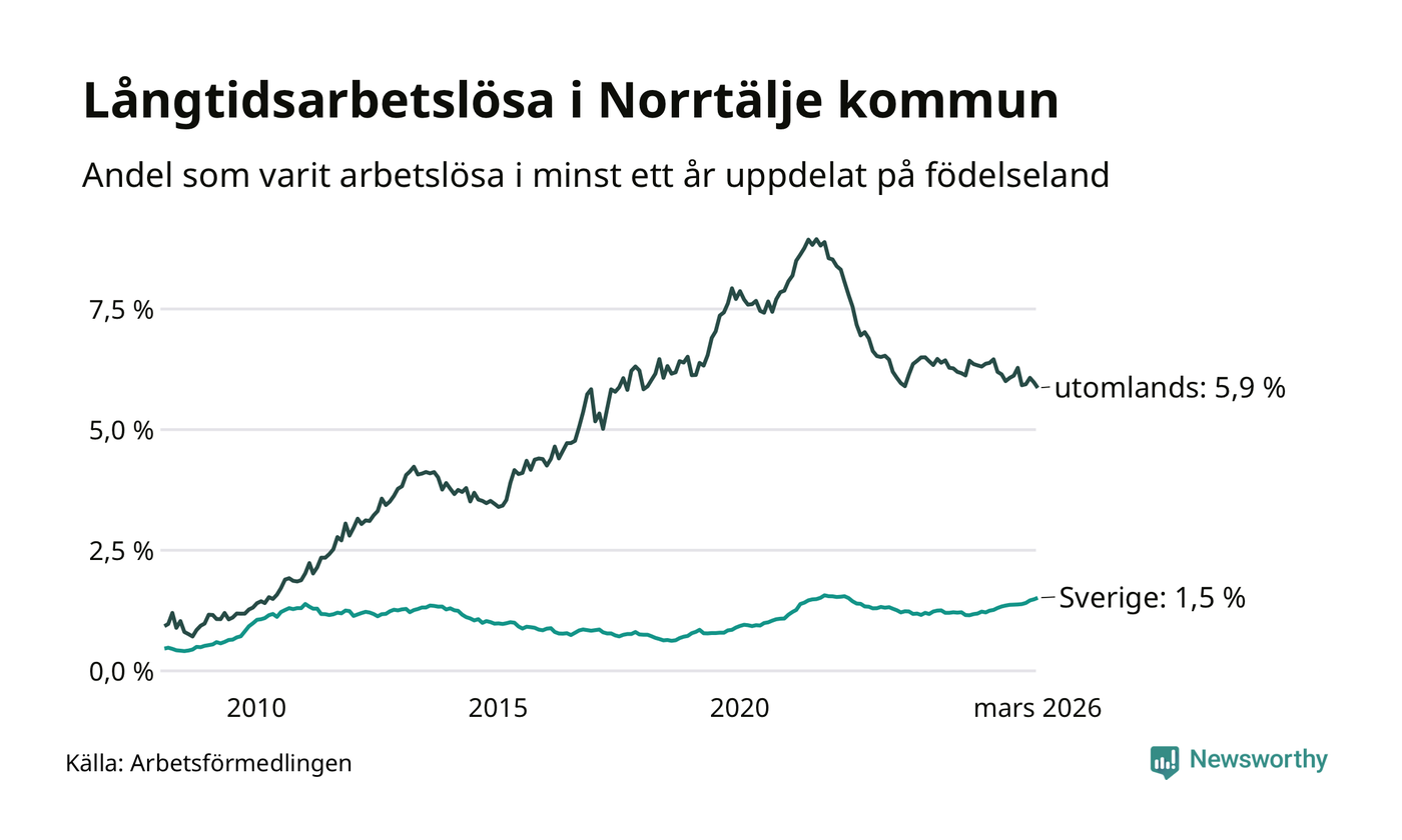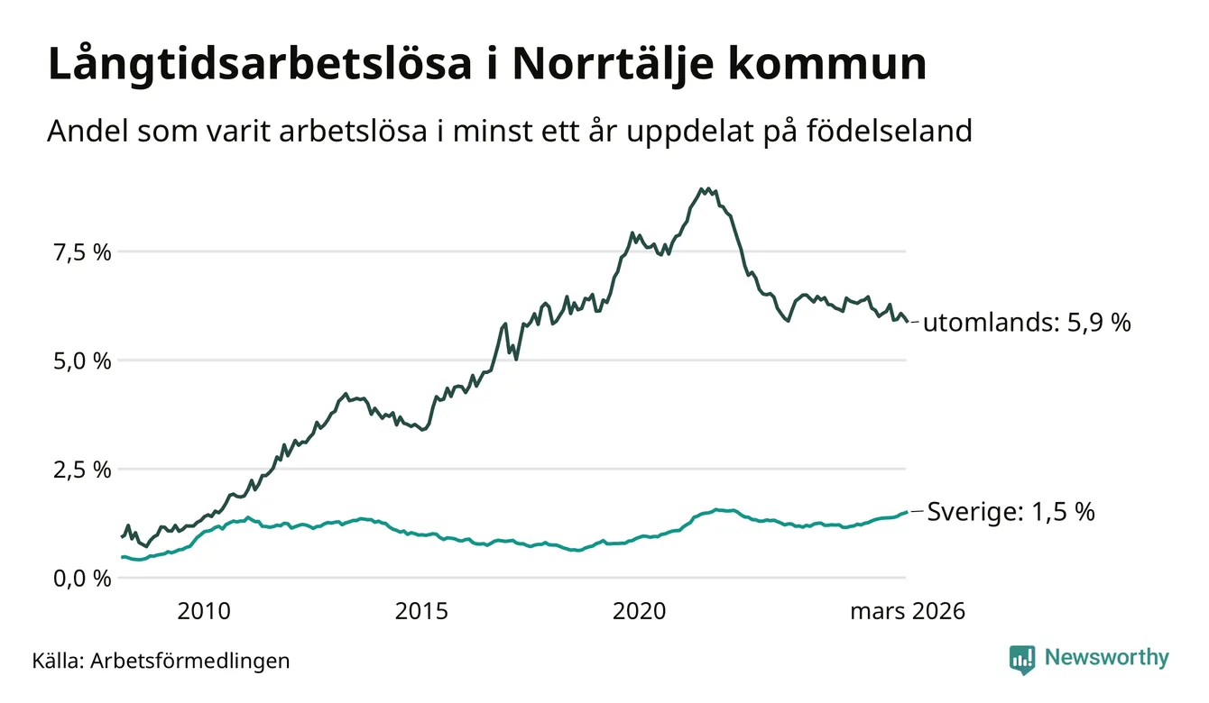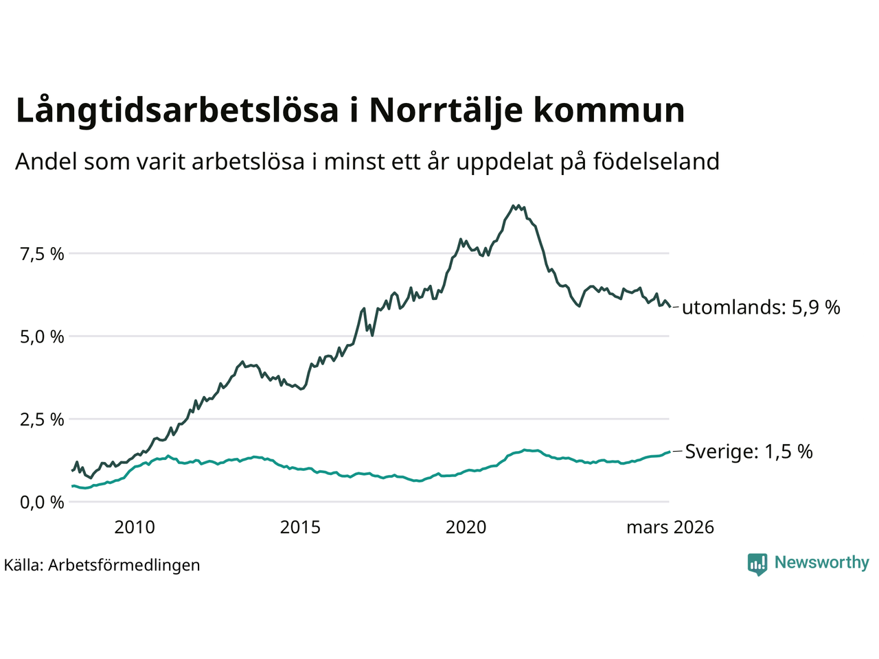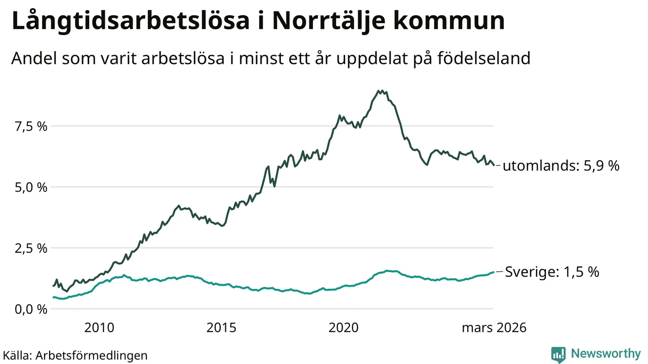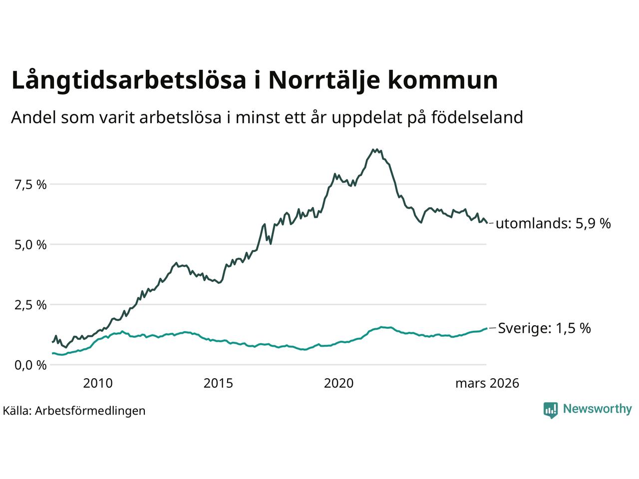 390 av de långtidsarbetslösa i Norrtälje är födda i Sverige, medan 296 är födda utomlands. Det innebär att långtidsarbetslösheten bland Sverigefödda är 1,5 procent, medan den är fyra gånger så hög – 5,9 procent – bland födda utomlands. Även i riket som helhet är arbetslösheten högre bland utrikesfödda.