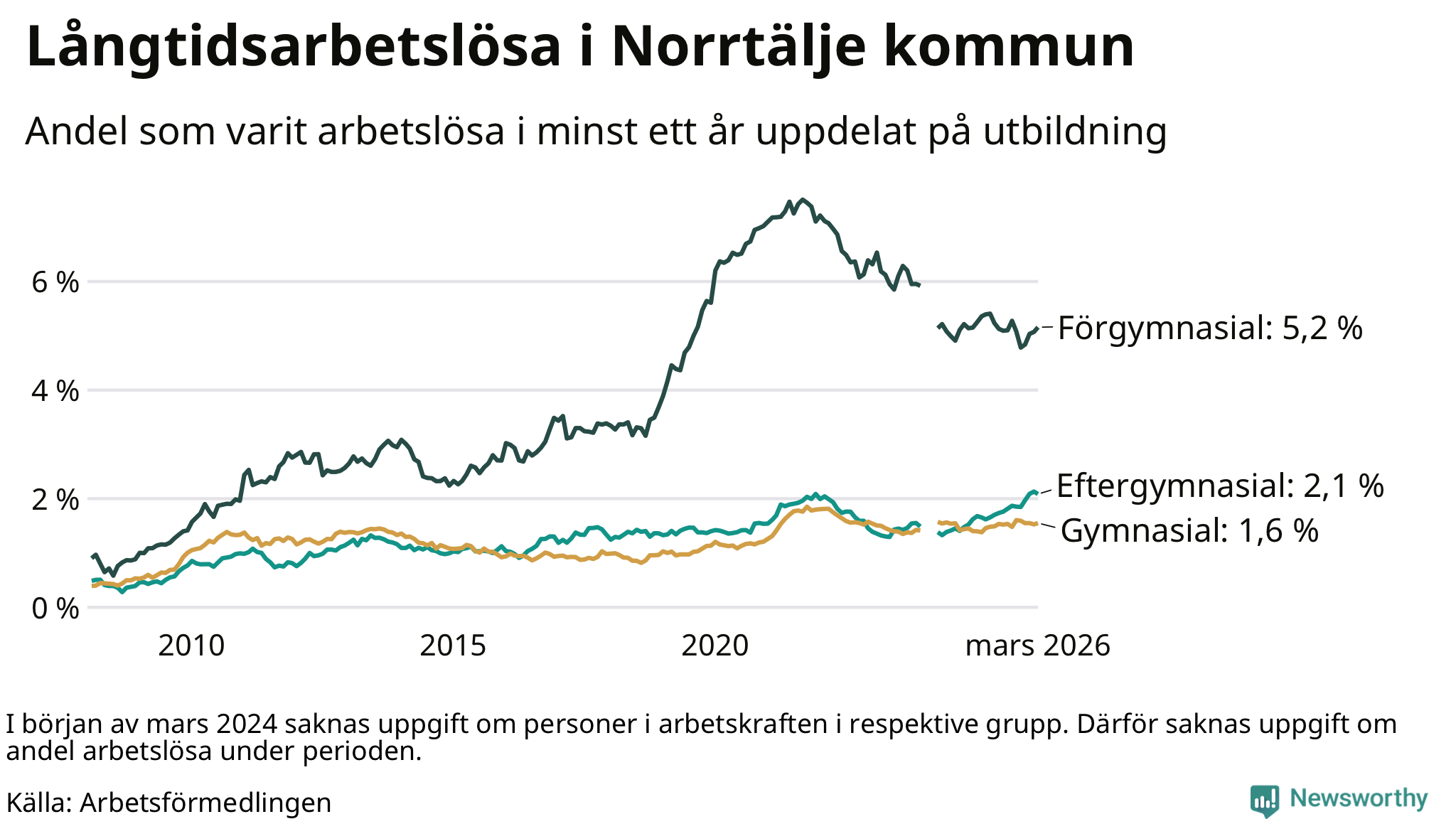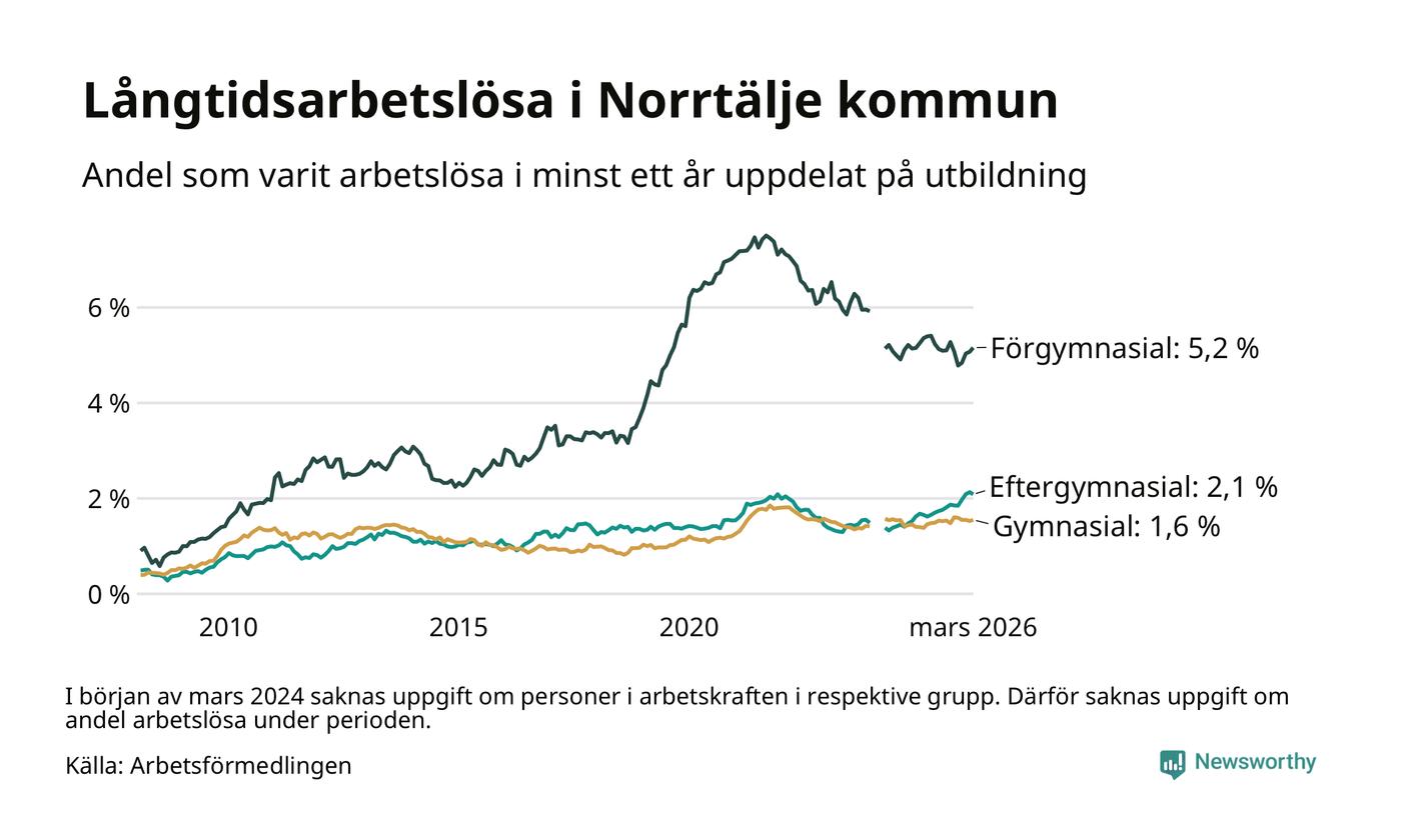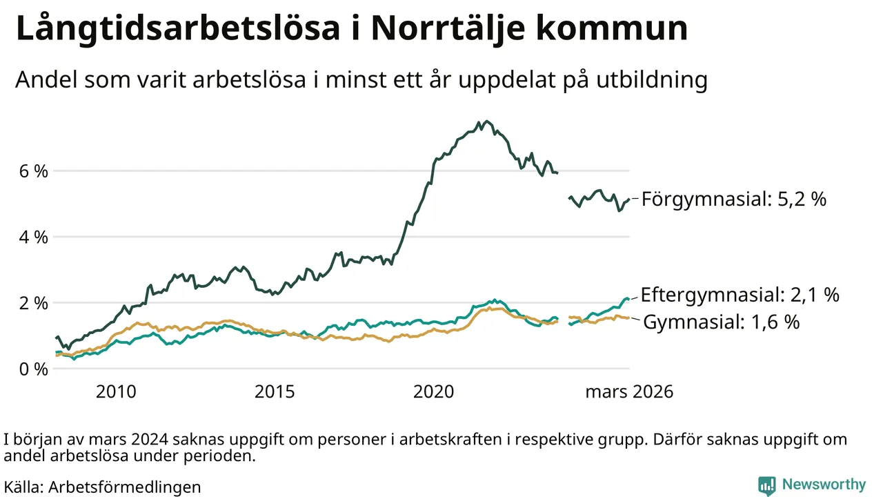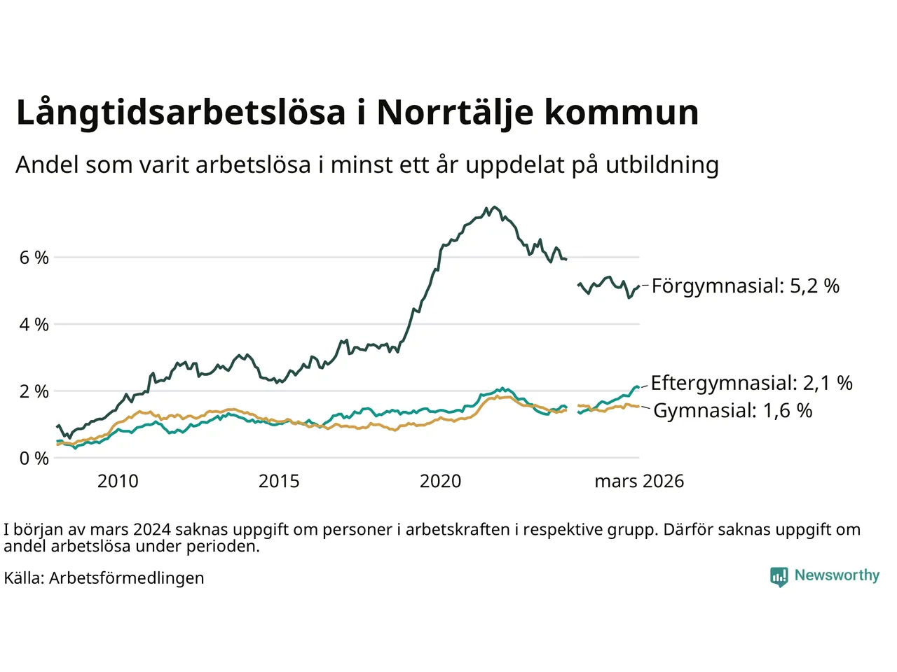 I mars hade 686 Norrtäljebor varit arbetslösa i minst ett år, vilket är tre fler än månaden innan. Det är den fjärde månaden i rad med ökande antal långtidsarbetslösa. 686 personer motsvarar 2,2 procent av arbetskraften i kommunen – andelen långtidsarbetslösa är ungefär på samma nivå som för ett år sedan.