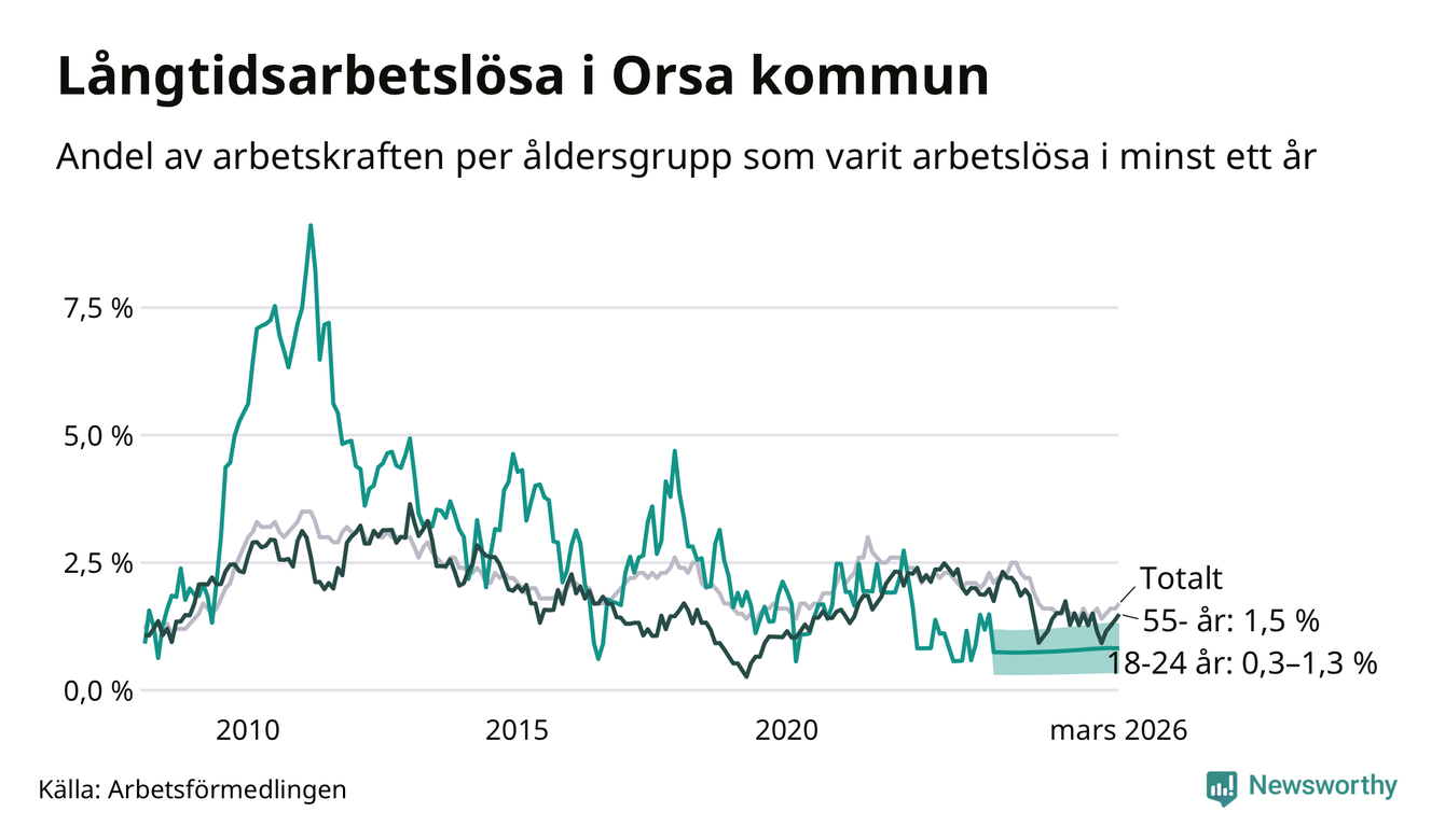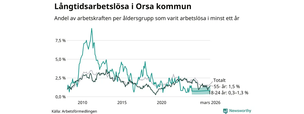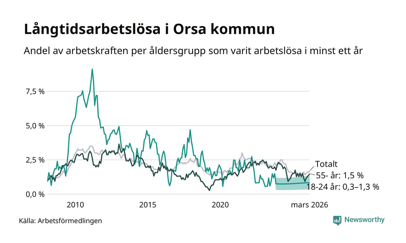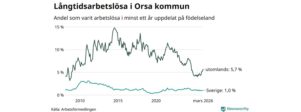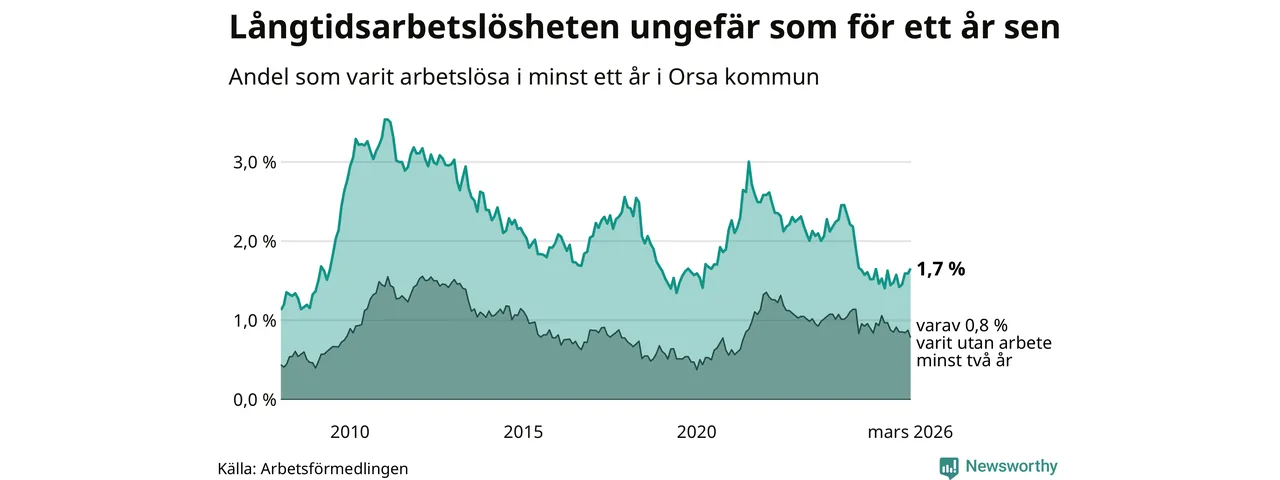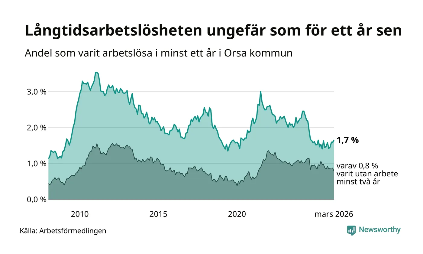 I mars hade 53 Orsabor varit arbetslösa i minst ett år, vilket är två fler än månaden innan. Det är den fjärde månaden i rad med ökande antal långtidsarbetslösa. 53 personer motsvarar 1,7 procent av arbetskraften i kommunen – andelen långtidsarbetslösa är ungefär på samma nivå som för ett år sedan.