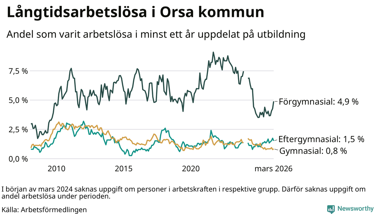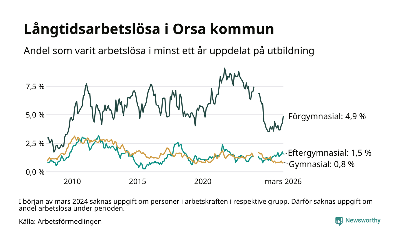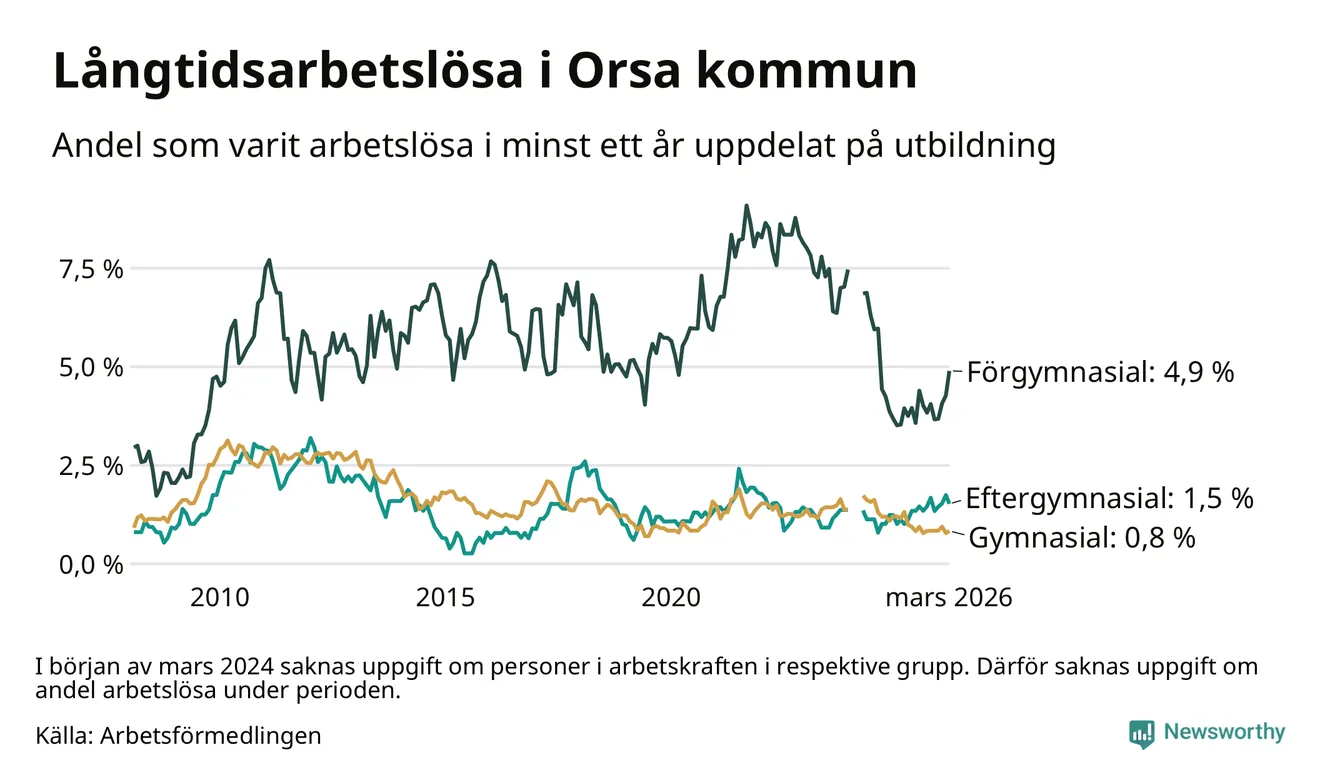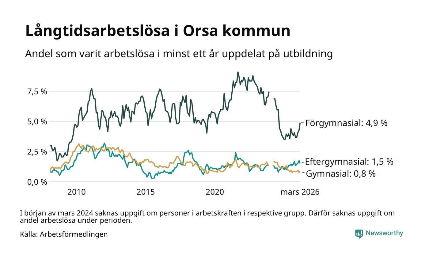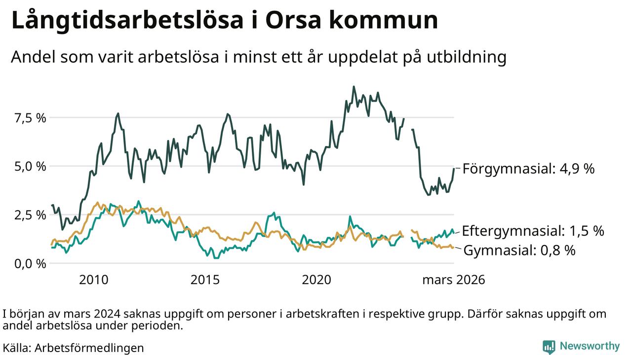 I mars hade 53 Orsabor varit arbetslösa i minst ett år, vilket är två fler än månaden innan. Det är den fjärde månaden i rad med ökande antal långtidsarbetslösa. 53 personer motsvarar 1,7 procent av arbetskraften i kommunen – andelen långtidsarbetslösa är ungefär på samma nivå som för ett år sedan.
