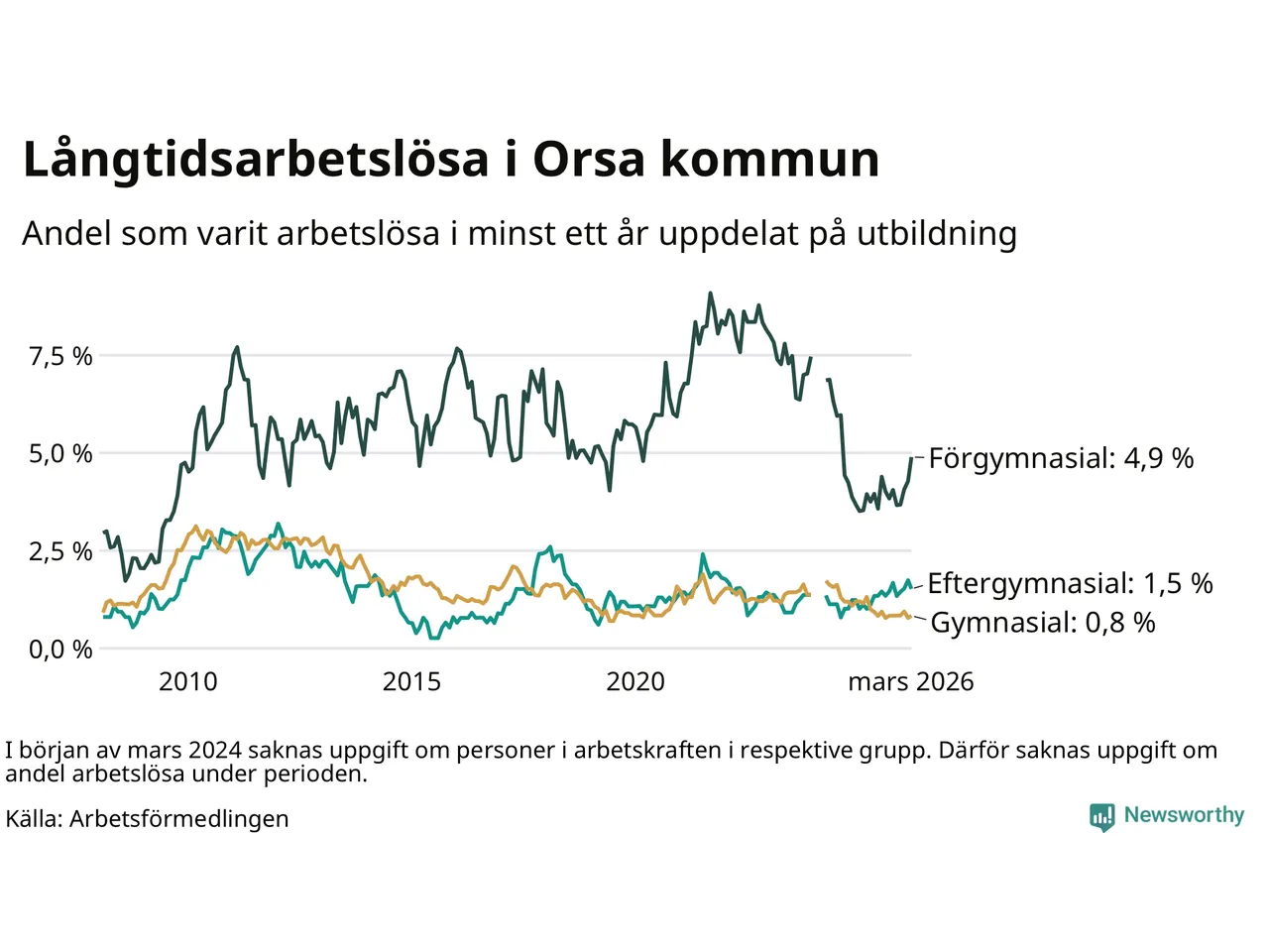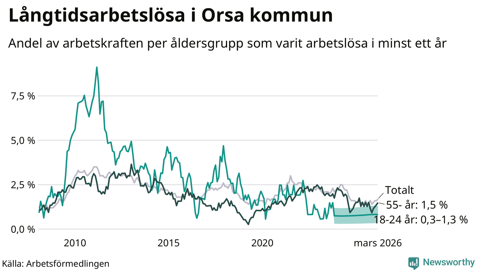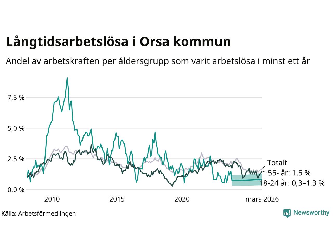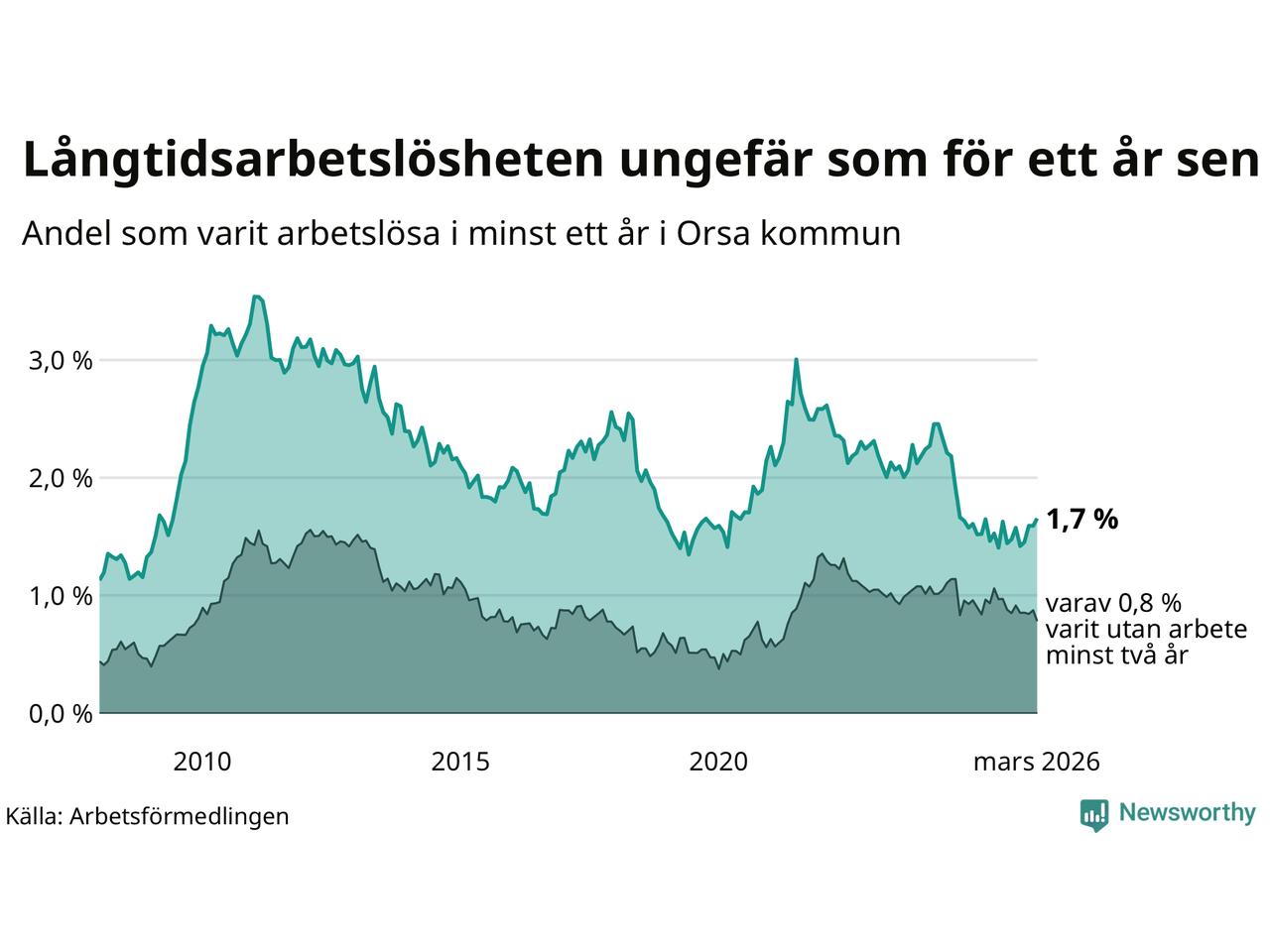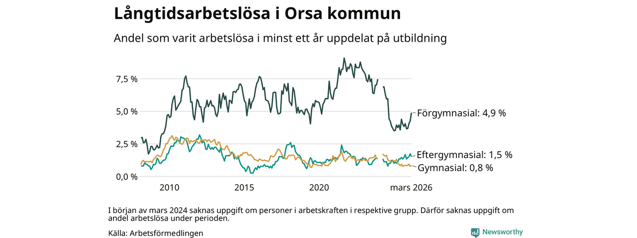 I mars hade 53 Orsabor varit arbetslösa i minst ett år, vilket är två fler än månaden innan. Det är den fjärde månaden i rad med ökande antal långtidsarbetslösa. 53 personer motsvarar 1,7 procent av arbetskraften i kommunen – andelen långtidsarbetslösa är ungefär på samma nivå som för ett år sedan.