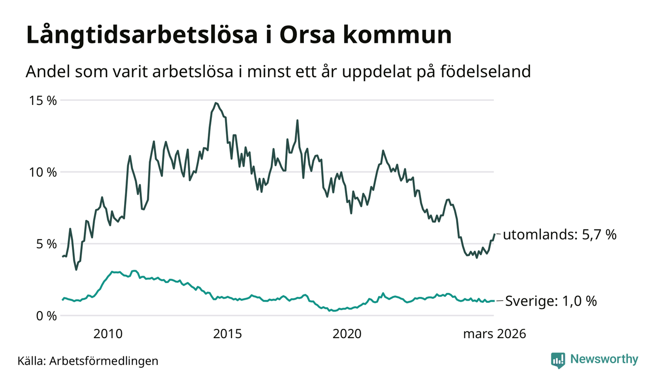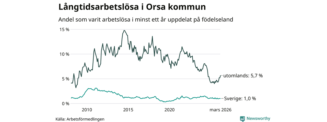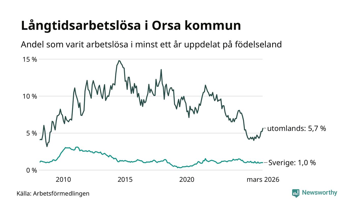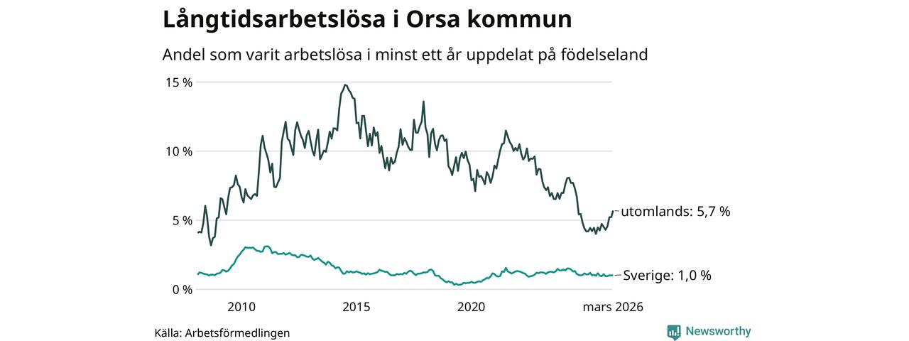 28 av de långtidsarbetslösa i Orsa är födda i Sverige, medan 25 är födda utomlands. Det innebär att långtidsarbetslösheten bland Sverigefödda är 1,0 procent, medan den är sex gånger så hög – 5,7 procent – bland födda utomlands. Även i riket som helhet är arbetslösheten högre bland utrikesfödda.