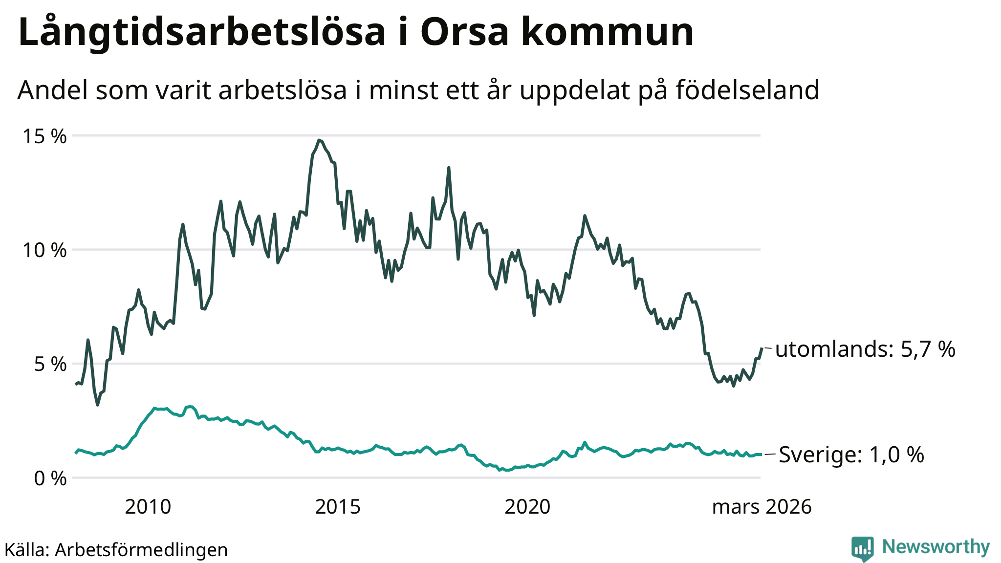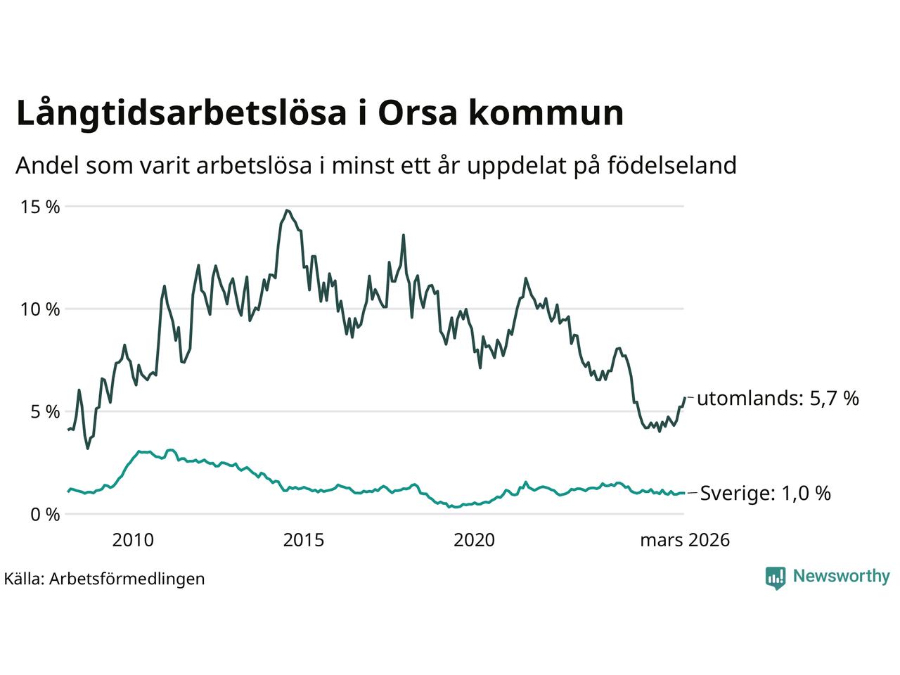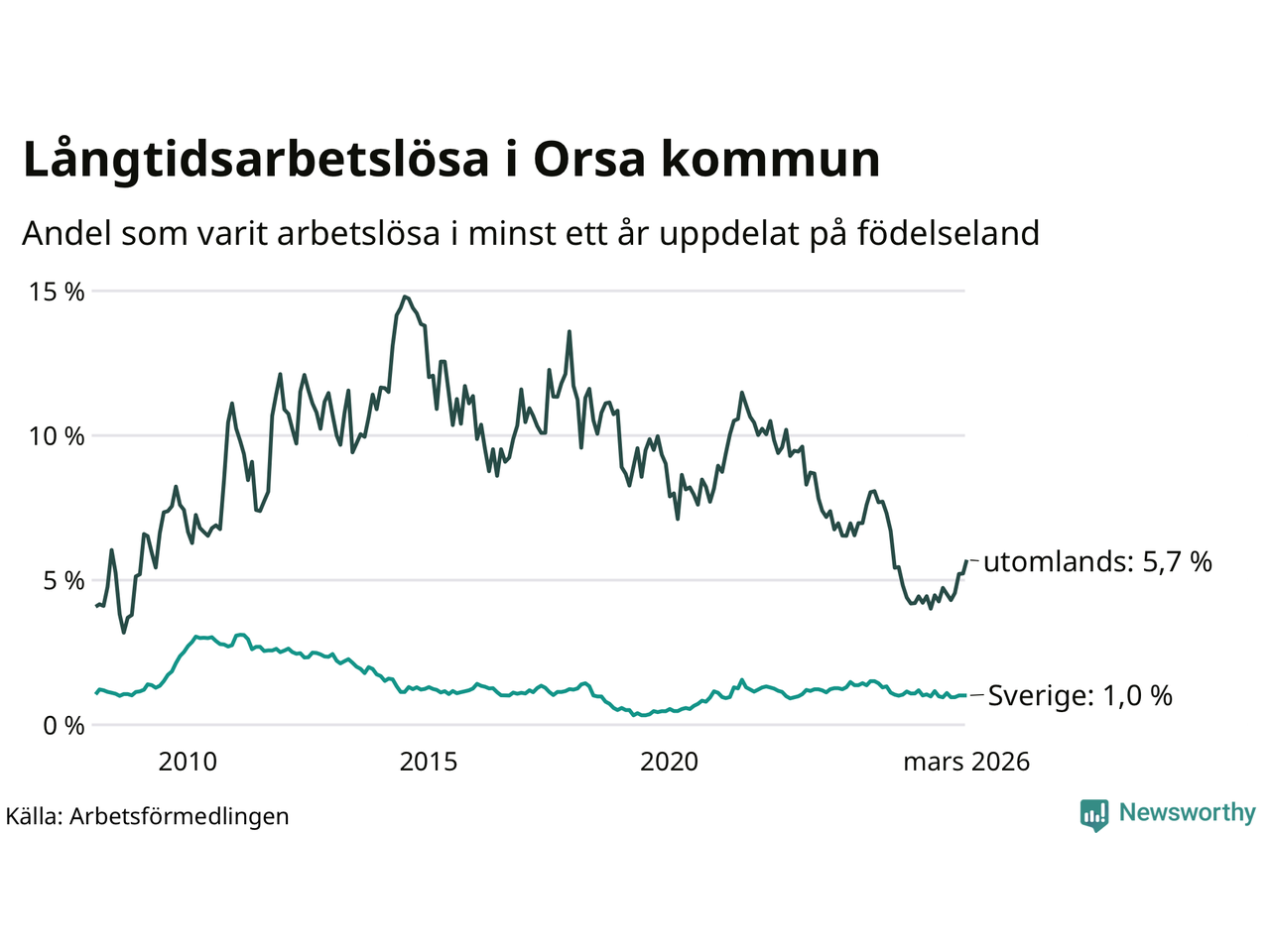 28 av de långtidsarbetslösa i Orsa är födda i Sverige, medan 25 är födda utomlands. Det innebär att långtidsarbetslösheten bland Sverigefödda är 1,0 procent, medan den är sex gånger så hög – 5,7 procent – bland födda utomlands. Även i riket som helhet är arbetslösheten högre bland utrikesfödda.