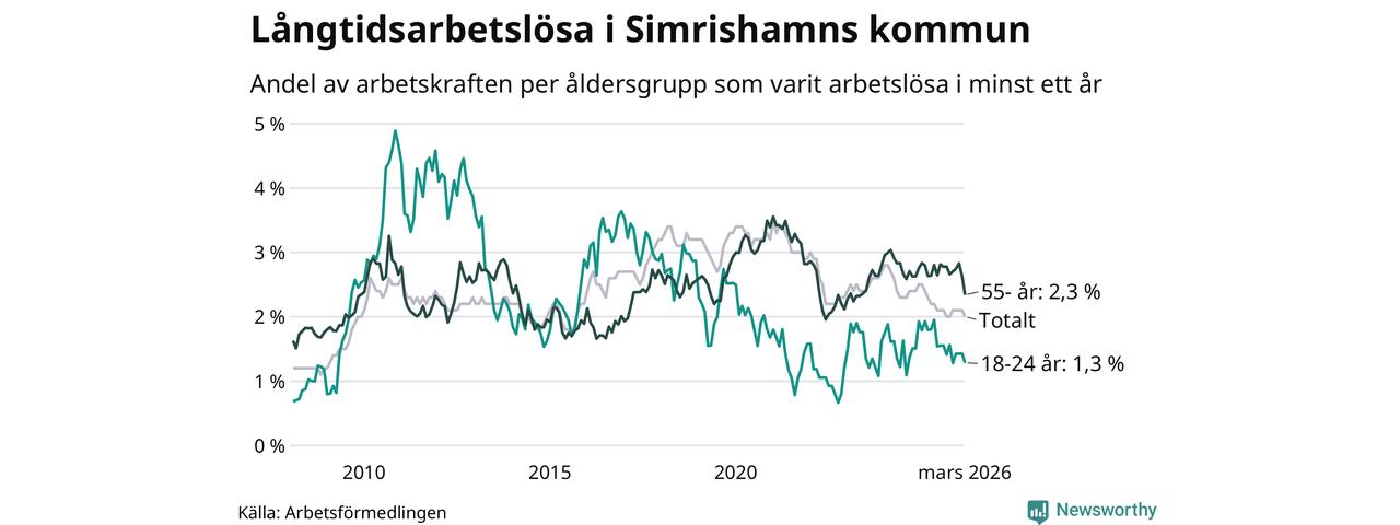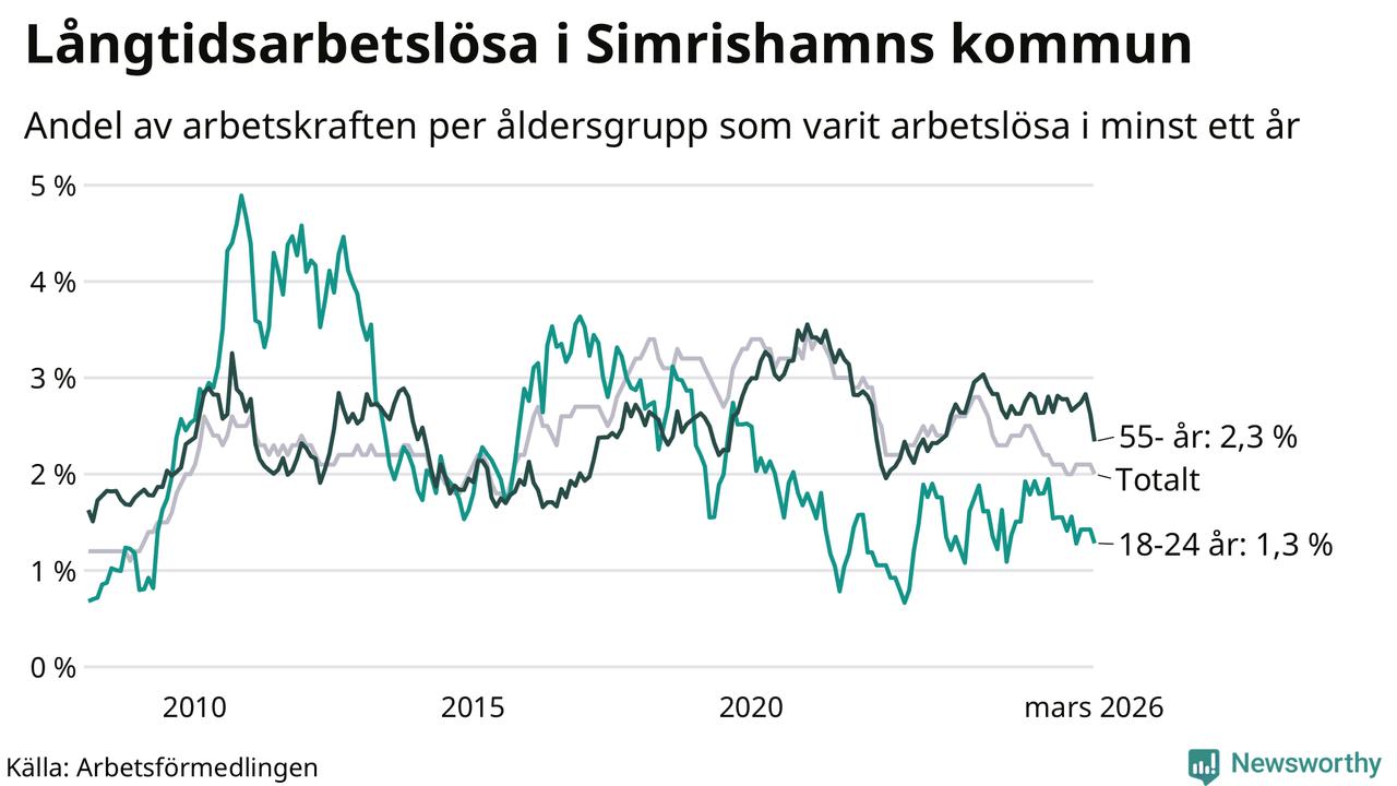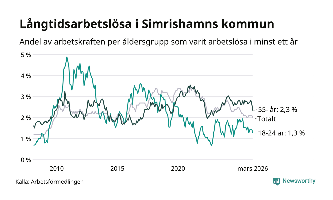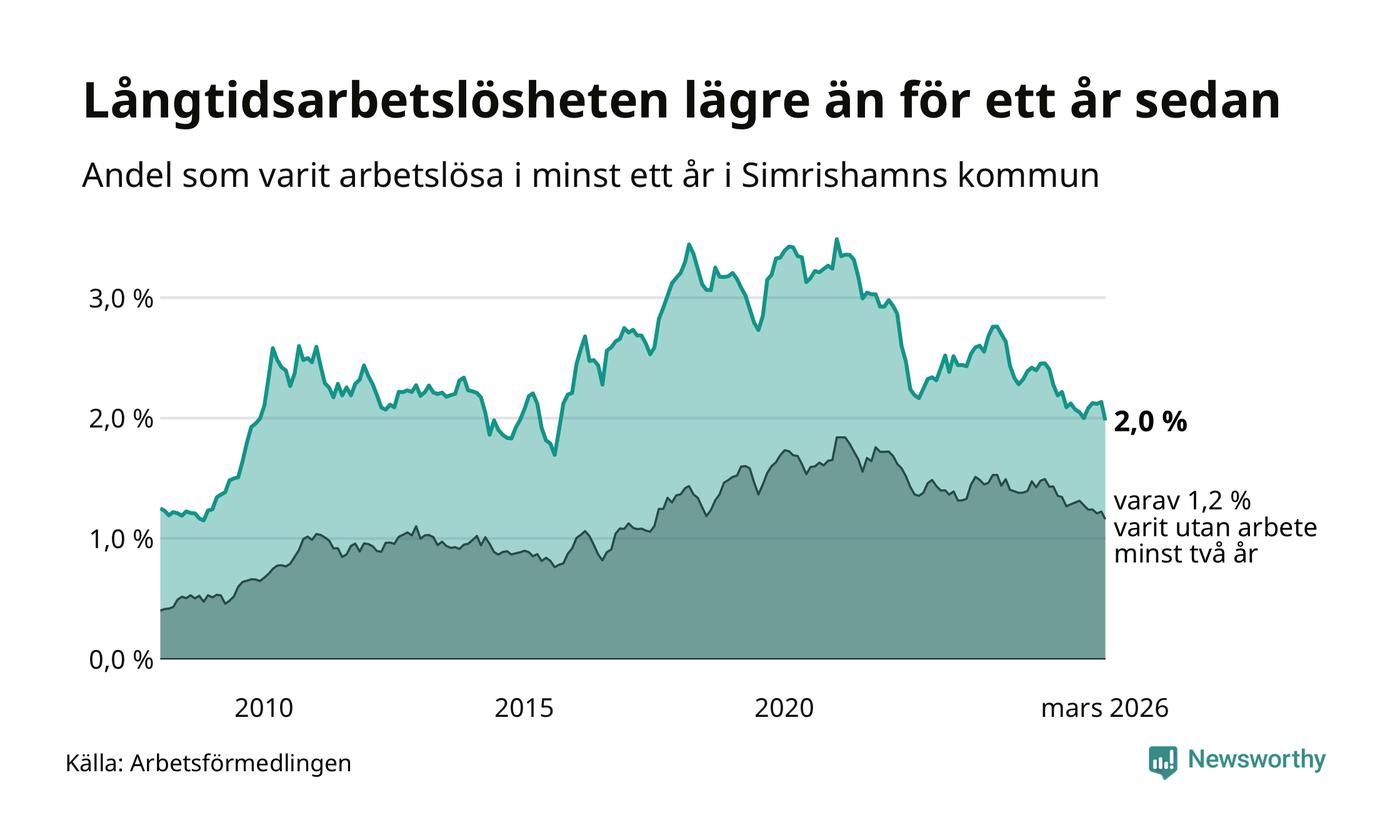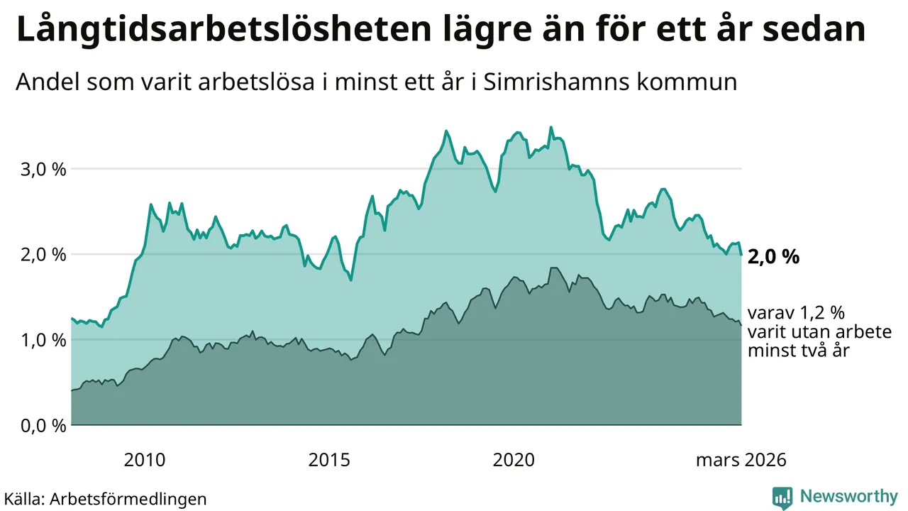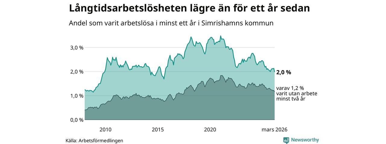 I mars hade 152 Simrishamnsbor varit arbetslösa i minst ett år, vilket är tolv färre än månaden innan. Det är den första månaden sedan oktober 2025 som antalet arbetslösa minskar. 152 personer motsvarar 2,0 procent av arbetskraften i kommunen – andelen långtidsarbetslösa är 0,3 procentenheter lägre än samma månad för ett år sedan.