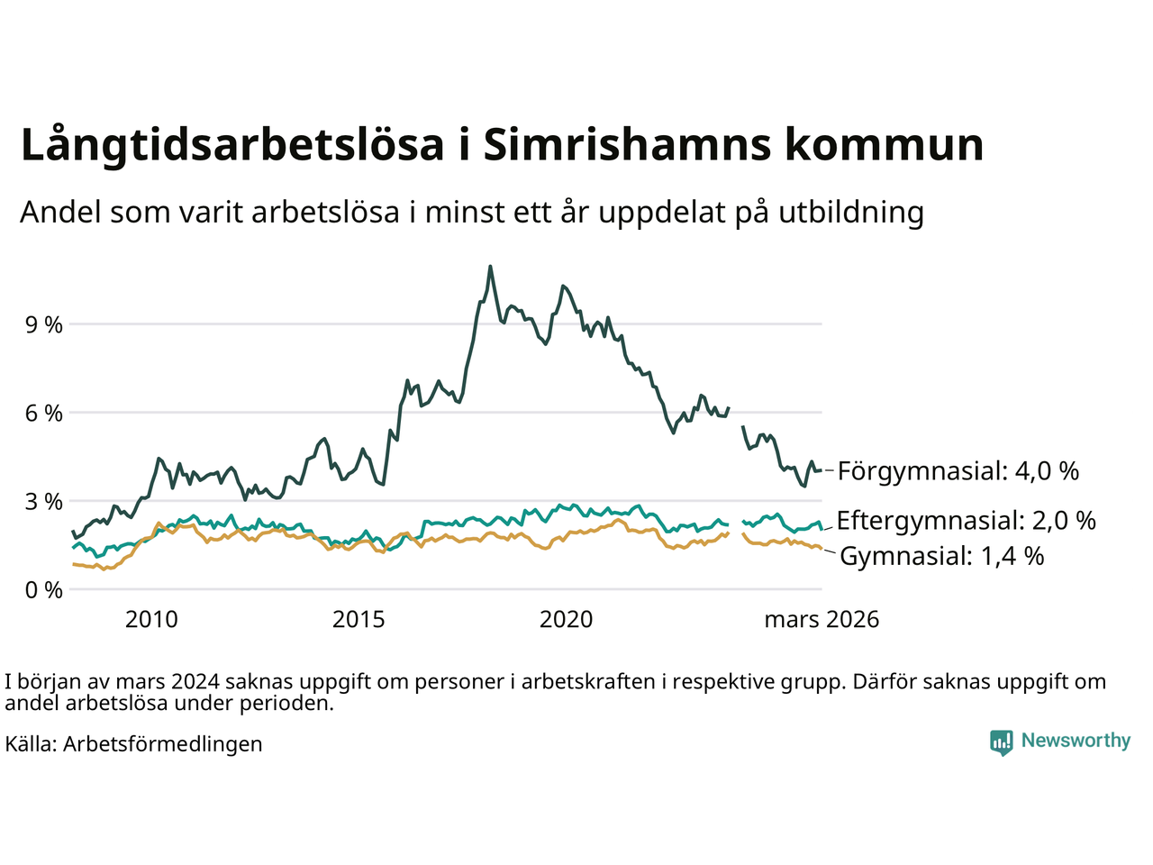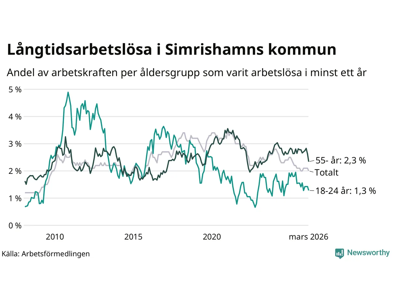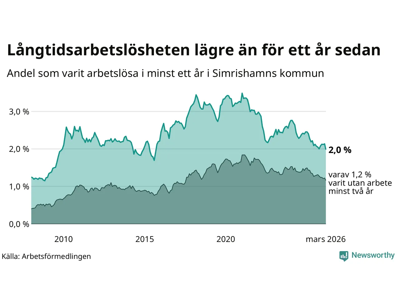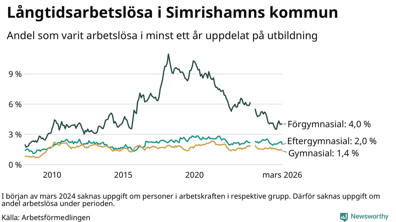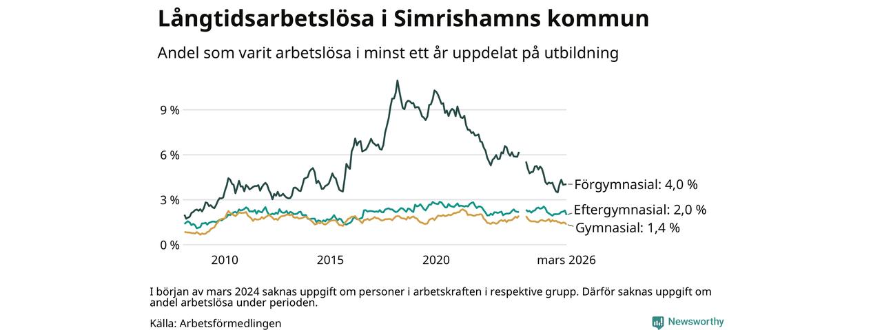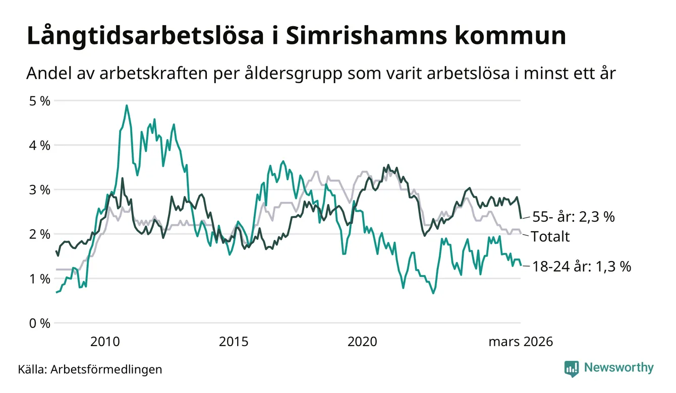 I mars hade 152 Simrishamnsbor varit arbetslösa i minst ett år, vilket är tolv färre än månaden innan. Det är den första månaden sedan oktober 2025 som antalet arbetslösa minskar. 152 personer motsvarar 2,0 procent av arbetskraften i kommunen – andelen långtidsarbetslösa är 0,3 procentenheter lägre än samma månad för ett år sedan.