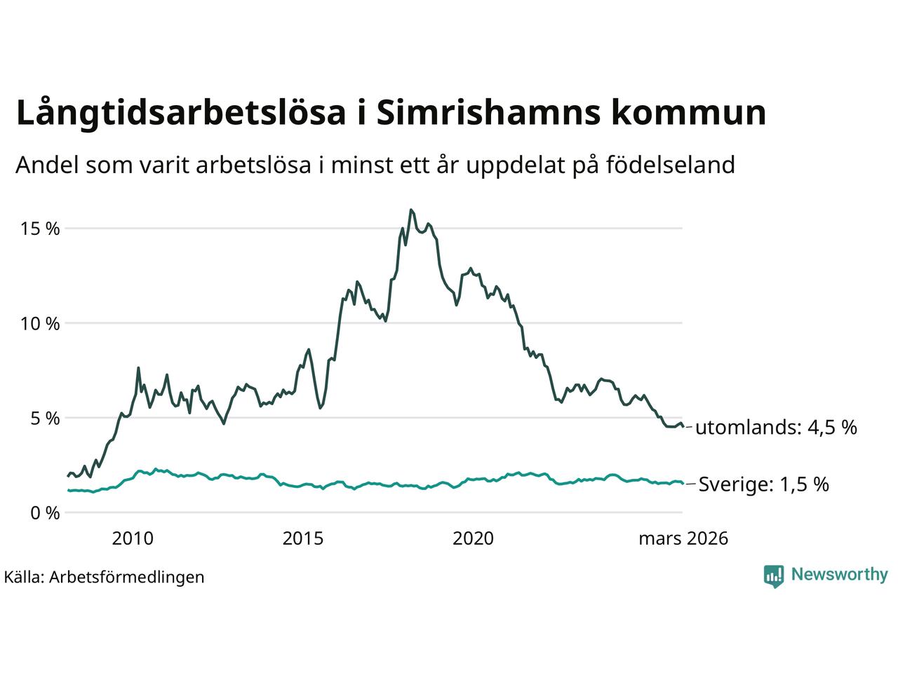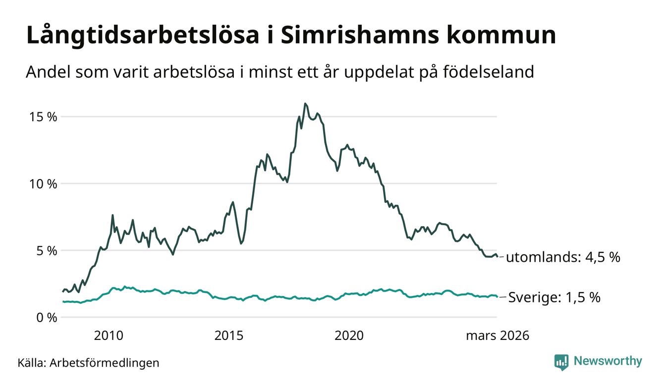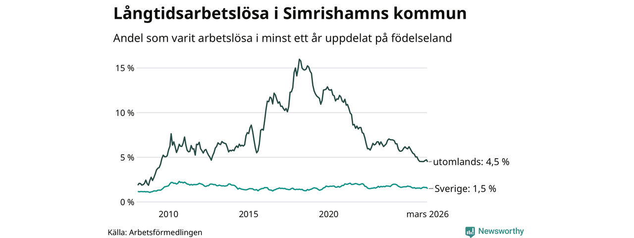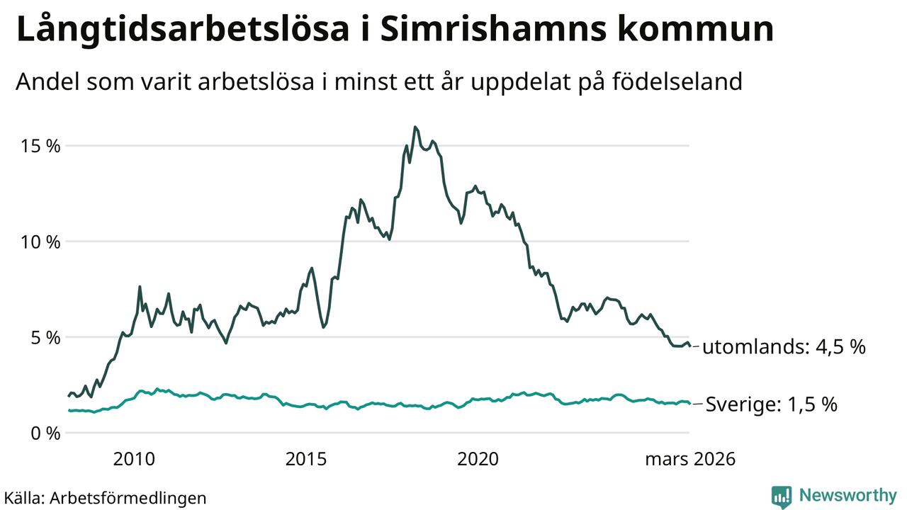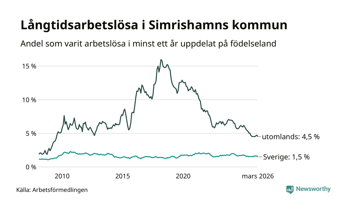 95 av de långtidsarbetslösa i Simrishamn är födda i Sverige, medan 57 är födda utomlands. Det innebär att långtidsarbetslösheten bland Sverigefödda är 1,5 procent, medan den är tre gånger så hög – 4,5 procent – bland födda utomlands. Även i riket som helhet är arbetslösheten högre bland utrikesfödda.