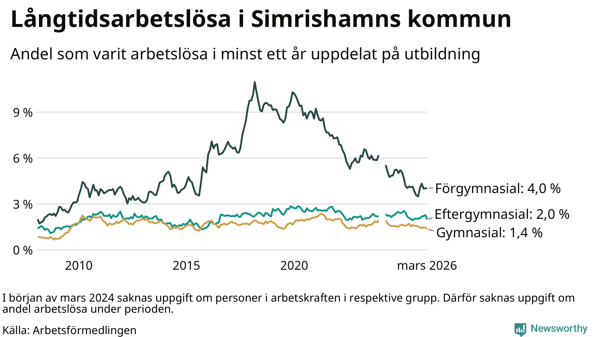 | Andel arbetslösa i minst ett år | 2,0 % | 3,9 % | 2,9 % |