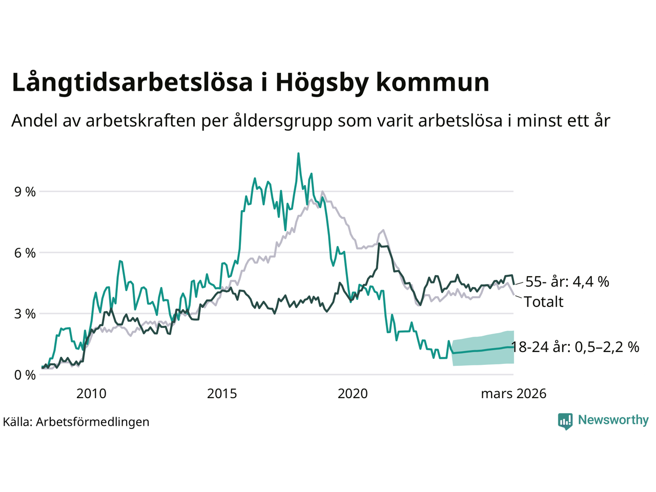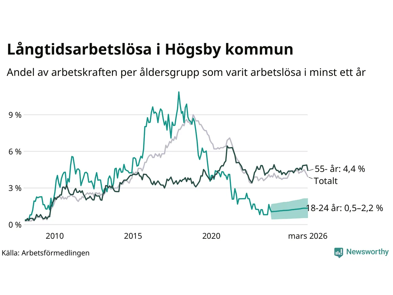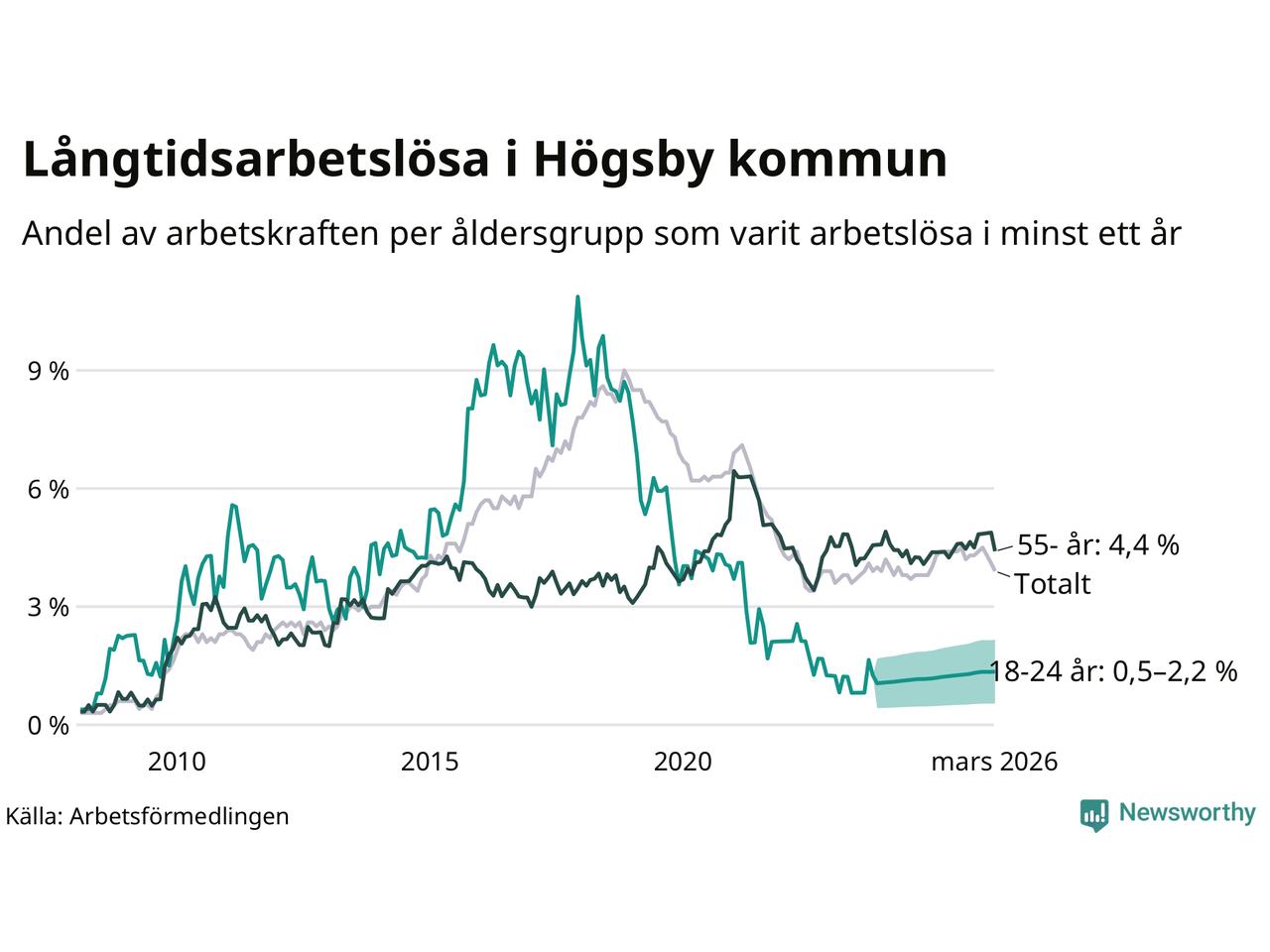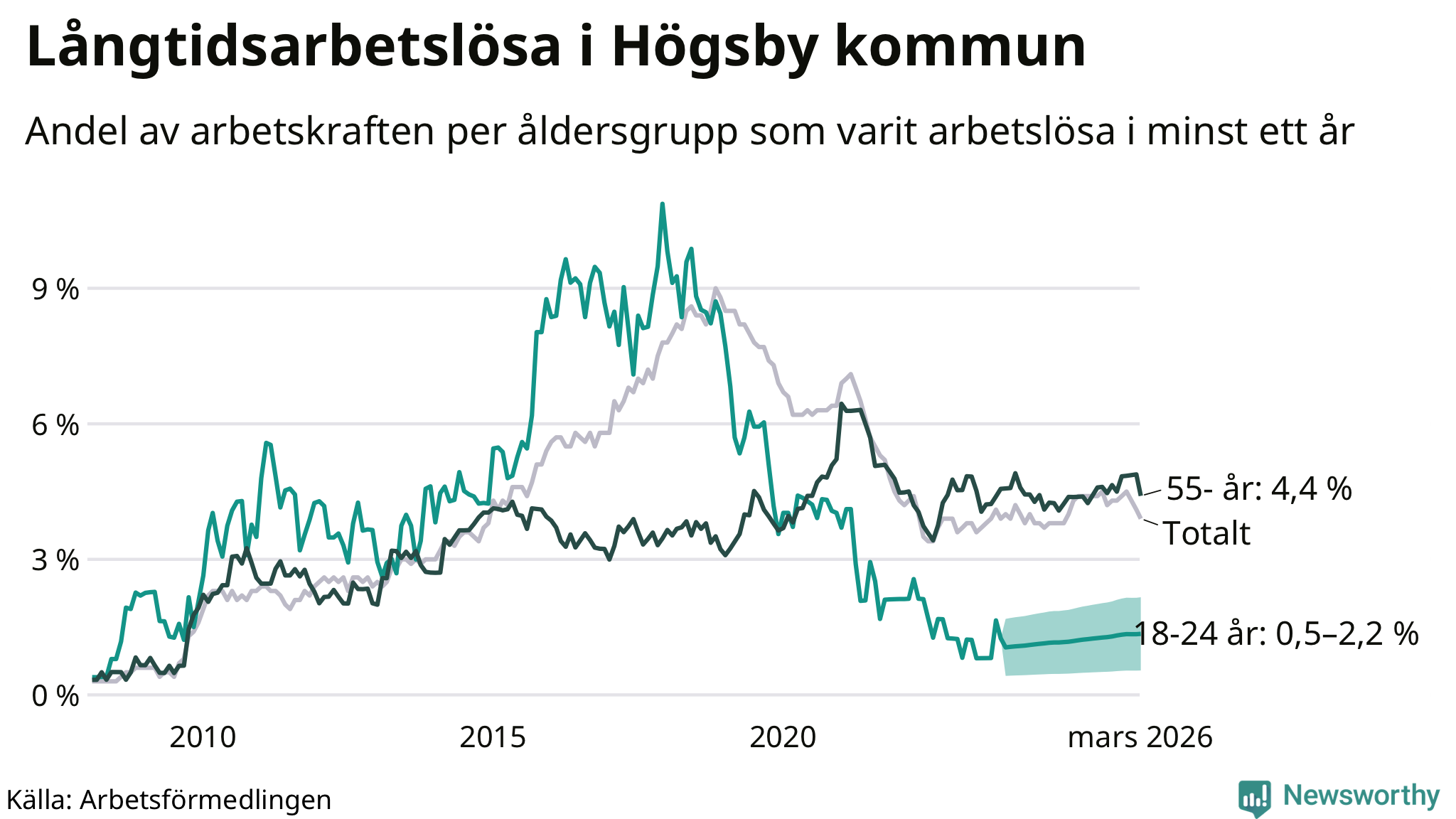 Graf: Andel arbetslösa uppdelat i åldersgrupper i Högsby