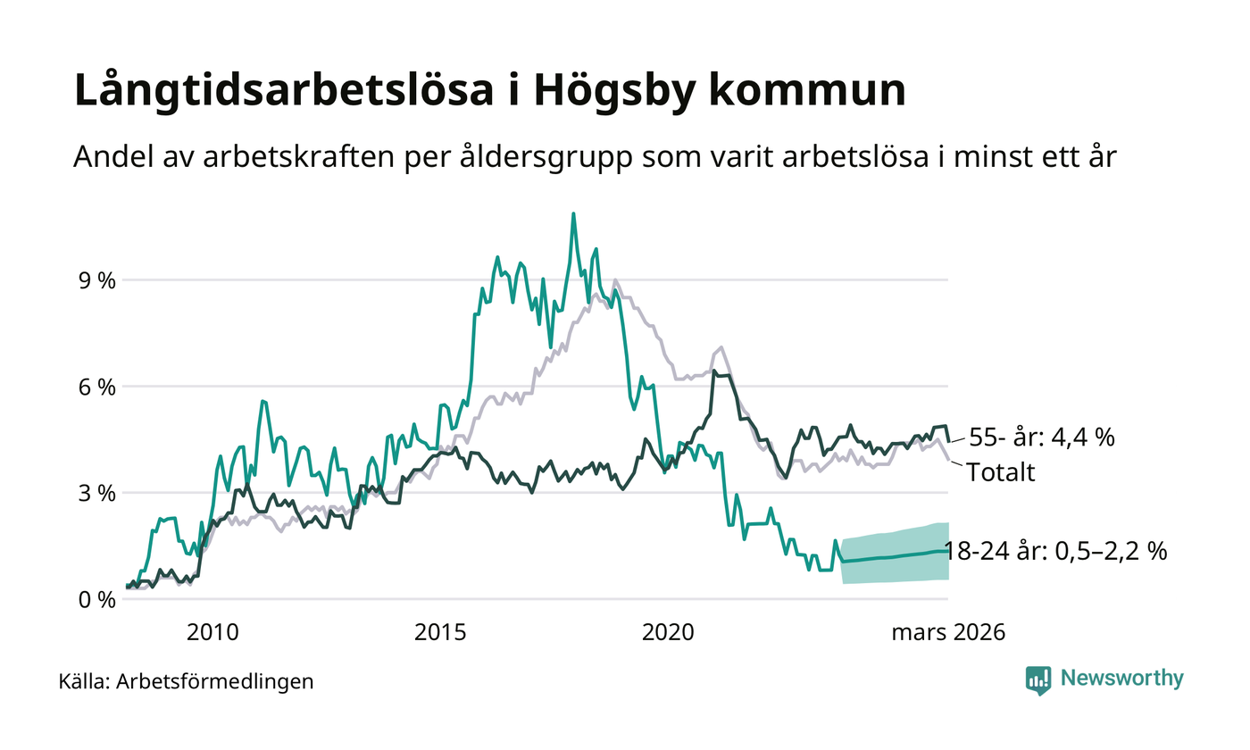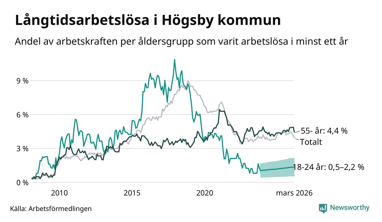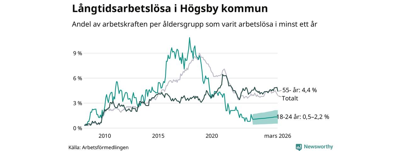 Av de 84 personerna som varit arbetslösa i mer än ett år i Högsby kommun är 27 personer mellan 55 och 661 år och mellan en och fyra är mellan 18 och 24 år. För den äldre gruppen är andelen arbetslösa 4,4 procent medan den i den yngre gruppen är mellan 0,5 och 2,2 procent. Även i riket som helhet är långtidsarbetslösheten högre i gruppen äldre.