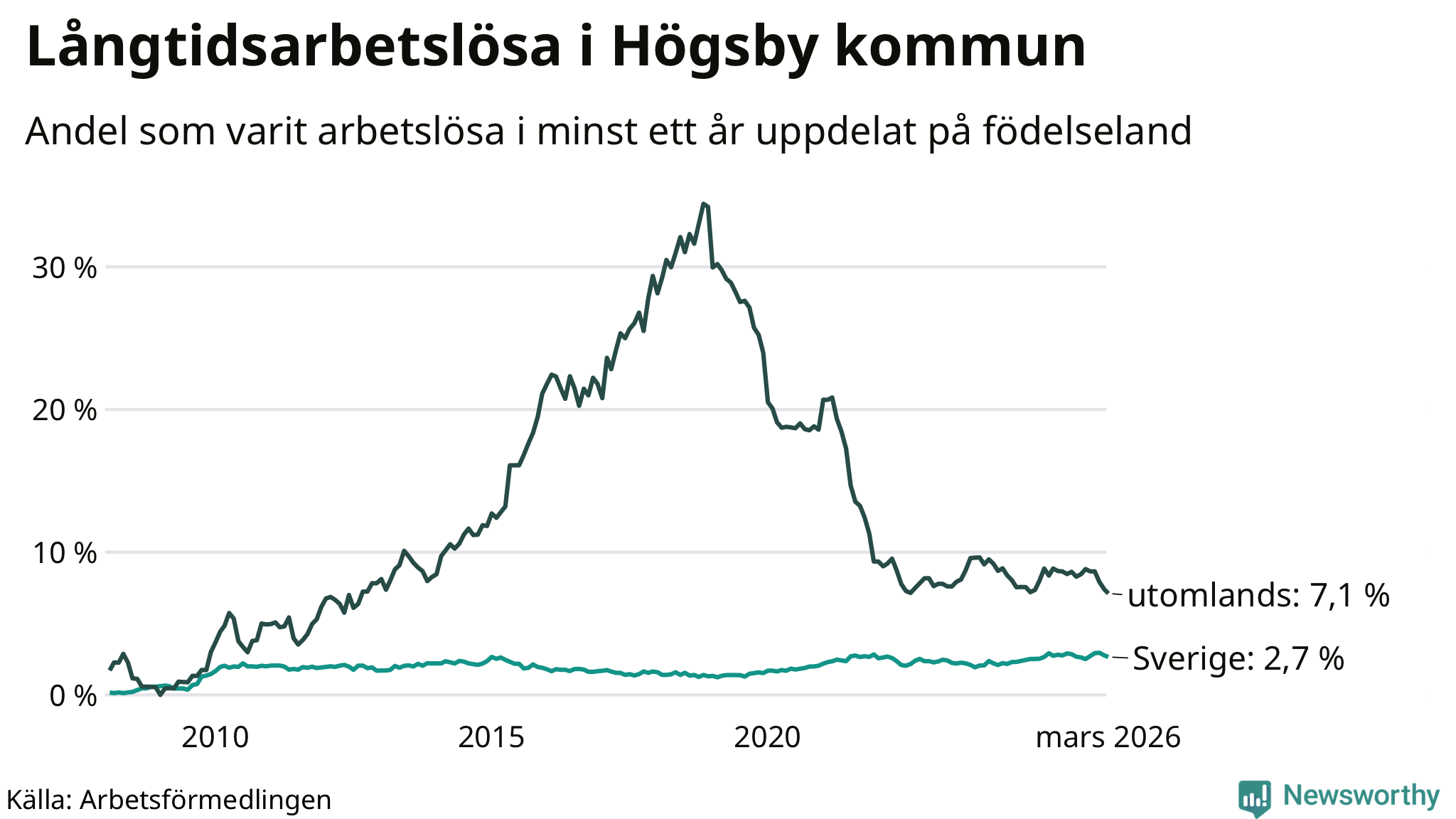 Graf: Andel arbetslösa uppdelat på födelseland i Högsby
