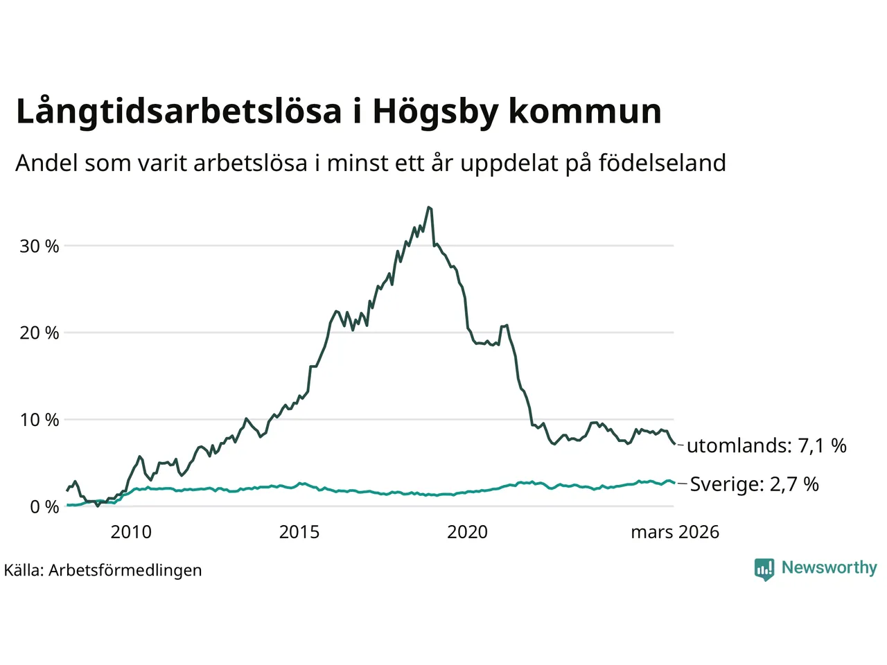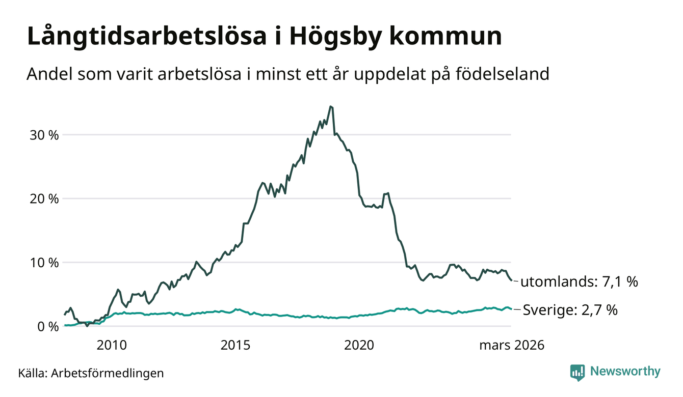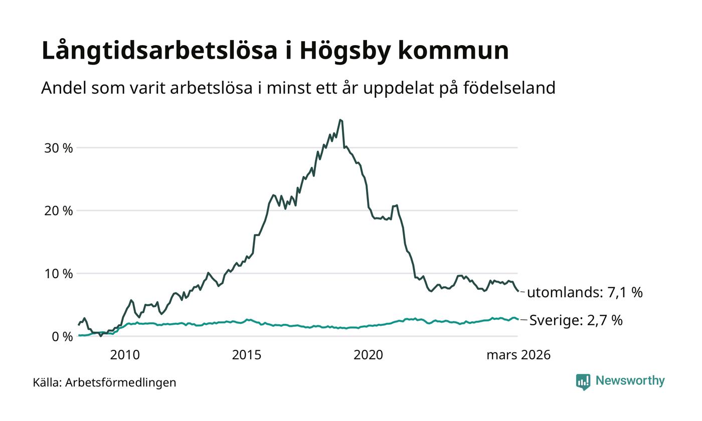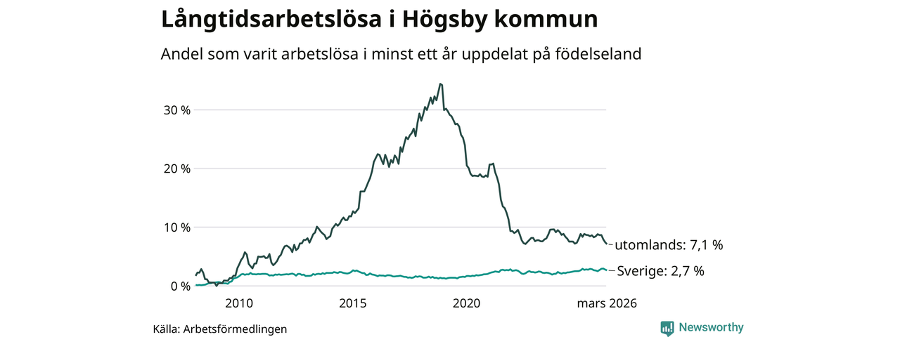 41 av de långtidsarbetslösa i Högsby är födda i Sverige, medan 43 är födda utomlands. Det innebär att långtidsarbetslösheten bland Sverigefödda är 2,7 procent, medan den är tre gånger så hög – 7,1 procent – bland födda utomlands. Även i riket som helhet är arbetslösheten högre bland utrikesfödda.