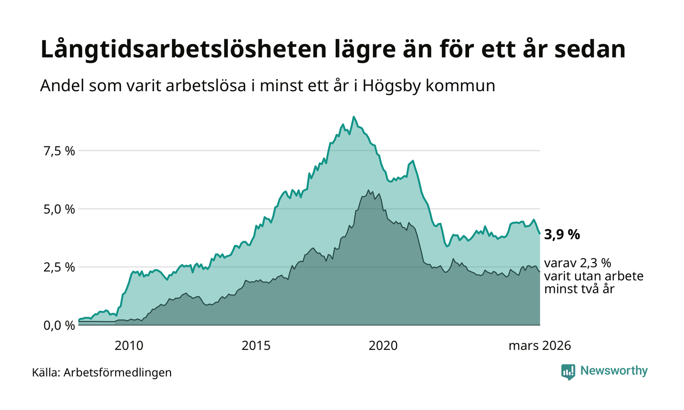 I mars hade 84 Högsbybor varit arbetslösa i minst ett år, vilket är fyra färre än månaden innan. 84 personer motsvarar 3,9 procent av arbetskraften i kommunen – andelen långtidsarbetslösa är 0,5 procentenheter lägre än samma månad för ett år sedan.