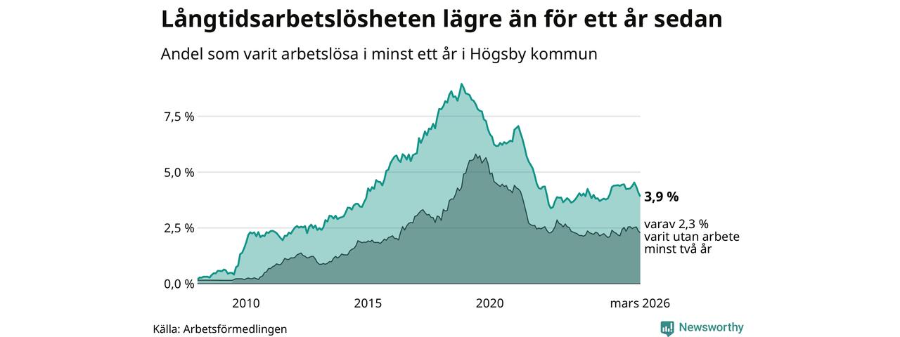 Andelen långtidsarbetslösa i Högsby är den näst högsta i Kalmar län, bara i Nybro är andelen högre 4,0 procent.I Mörbylånga finns länets lägsta långtidsarbetslöshet, 1,1 procent. I Kalmar län som helhet hade 3 102 personer (2,7 procent) varit arbetslösa i minst ett år i mars. Det är 28 personer färre än månaden innan.