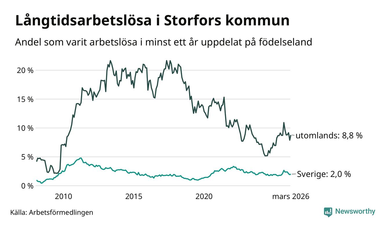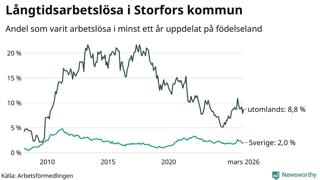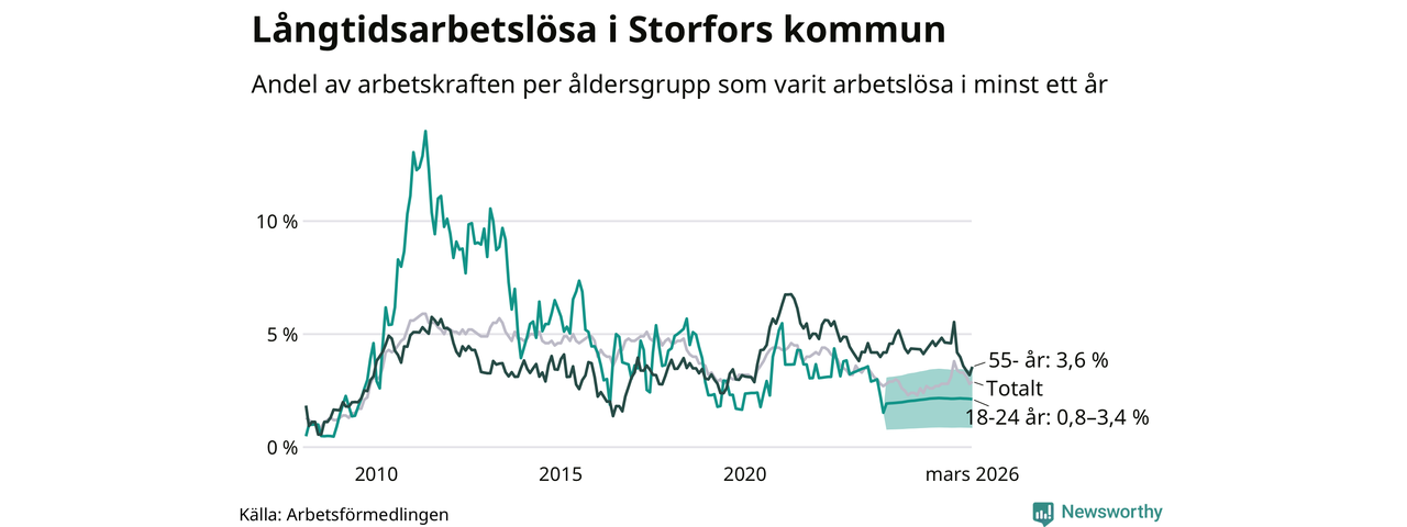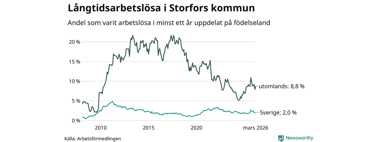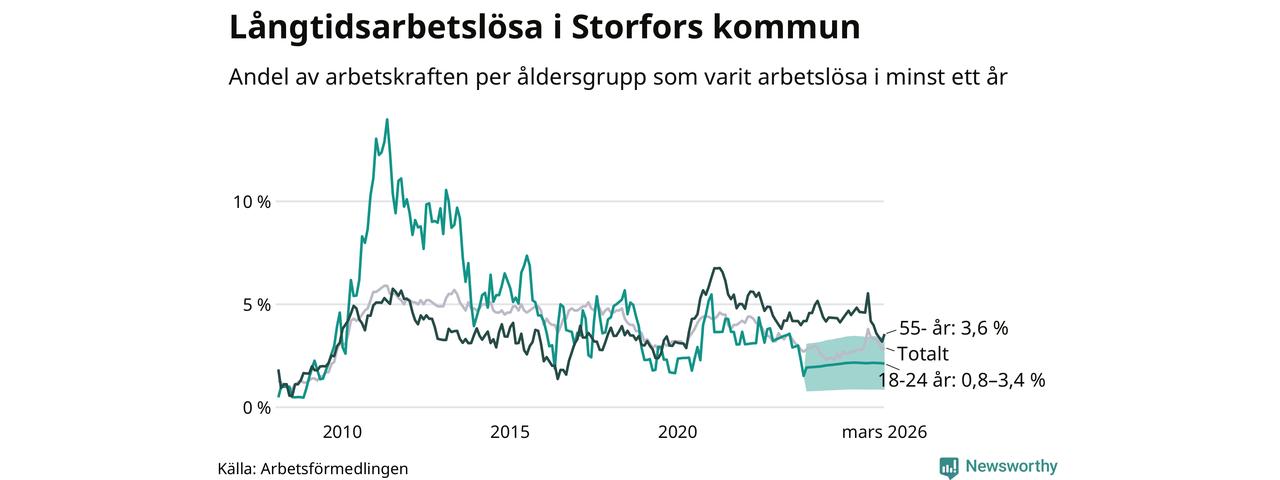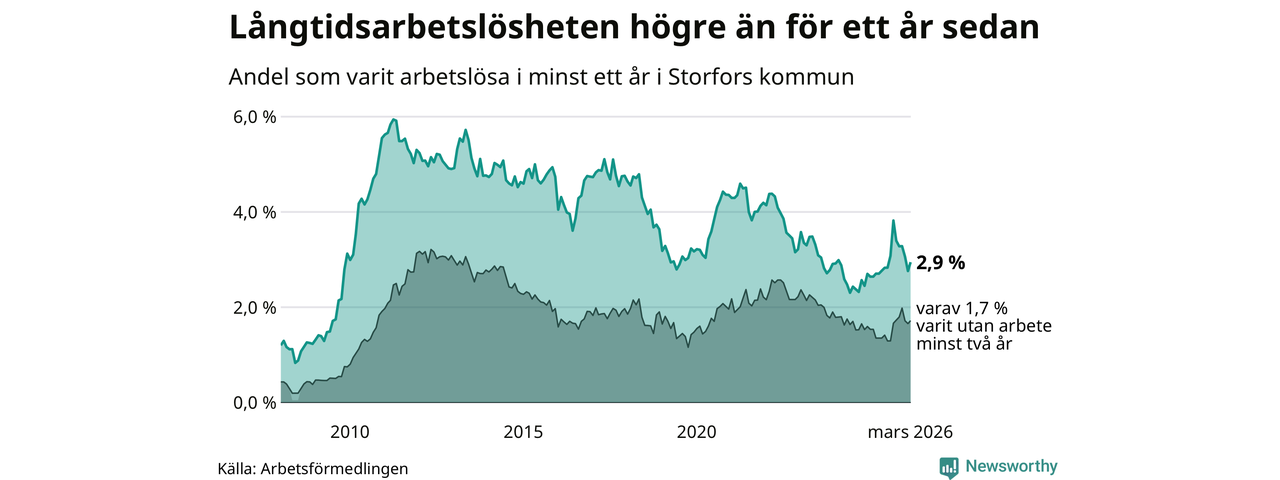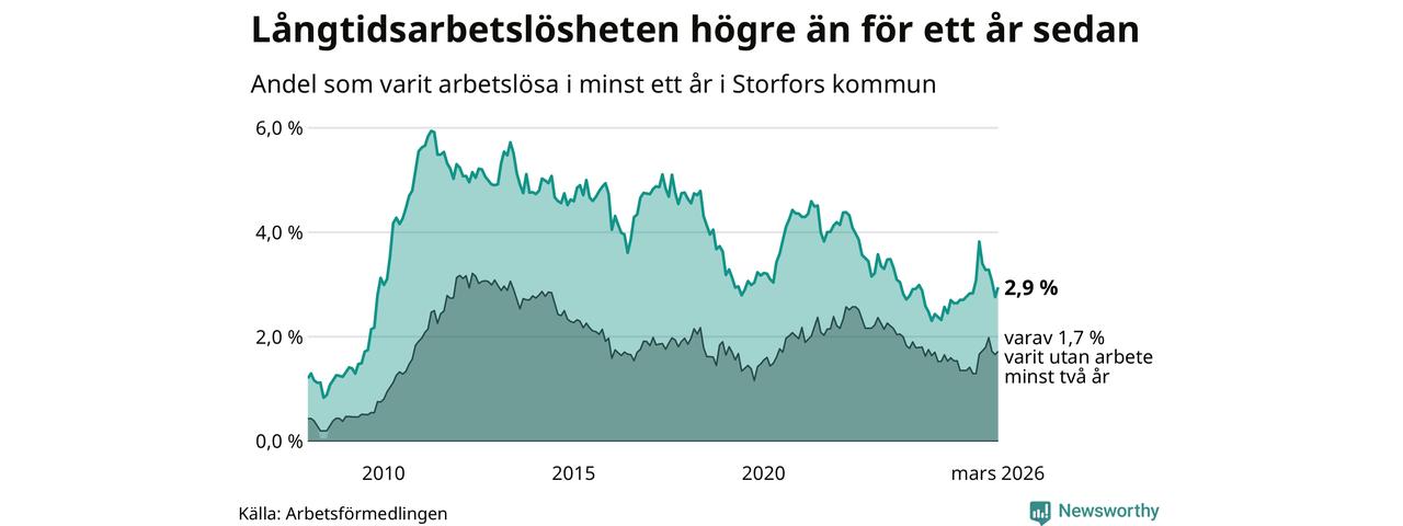 I mars hade 48 Storforsbor varit arbetslösa i minst ett år, vilket är tre fler än månaden innan. Det är den första månaden sedan september 2025 som antalet arbetslösa ökar. 48 personer motsvarar 2,9 procent av arbetskraften i kommunen – andelen långtidsarbetslösa är 0,2 procentenheter högre än samma månad för ett år sedan.