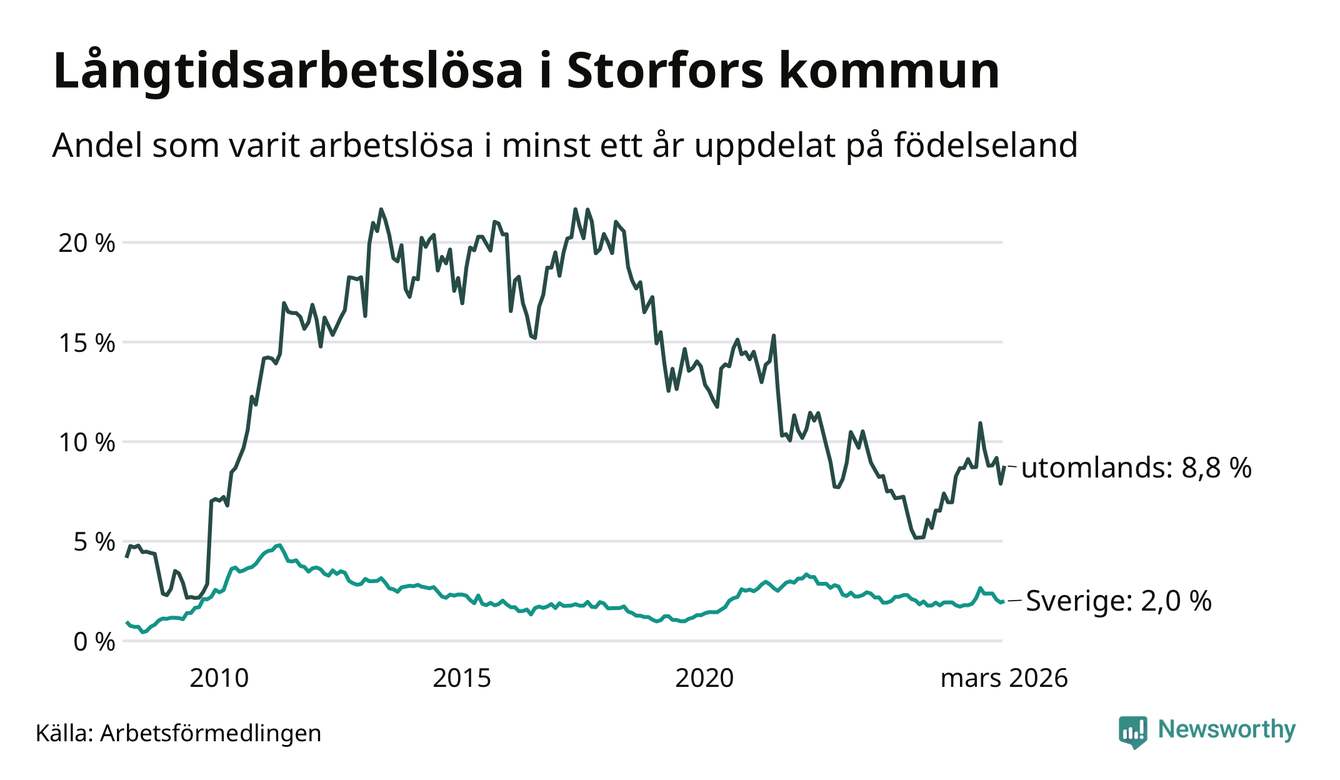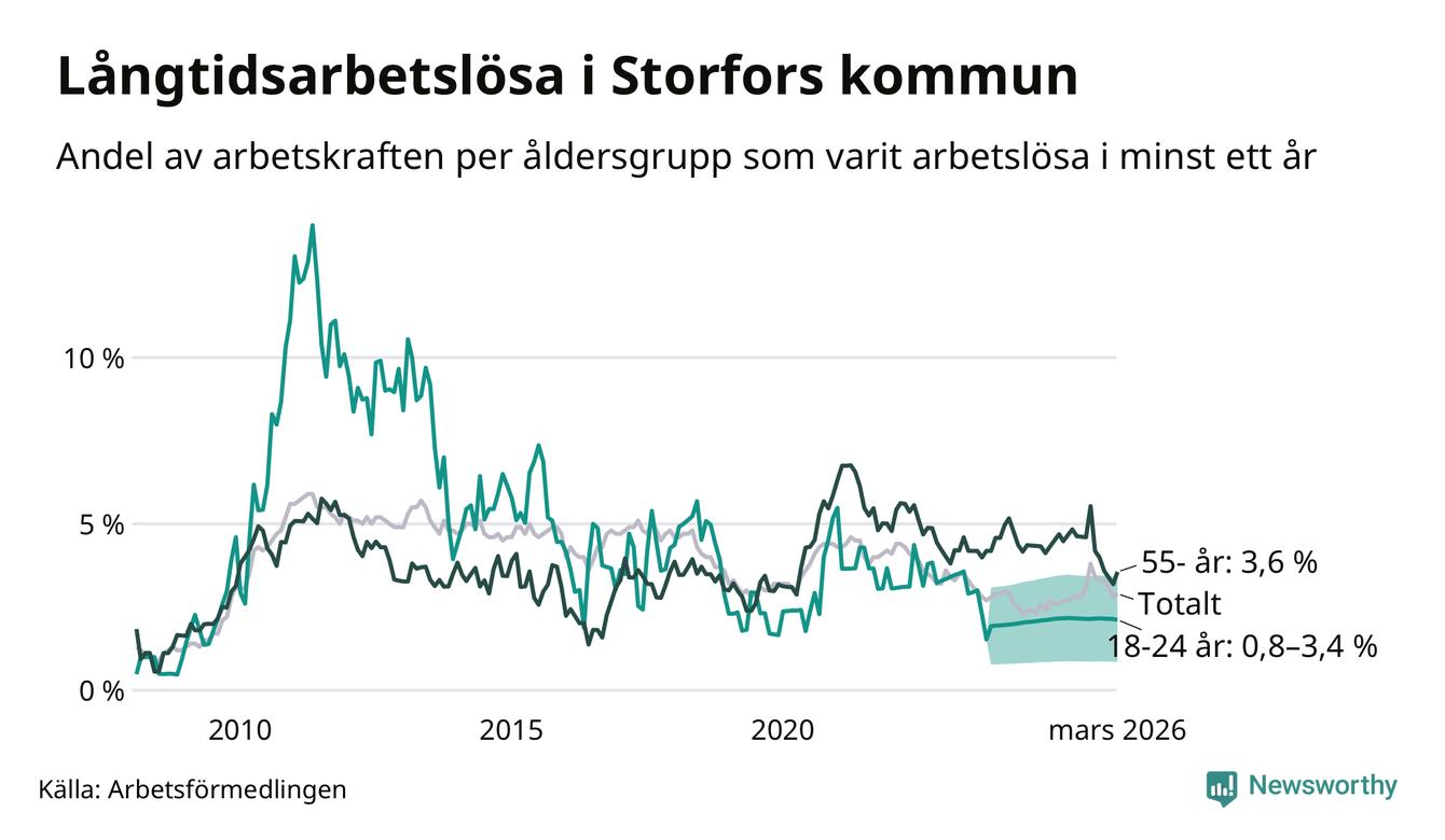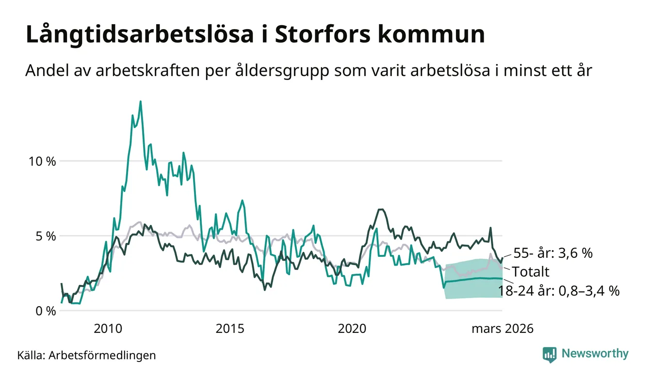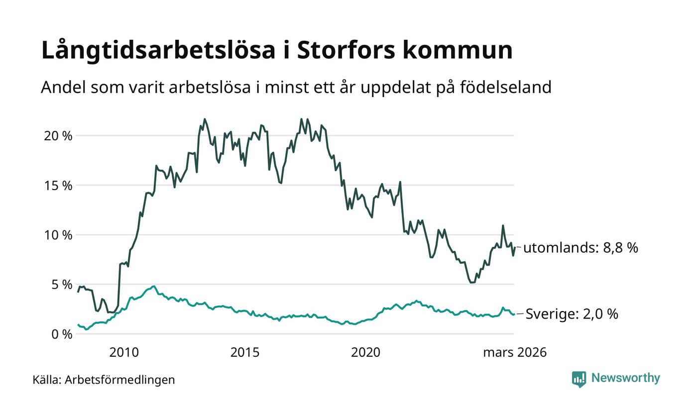 I mars hade 48 Storforsbor varit arbetslösa i minst ett år, vilket är tre fler än månaden innan. Det är den första månaden sedan september 2025 som antalet arbetslösa ökar. 48 personer motsvarar 2,9 procent av arbetskraften i kommunen – andelen långtidsarbetslösa är 0,2 procentenheter högre än samma månad för ett år sedan.