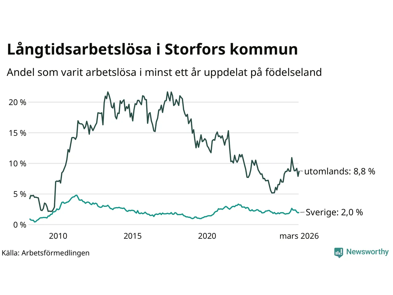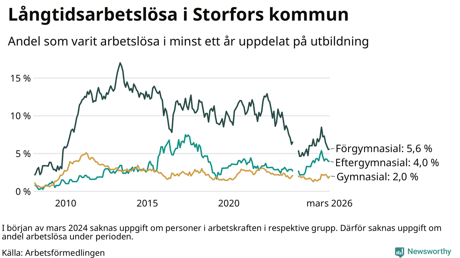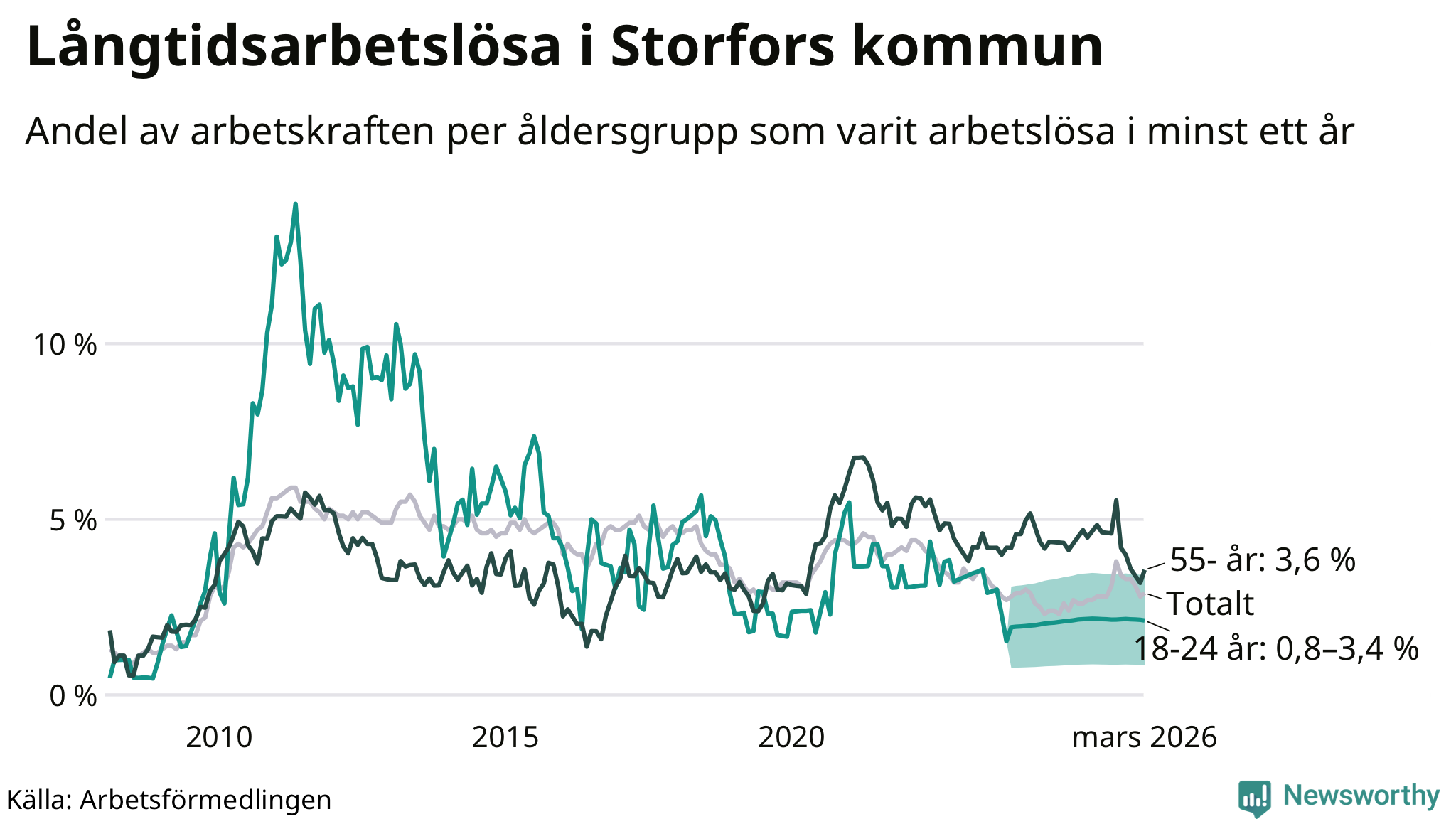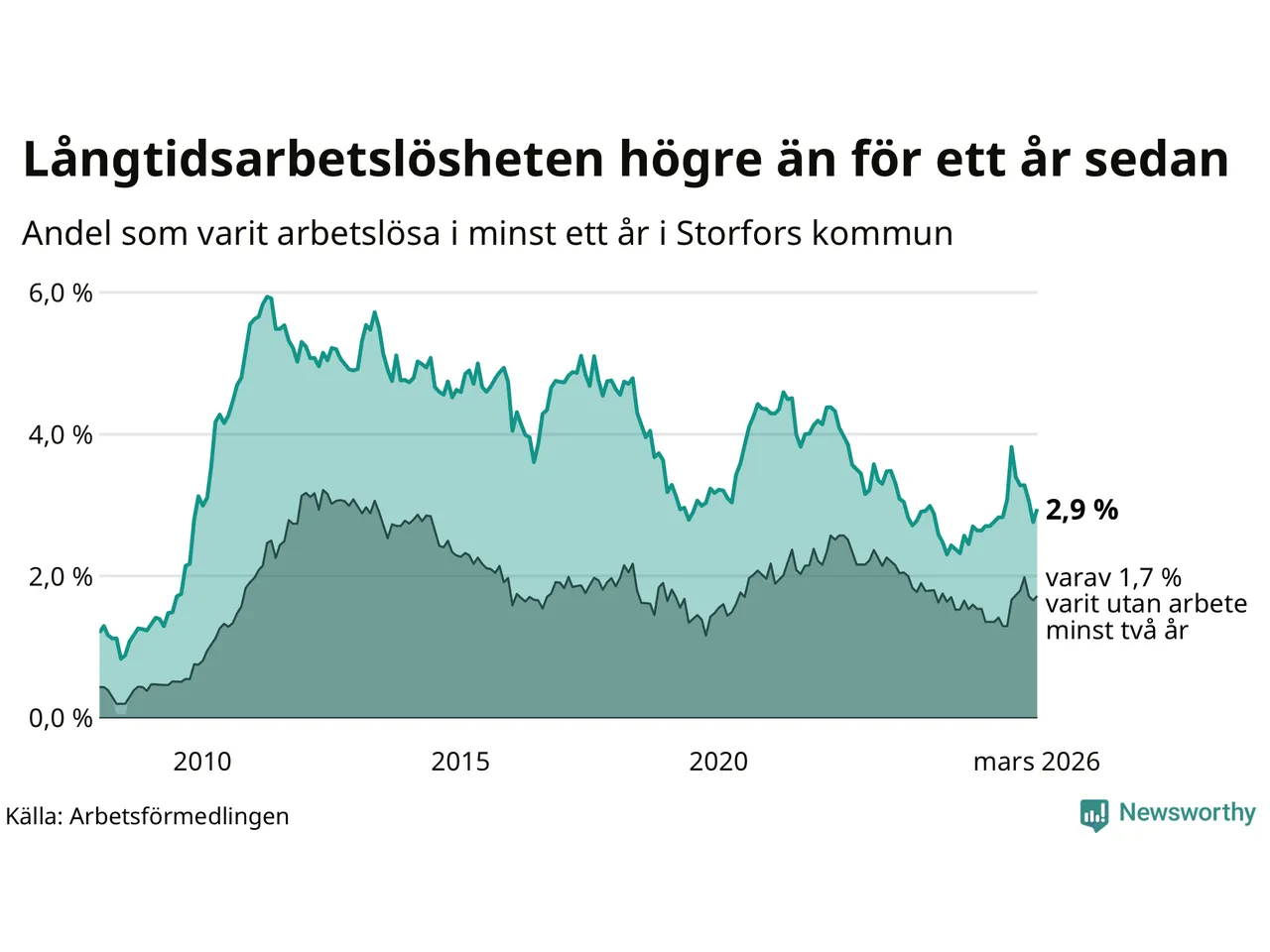 I mars hade 48 Storforsbor varit arbetslösa i minst ett år, vilket är tre fler än månaden innan. Det är den första månaden sedan september 2025 som antalet arbetslösa ökar. 48 personer motsvarar 2,9 procent av arbetskraften i kommunen – andelen långtidsarbetslösa är 0,2 procentenheter högre än samma månad för ett år sedan.