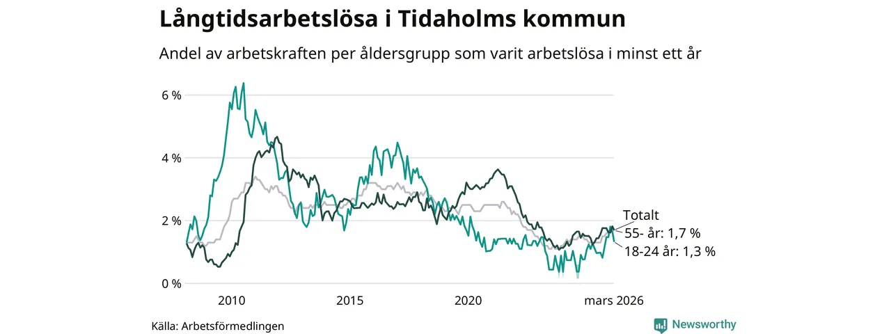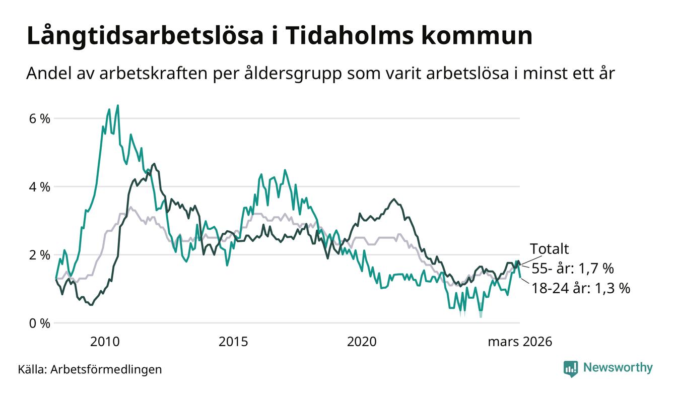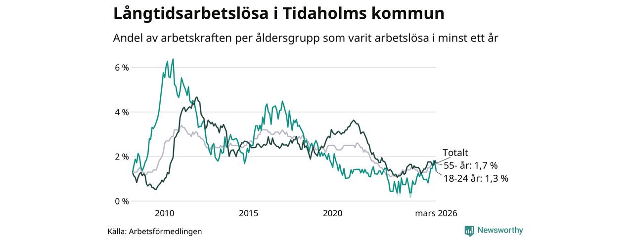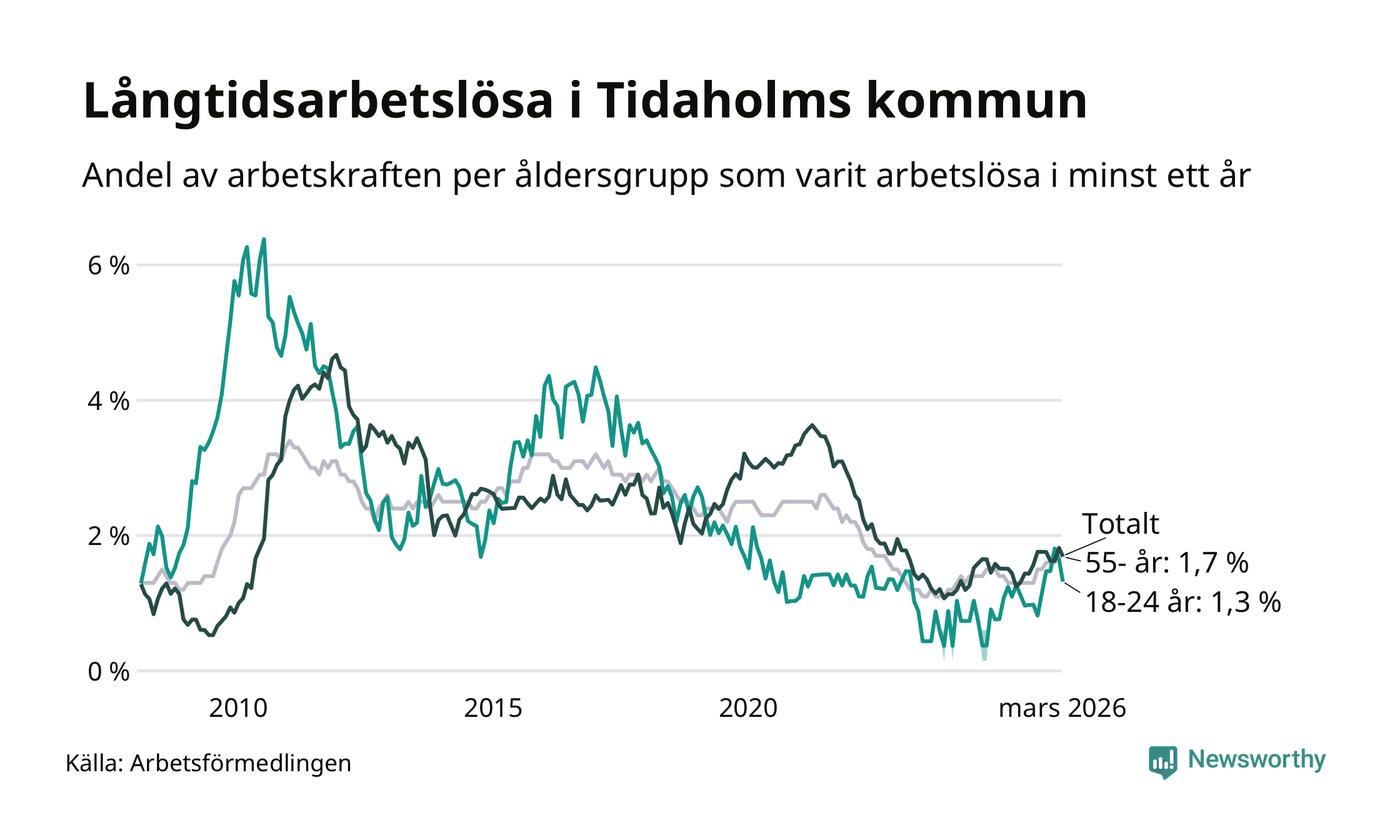 Av de 106 personerna som varit arbetslösa i mer än ett år i Tidaholms kommun är 26 personer mellan 55 och 661 år och åtta är mellan 18 och 24 år. För den äldre gruppen är andelen arbetslösa 1,7 procent medan den i den yngre gruppen är 1,3 procent. Även i riket som helhet är långtidsarbetslösheten högre i gruppen äldre.