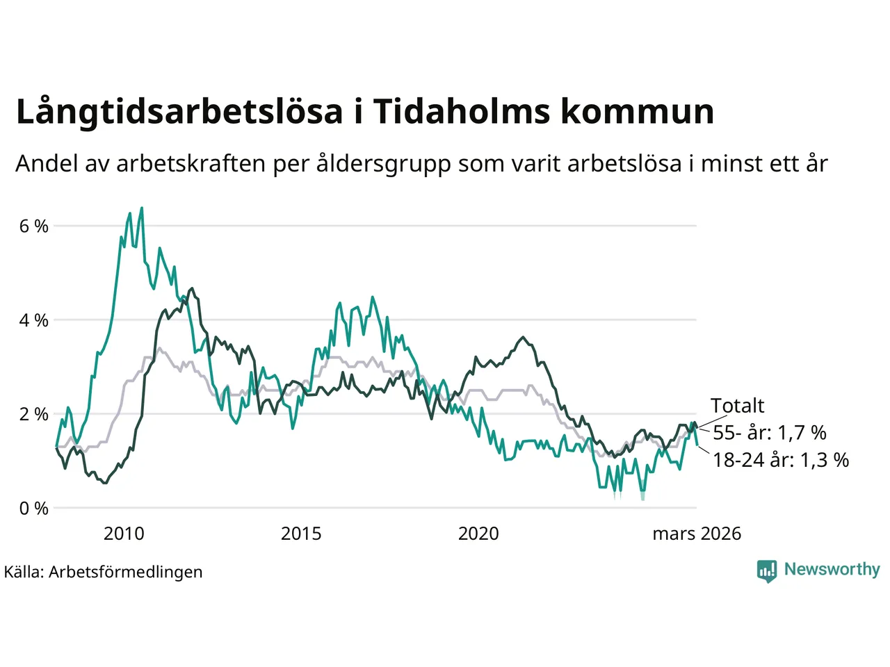| Andel arbetslösa i minst två år | 0,7 % | 1,3 % | 1,6 % |