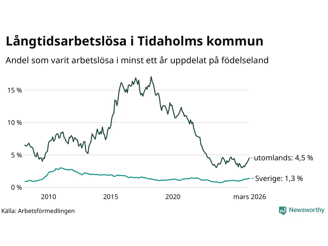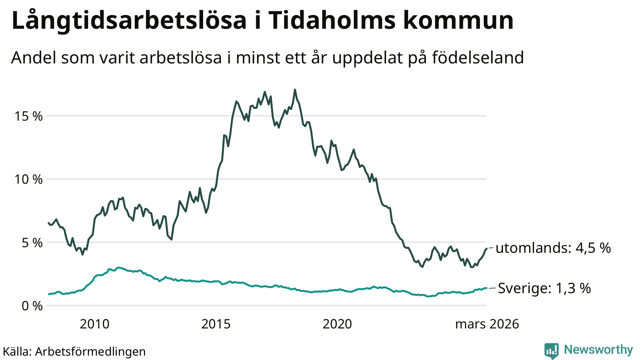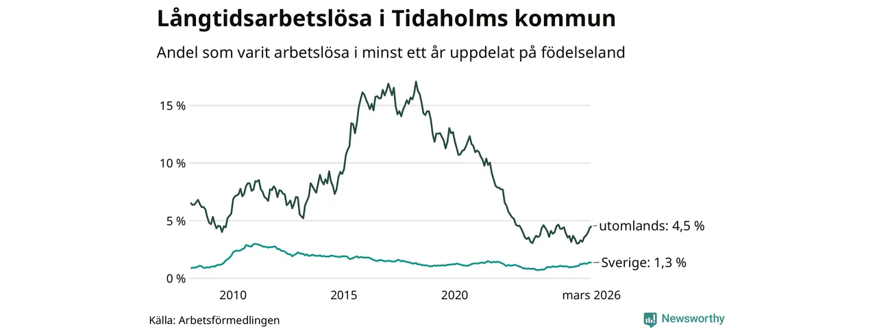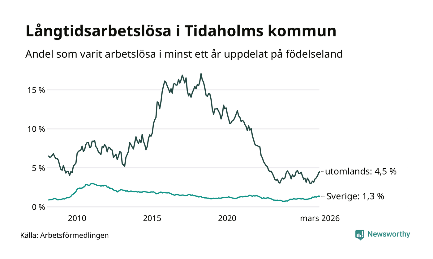 72 av de långtidsarbetslösa i Tidaholm är födda i Sverige, medan 34 är födda utomlands. Det innebär att långtidsarbetslösheten bland Sverigefödda är 1,3 procent, medan den är tre gånger så hög – 4,5 procent – bland födda utomlands. Även i riket som helhet är arbetslösheten högre bland utrikesfödda.