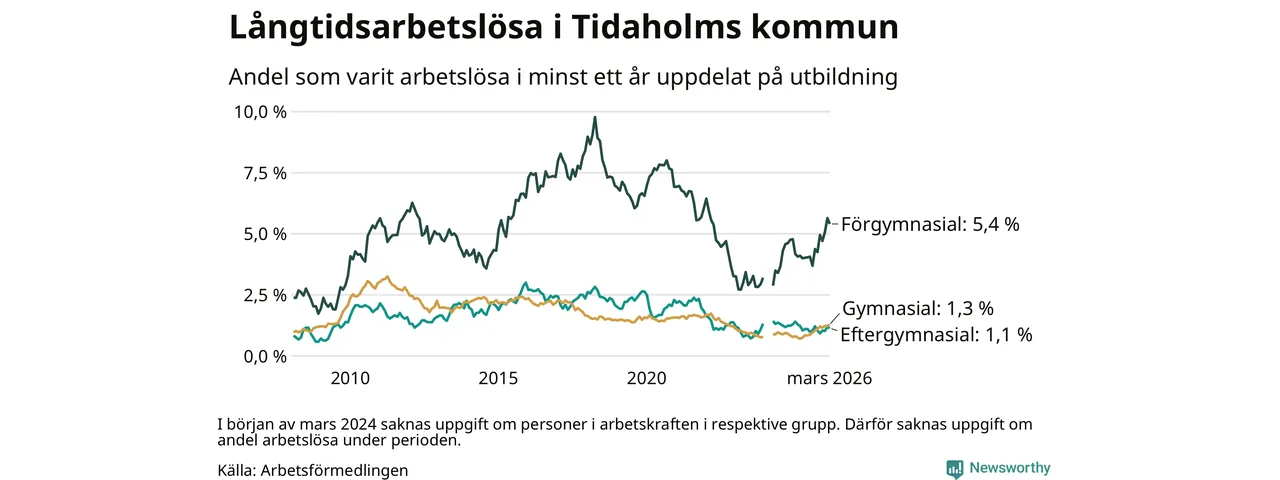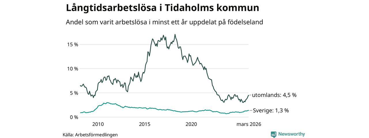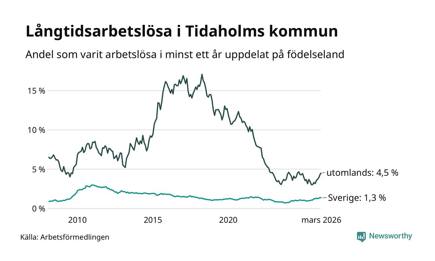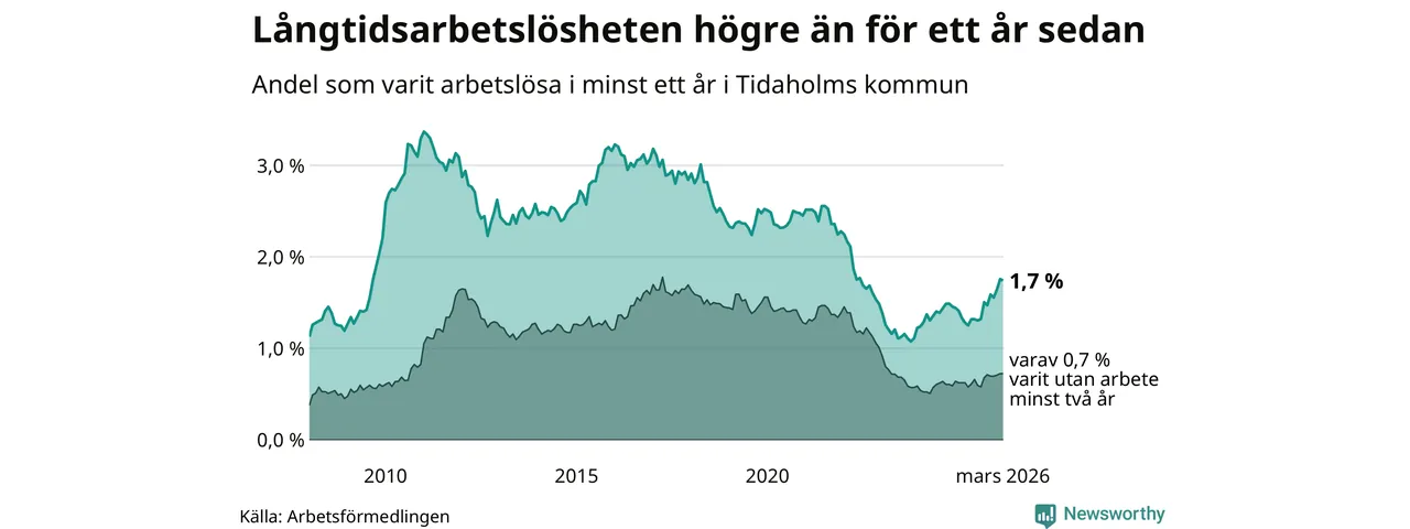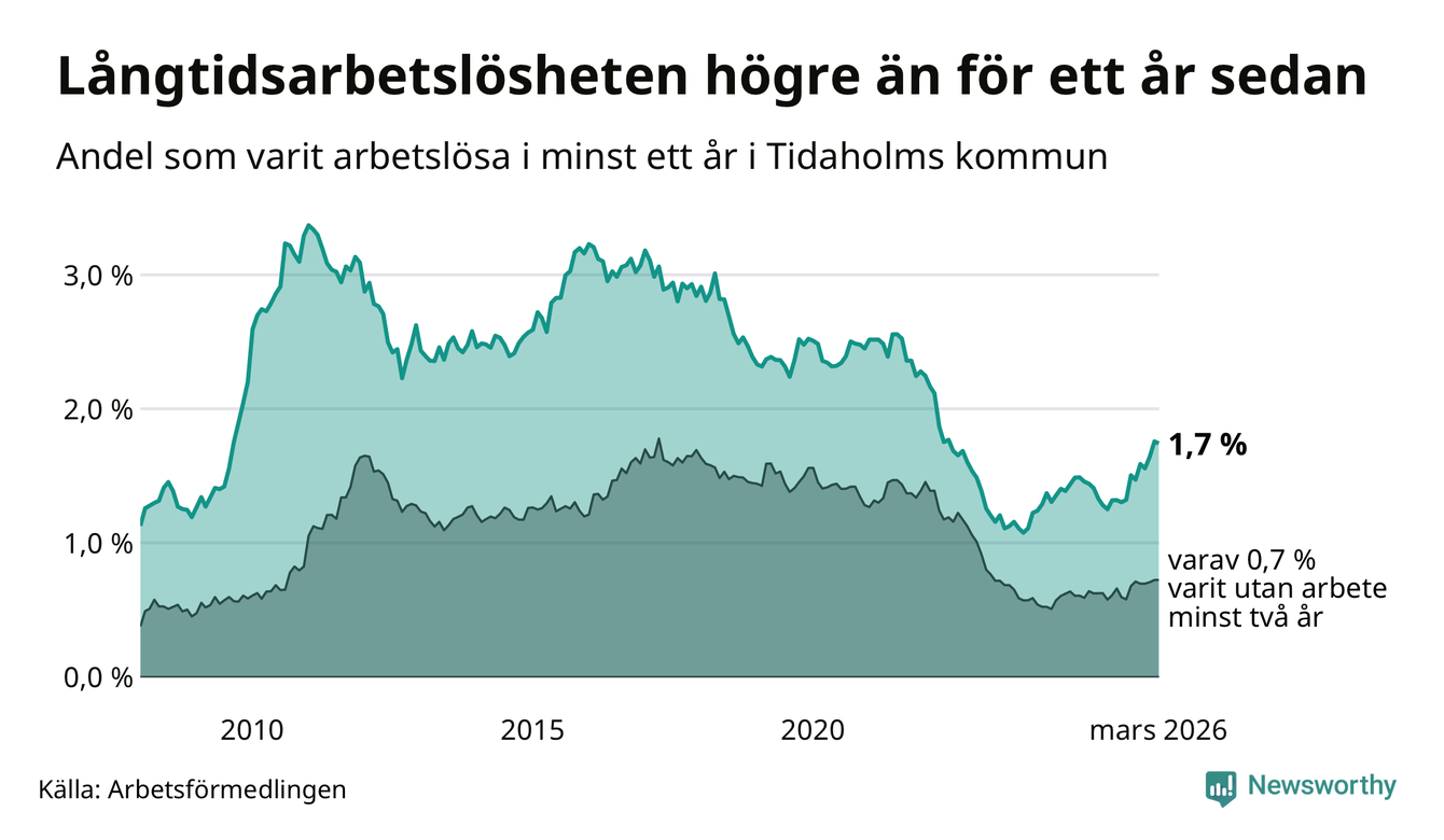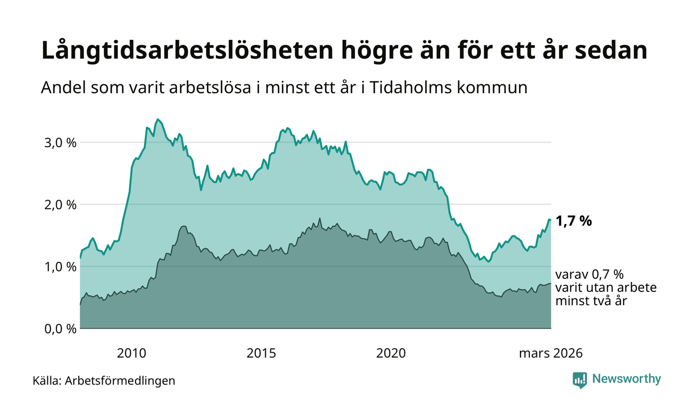 I mars hade 106 Tidaholmbor varit arbetslösa i minst ett år, vilket är en färre än månaden innan. 106 personer motsvarar 1,7 procent av arbetskraften i kommunen – andelen långtidsarbetslösa är 0,4 procentenheter högre än samma månad för ett år sedan.
