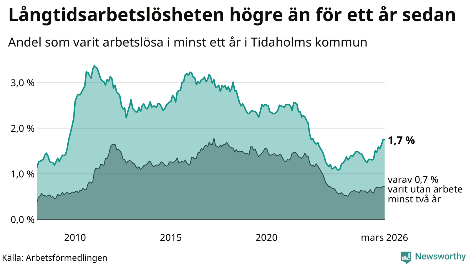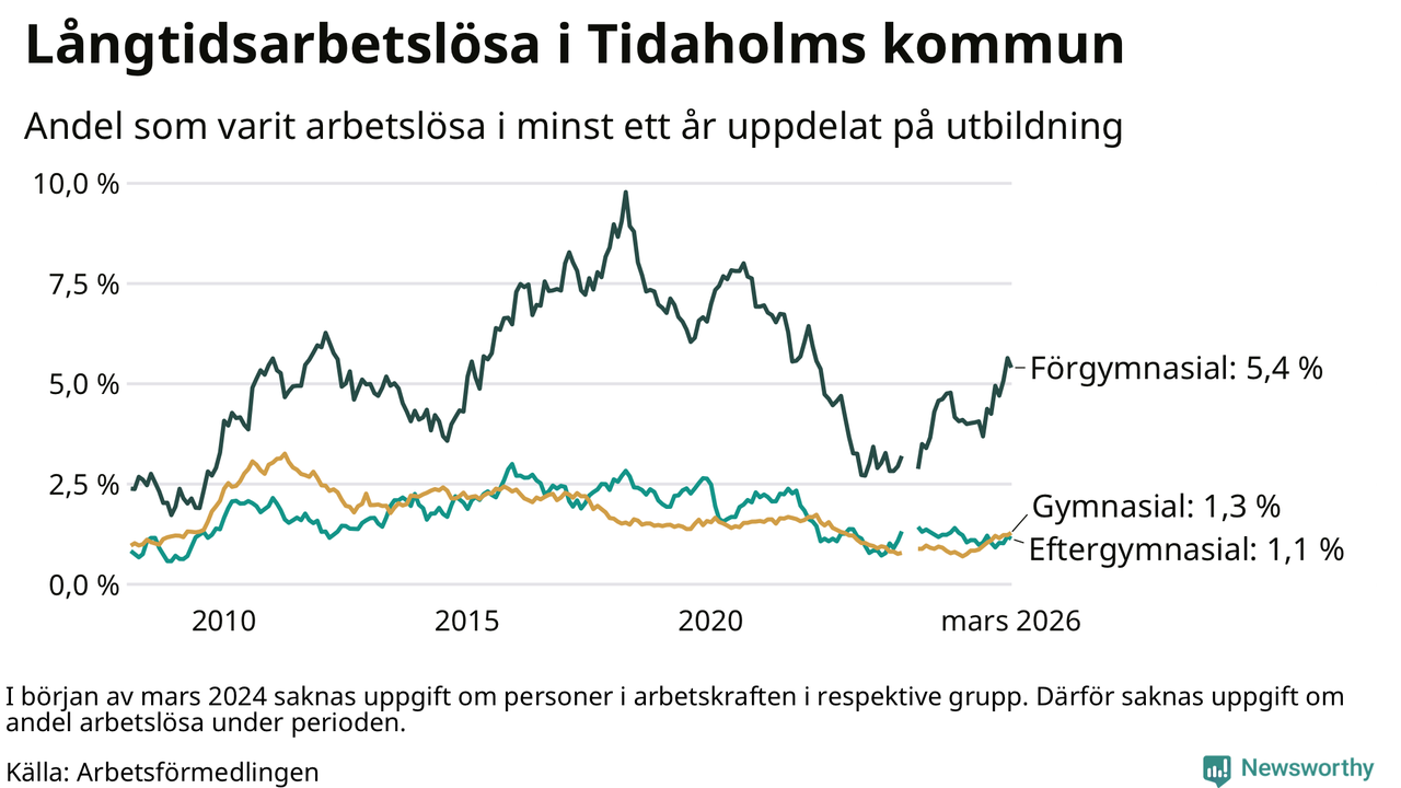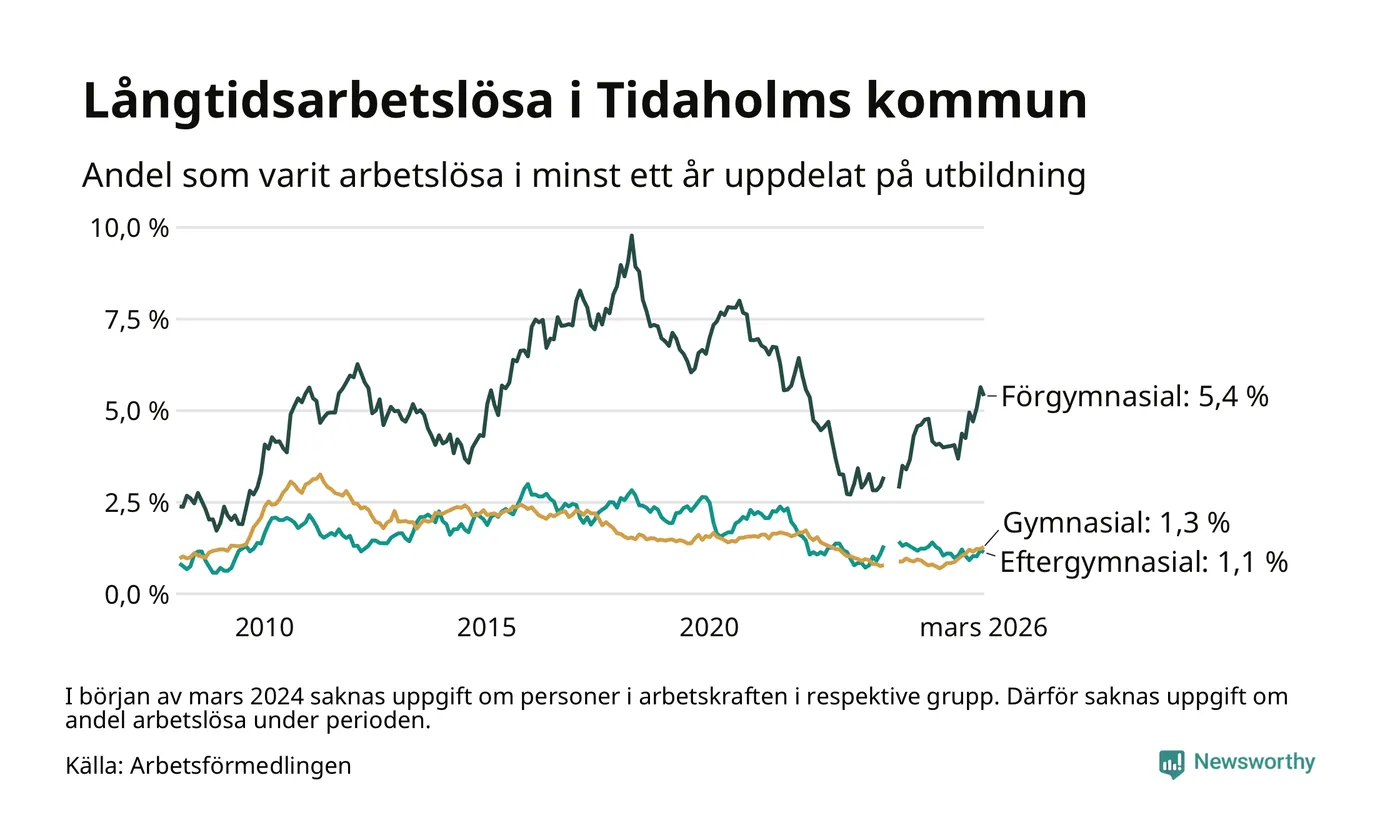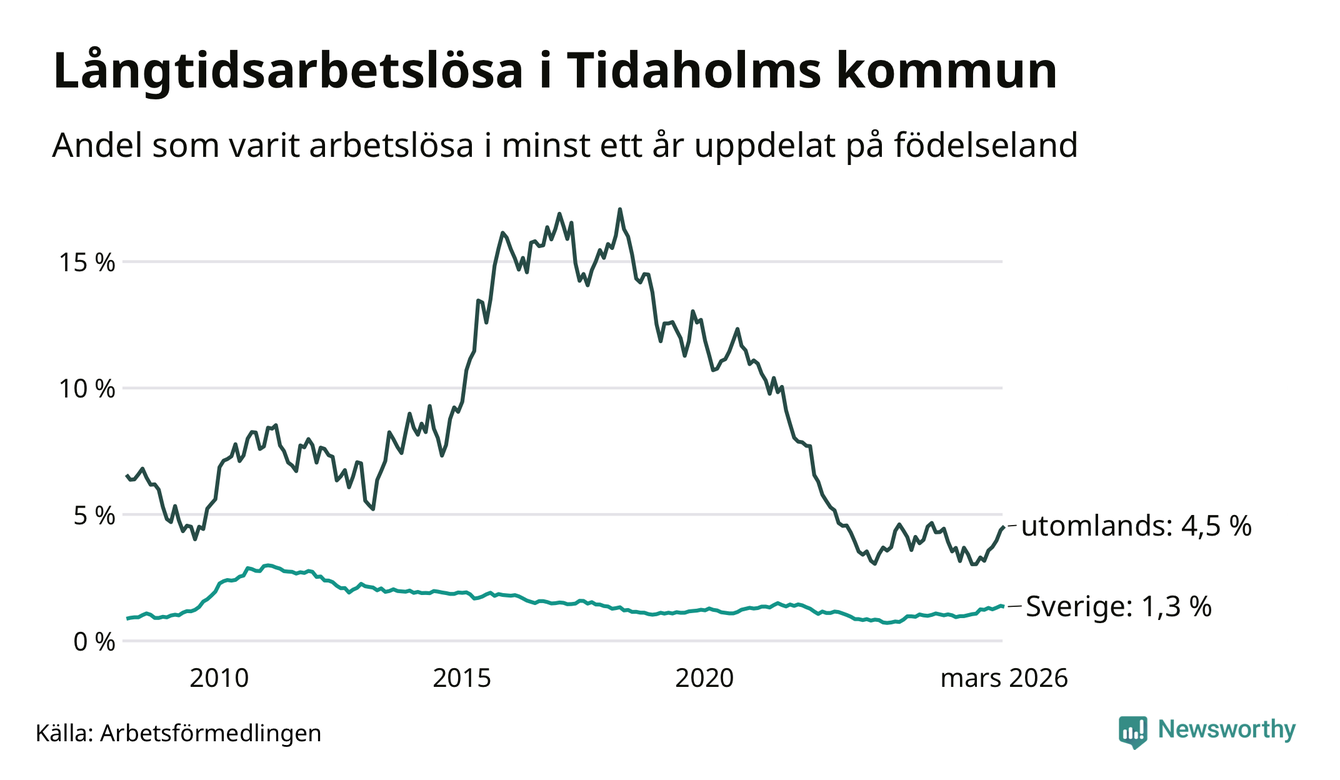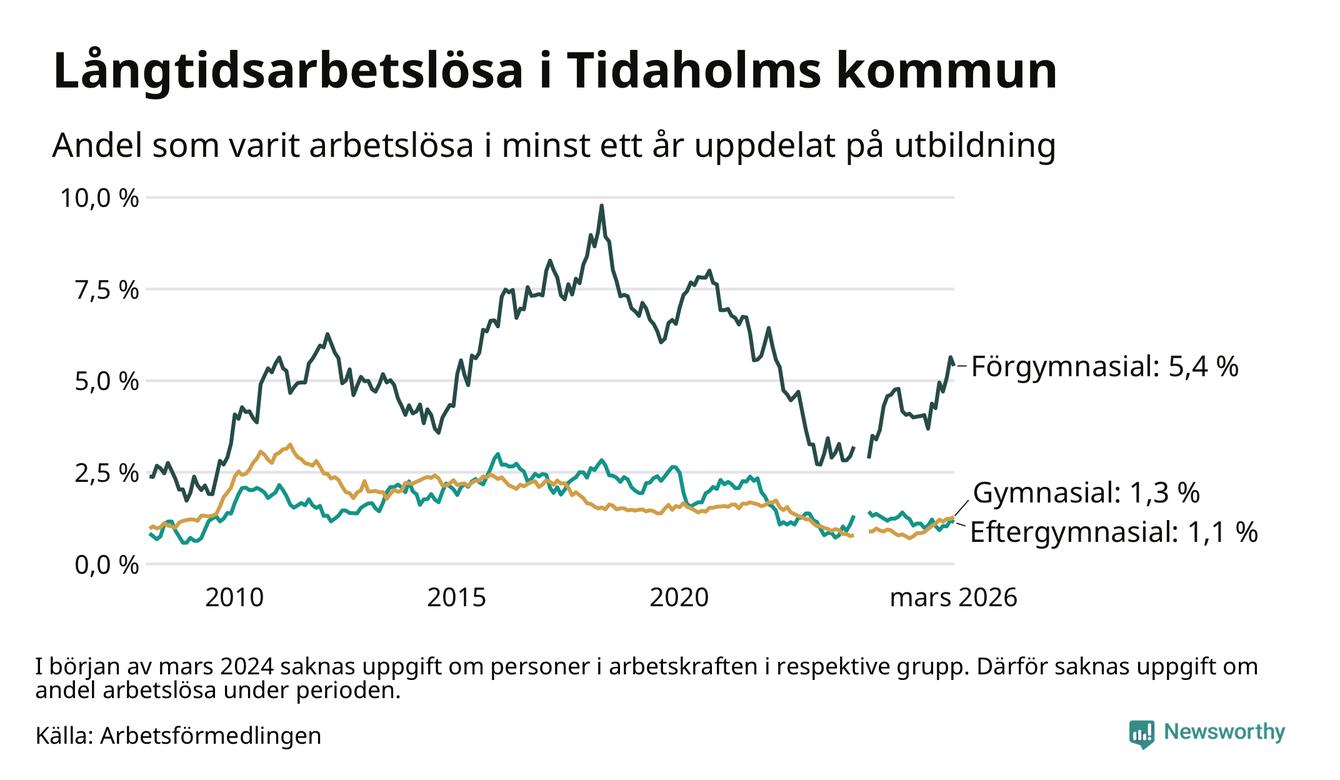 I mars hade 106 Tidaholmbor varit arbetslösa i minst ett år, vilket är en färre än månaden innan. 106 personer motsvarar 1,7 procent av arbetskraften i kommunen – andelen långtidsarbetslösa är 0,4 procentenheter högre än samma månad för ett år sedan.