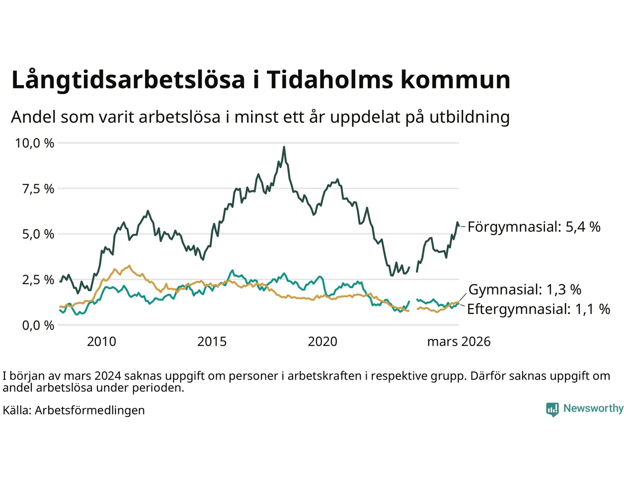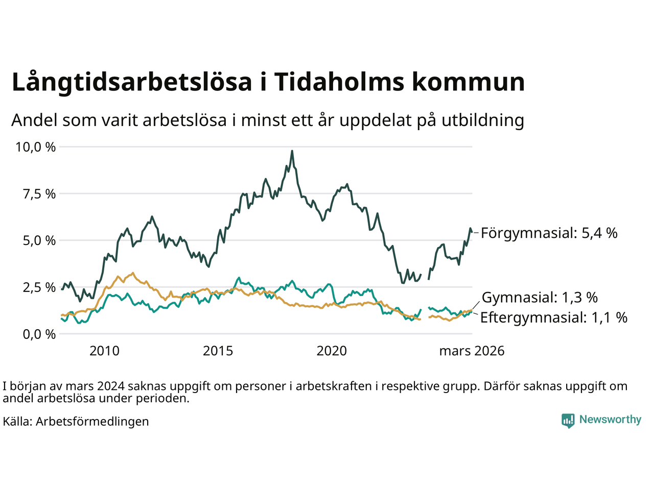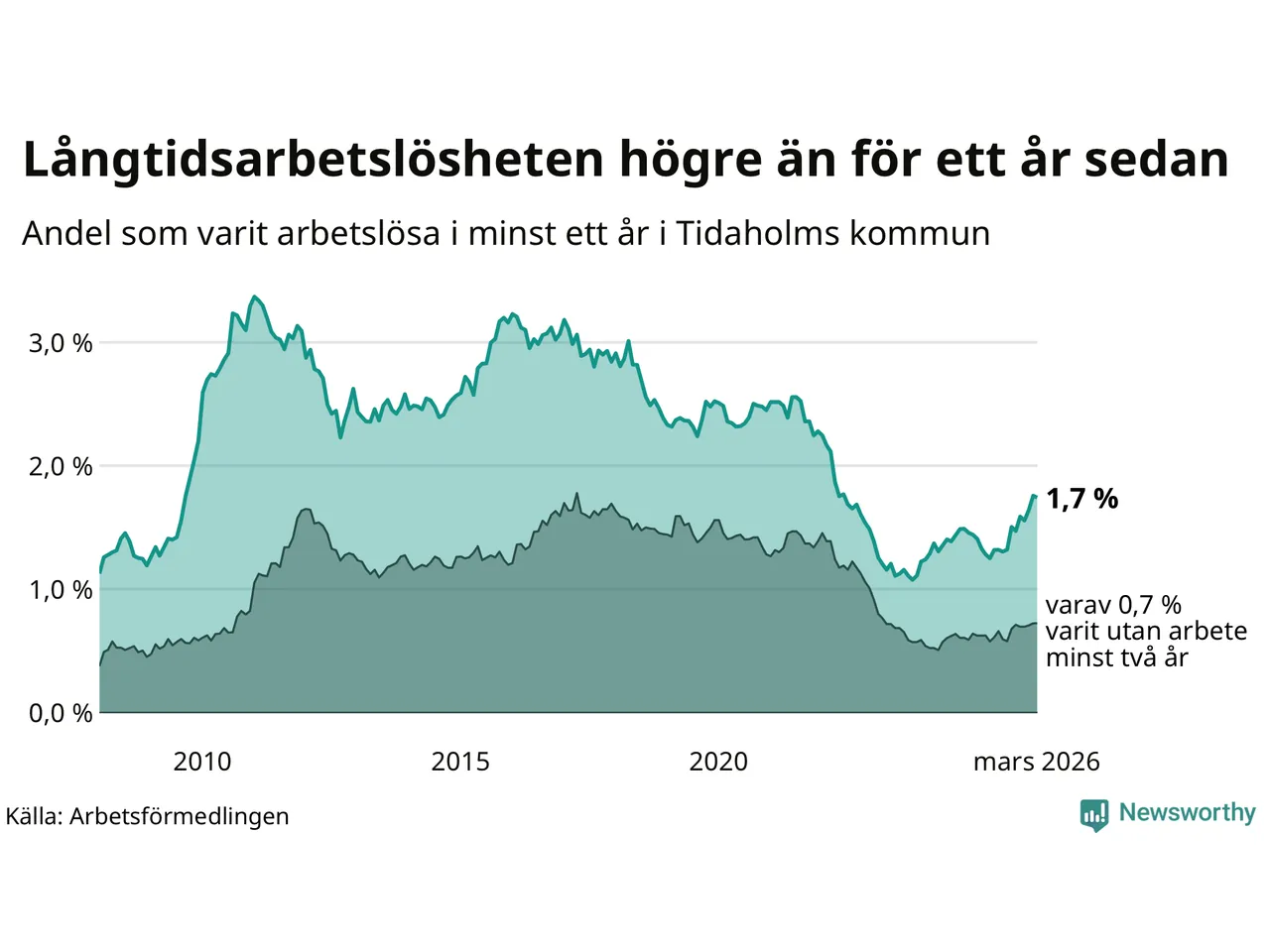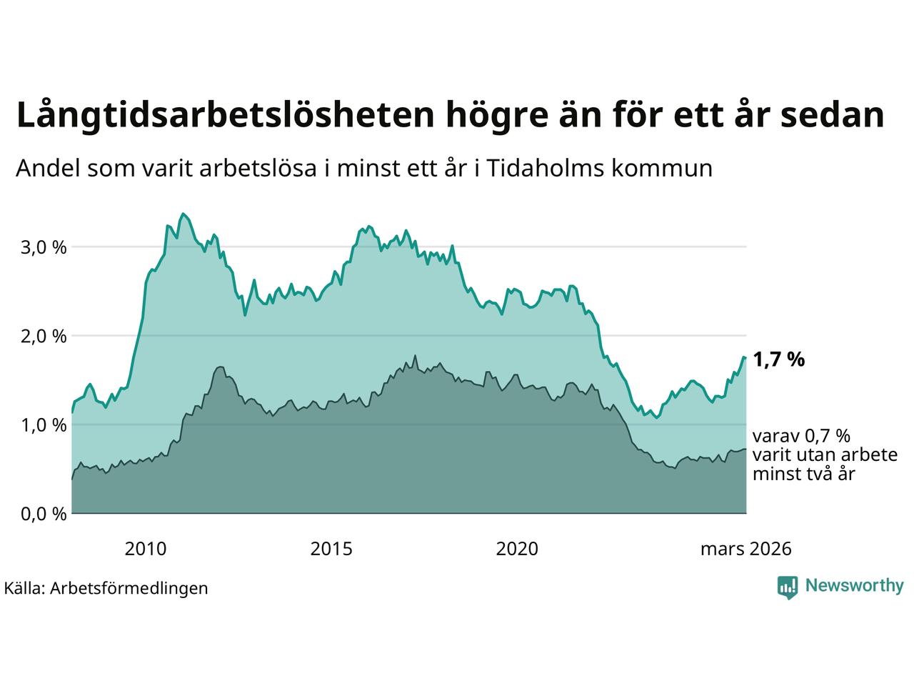 I mars hade 106 Tidaholmbor varit arbetslösa i minst ett år, vilket är en färre än månaden innan. 106 personer motsvarar 1,7 procent av arbetskraften i kommunen – andelen långtidsarbetslösa är 0,4 procentenheter högre än samma månad för ett år sedan.