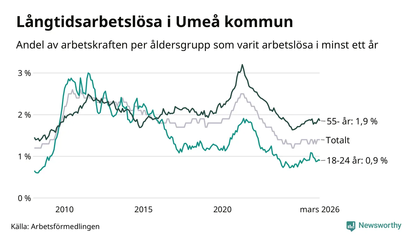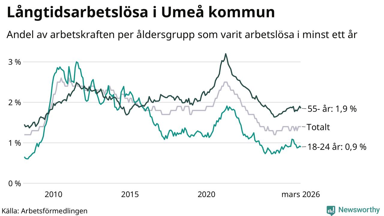 Av de 1 002 personerna som varit arbetslösa i mer än ett år i Umeå kommun är 234 personer mellan 55 och 661 år och 82 är mellan 18 och 24 år. För den äldre gruppen är andelen arbetslösa 1,9 procent medan den i den yngre gruppen är 0,9 procent. Även i riket som helhet är långtidsarbetslösheten högre i gruppen äldre.