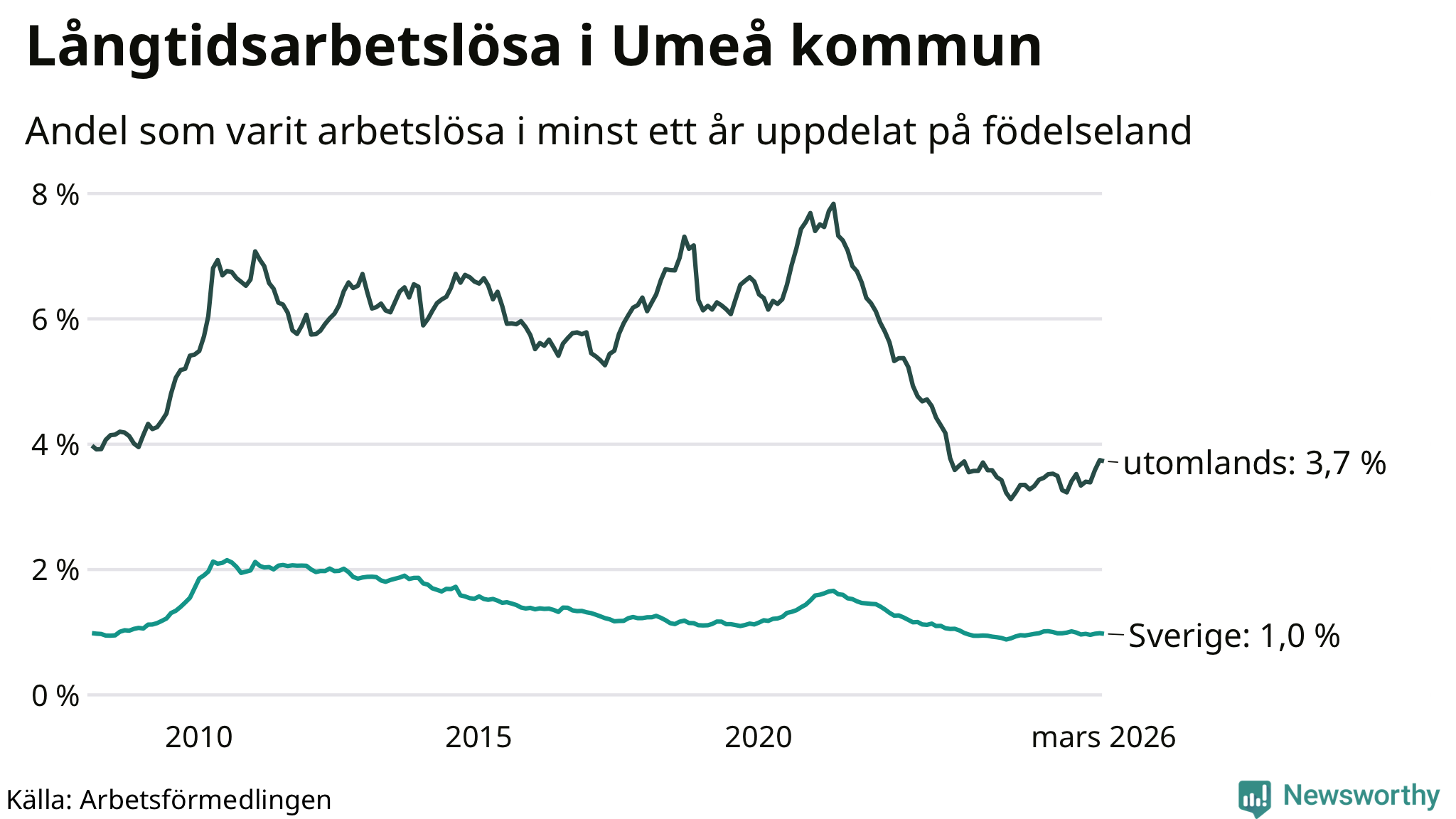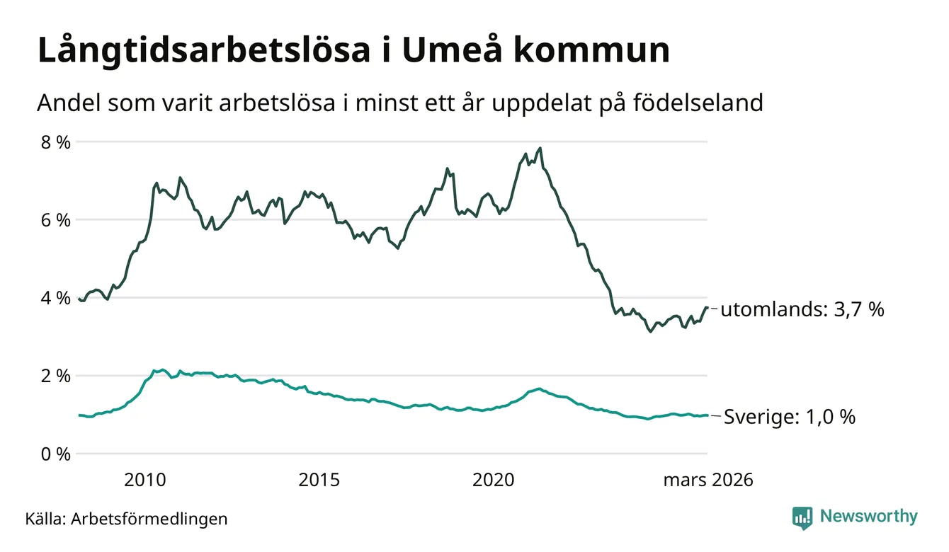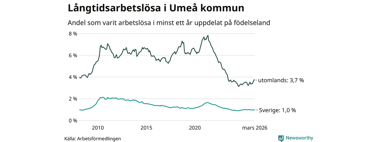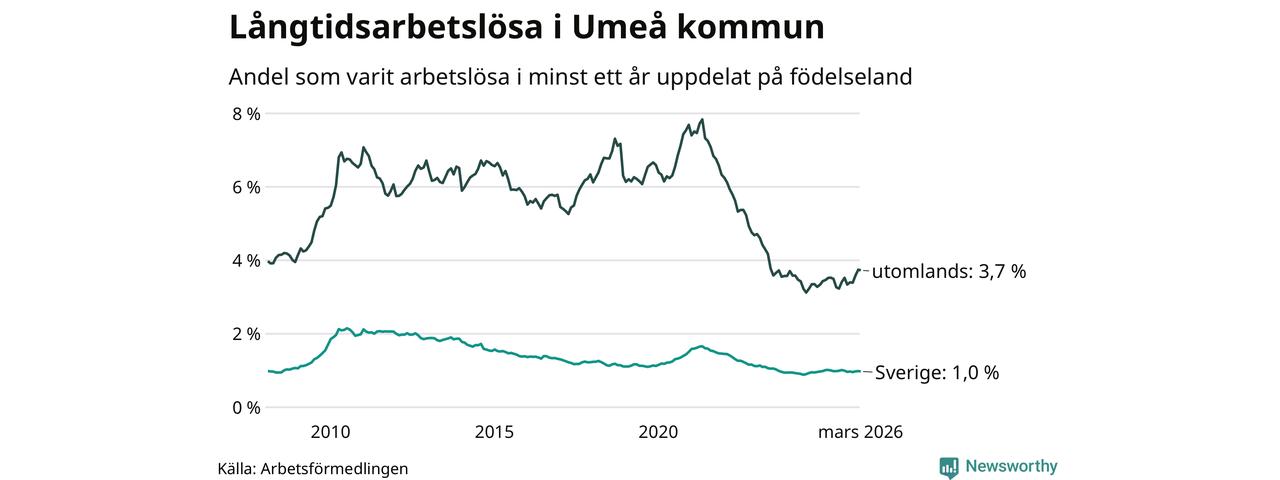 577 av de långtidsarbetslösa i Umeå är födda i Sverige, medan 425 är födda utomlands. Det innebär att långtidsarbetslösheten bland Sverigefödda är 1,0 procent, medan den är fyra gånger så hög – 3,7 procent – bland födda utomlands. Även i riket som helhet är arbetslösheten högre bland utrikesfödda.
