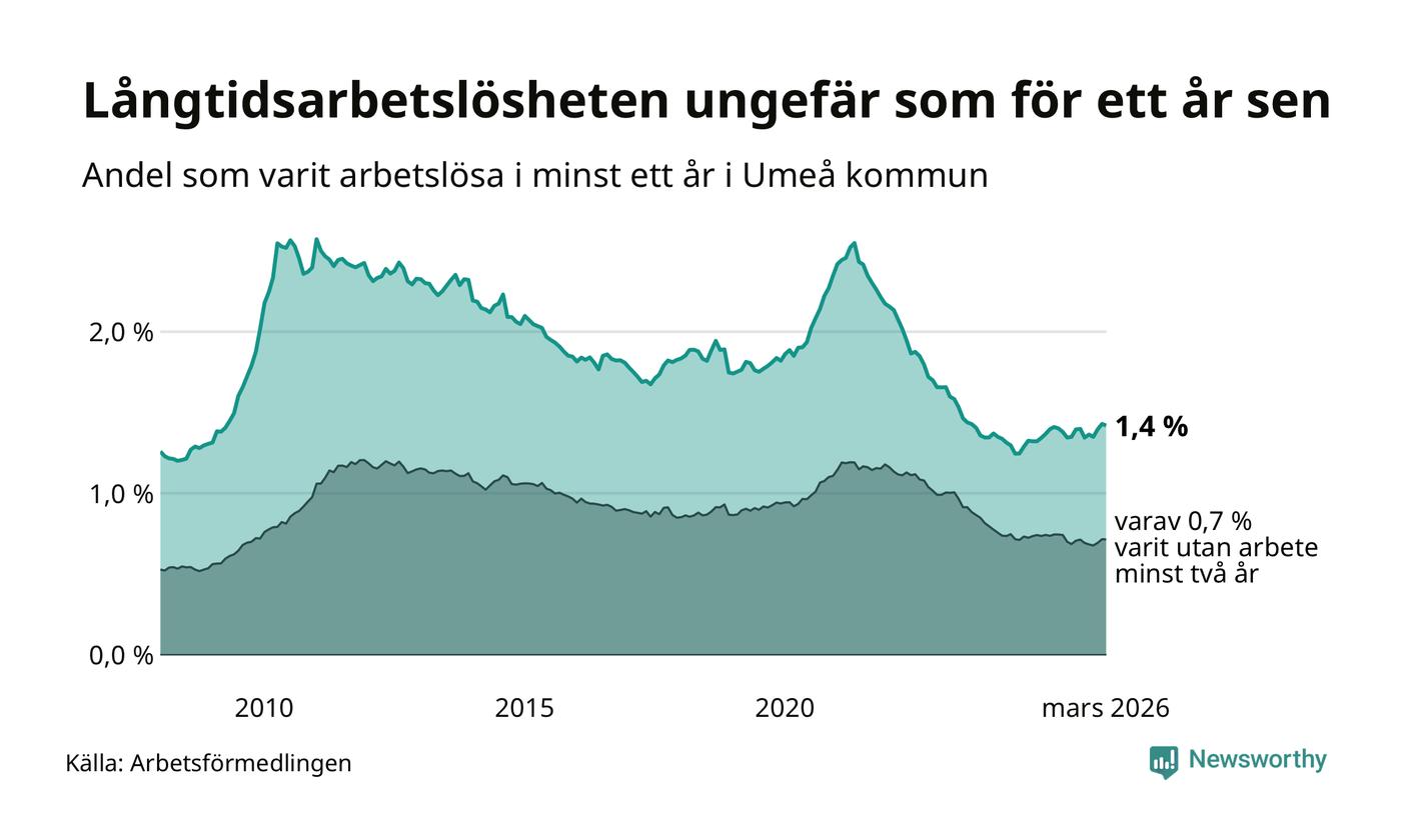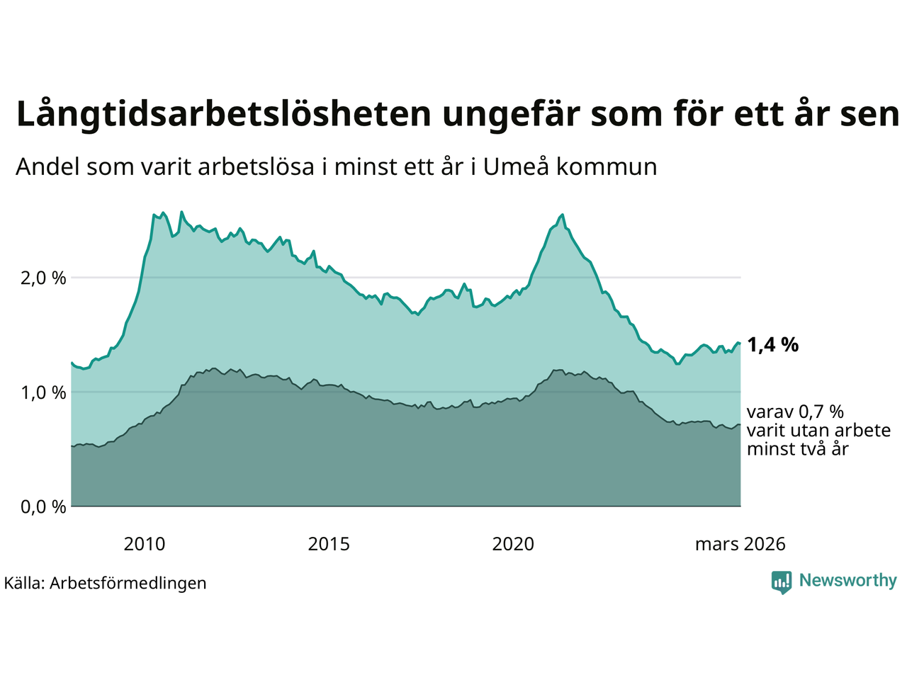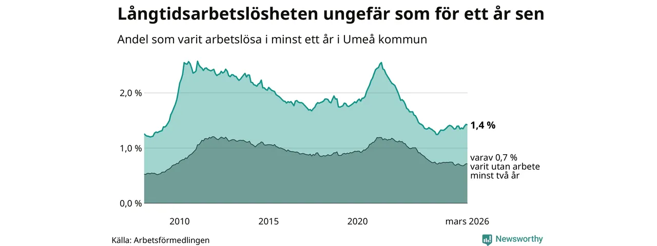 I mars hade 1 002 Umeåbor varit arbetslösa i minst ett år, vilket är sju färre än månaden innan. 1 002 personer motsvarar 1,4 procent av arbetskraften i kommunen – andelen långtidsarbetslösa är ungefär på samma nivå som för ett år sedan.