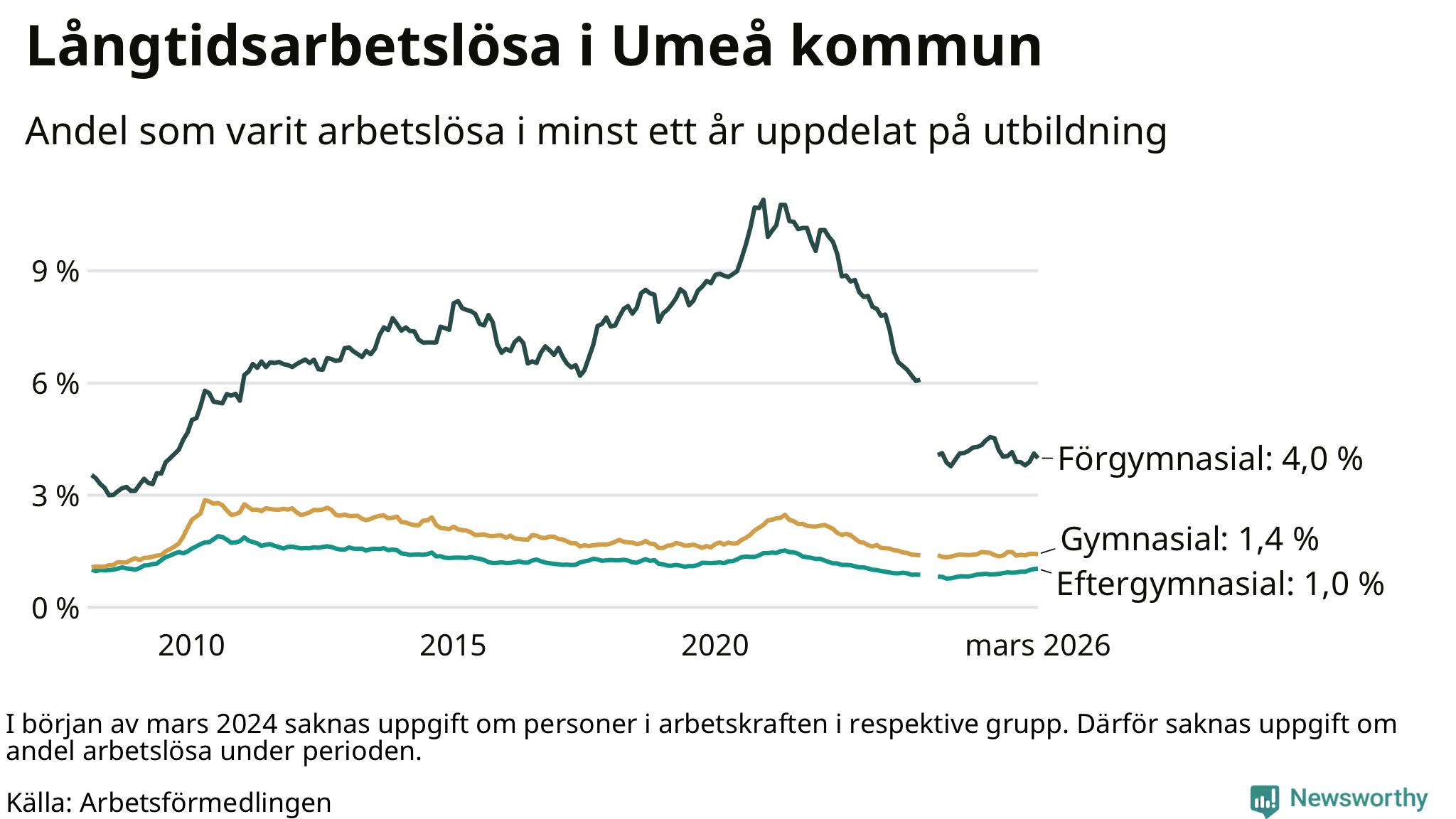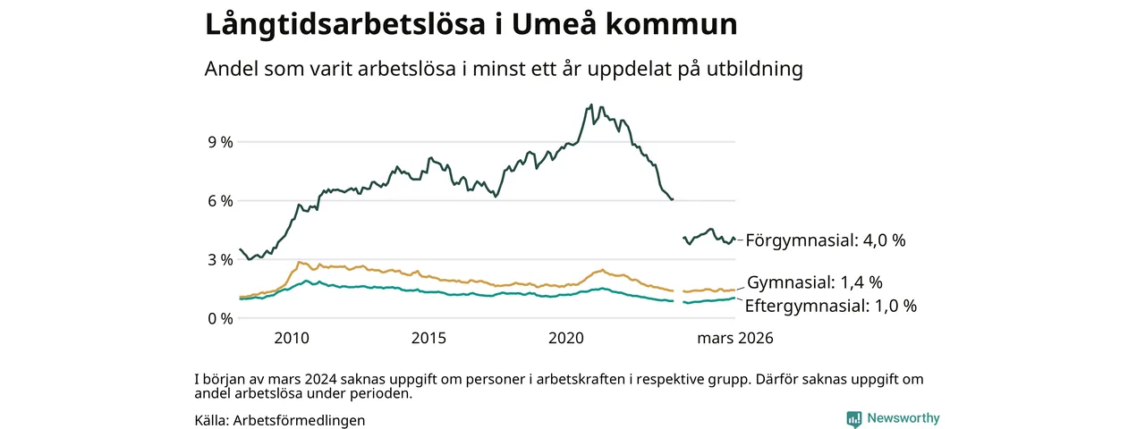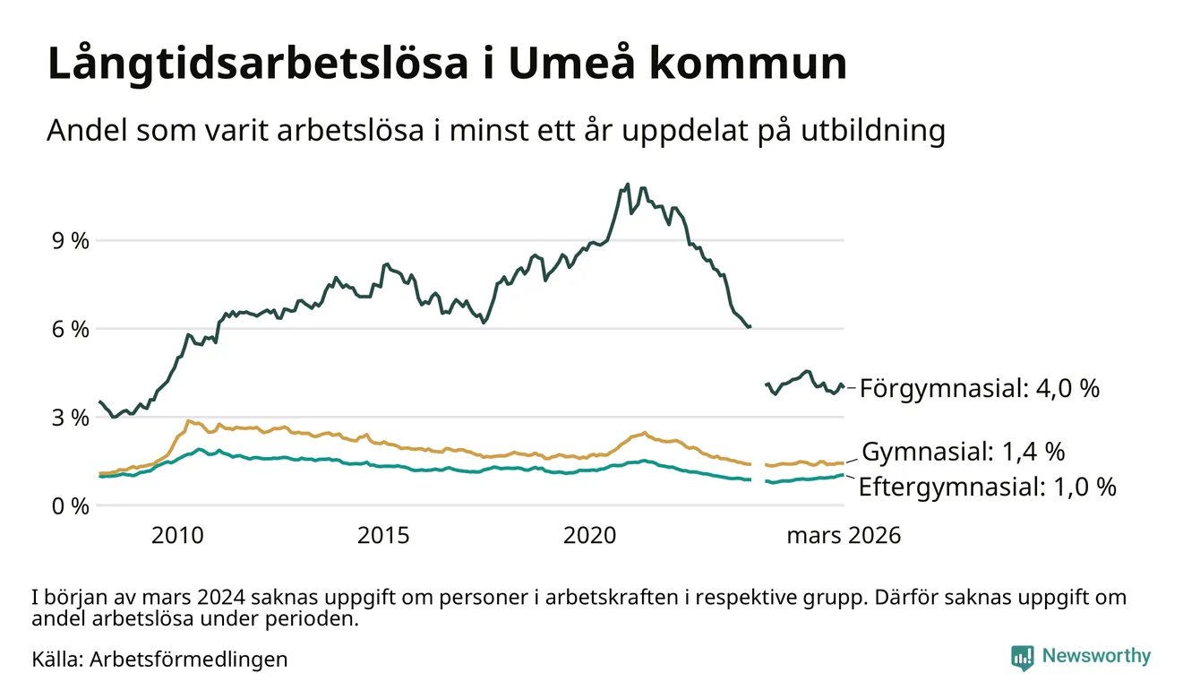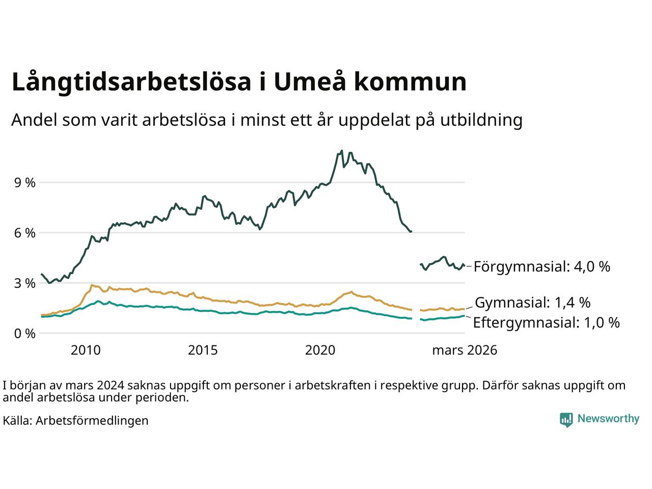 I mars hade 1 002 Umeåbor varit arbetslösa i minst ett år, vilket är sju färre än månaden innan. 1 002 personer motsvarar 1,4 procent av arbetskraften i kommunen – andelen långtidsarbetslösa är ungefär på samma nivå som för ett år sedan.