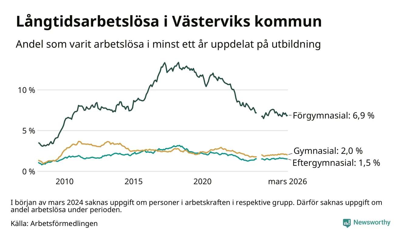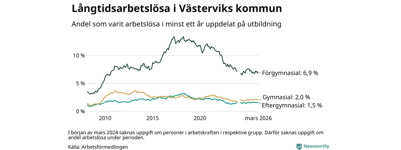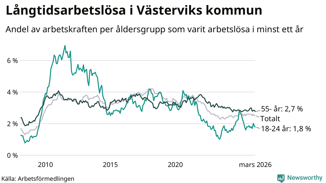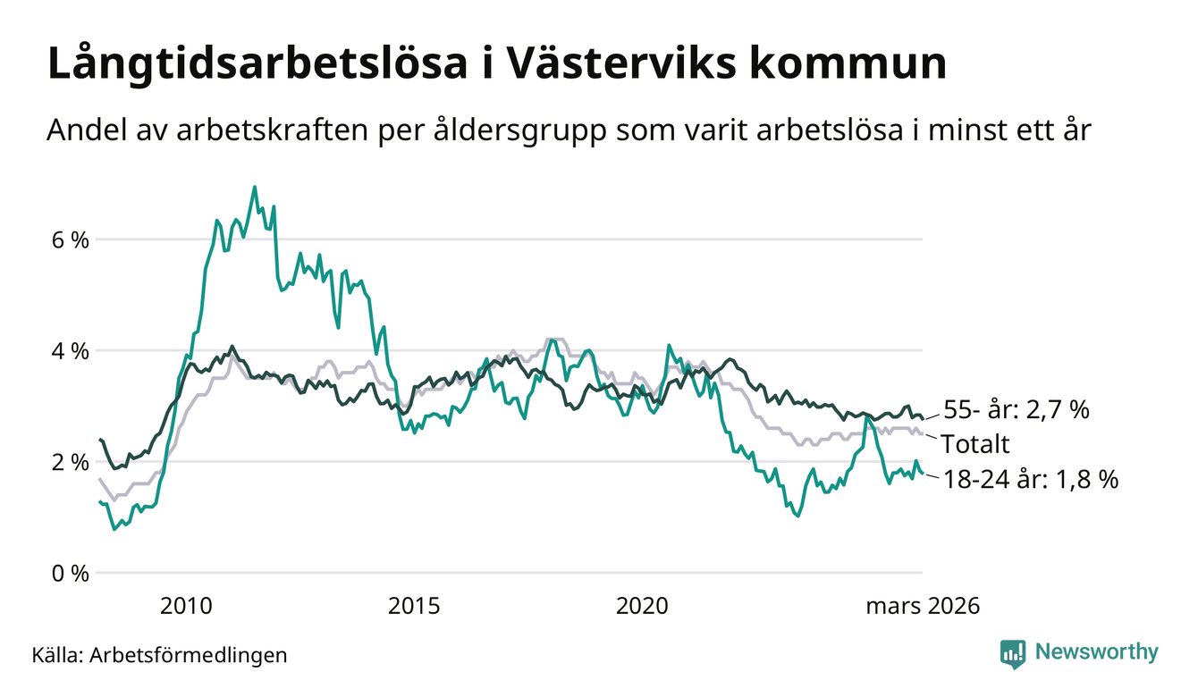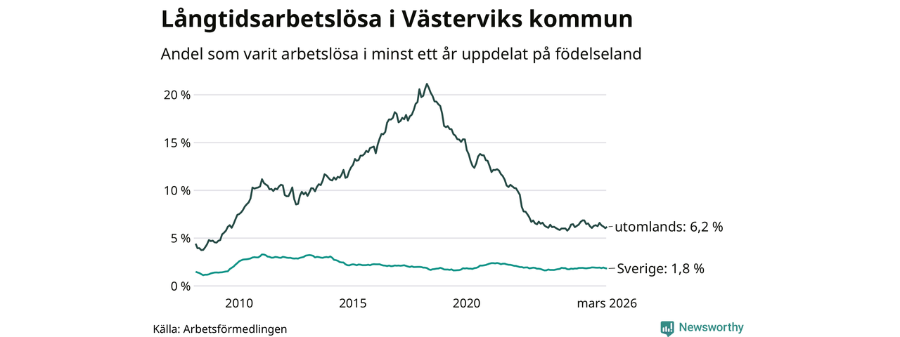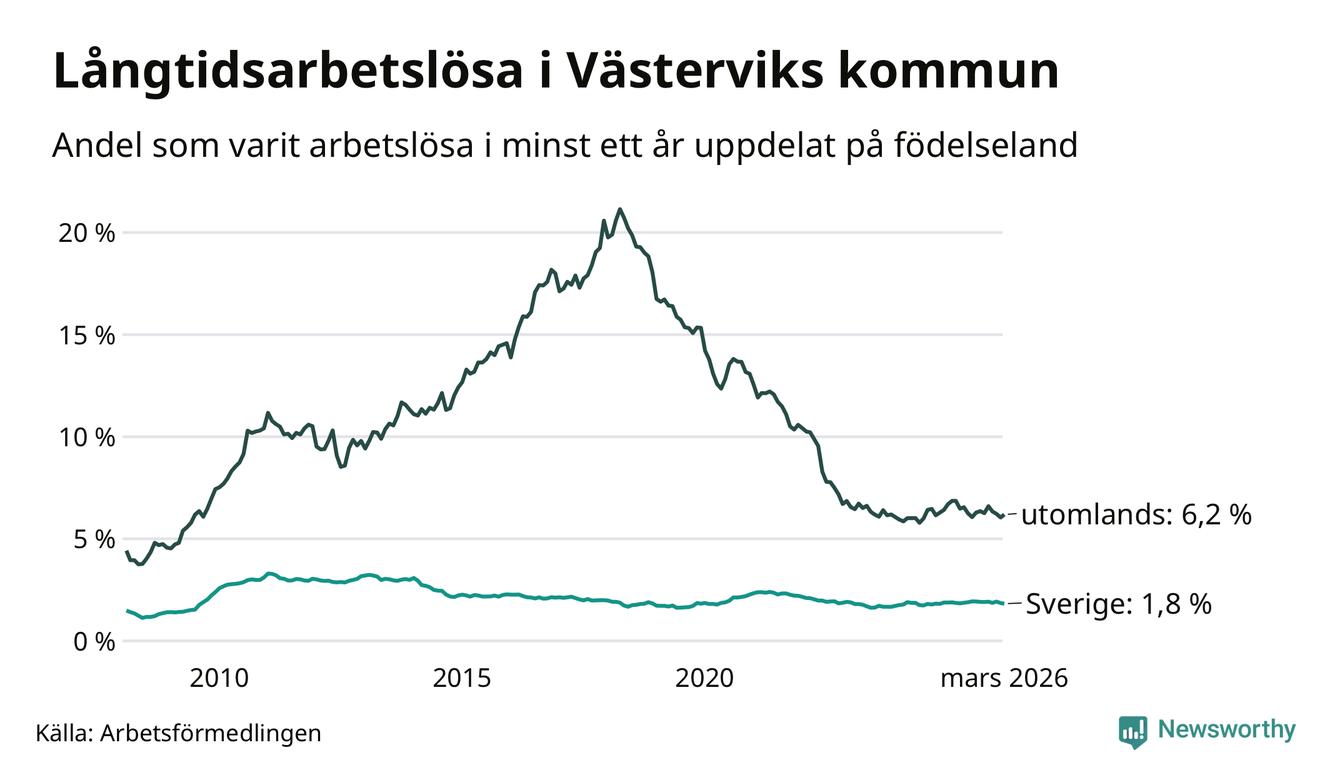 I mars hade 411 Västerviksbor varit arbetslösa i minst ett år, vilket är en färre än månaden innan. 411 personer motsvarar 2,5 procent av arbetskraften i kommunen – andelen långtidsarbetslösa är ungefär på samma nivå som för ett år sedan.