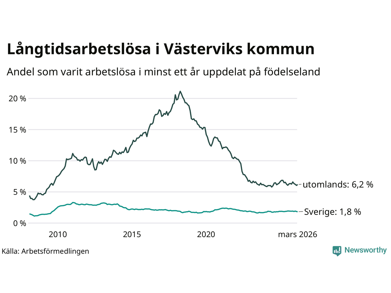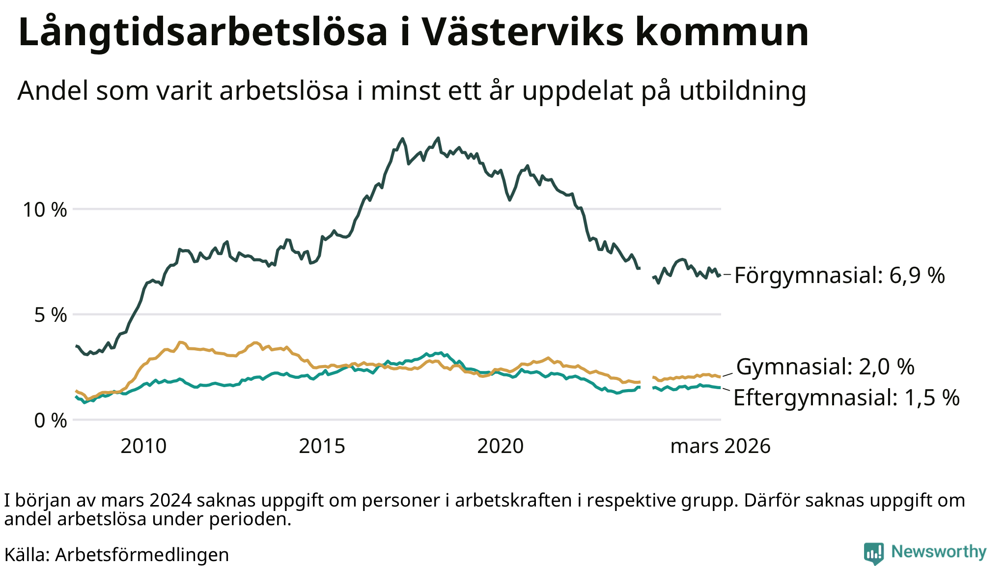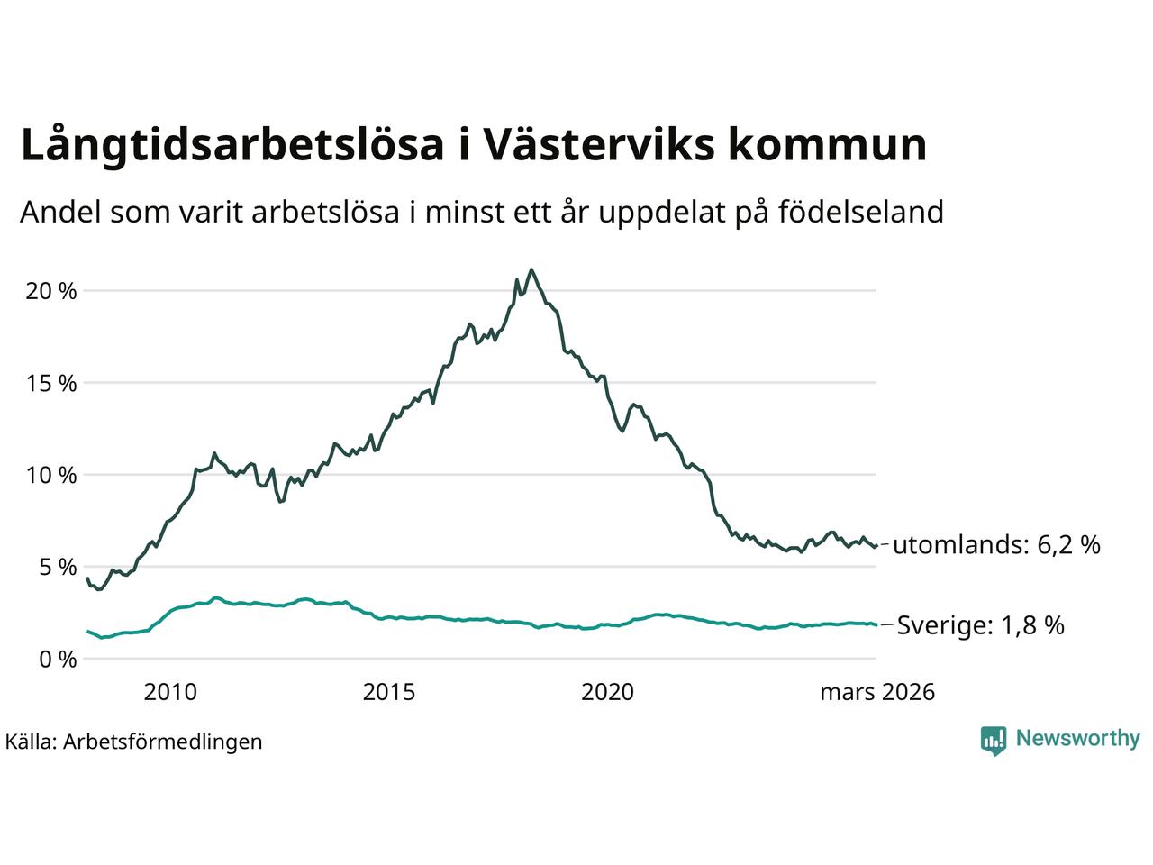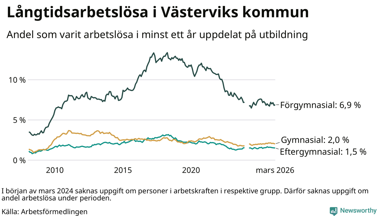 I mars hade 411 Västerviksbor varit arbetslösa i minst ett år, vilket är en färre än månaden innan. 411 personer motsvarar 2,5 procent av arbetskraften i kommunen – andelen långtidsarbetslösa är ungefär på samma nivå som för ett år sedan.