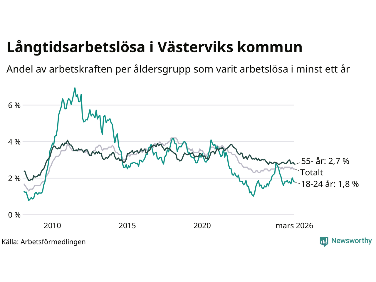 Av de 411 personerna som varit arbetslösa i mer än ett år i Västerviks kommun är 117 personer mellan 55 och 661 år och 28 är mellan 18 och 24 år. För den äldre gruppen är andelen arbetslösa 2,7 procent medan den i den yngre gruppen är 1,8 procent. Även i riket som helhet är långtidsarbetslösheten högre i gruppen äldre.