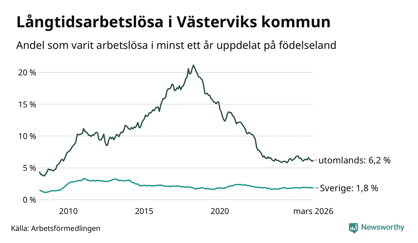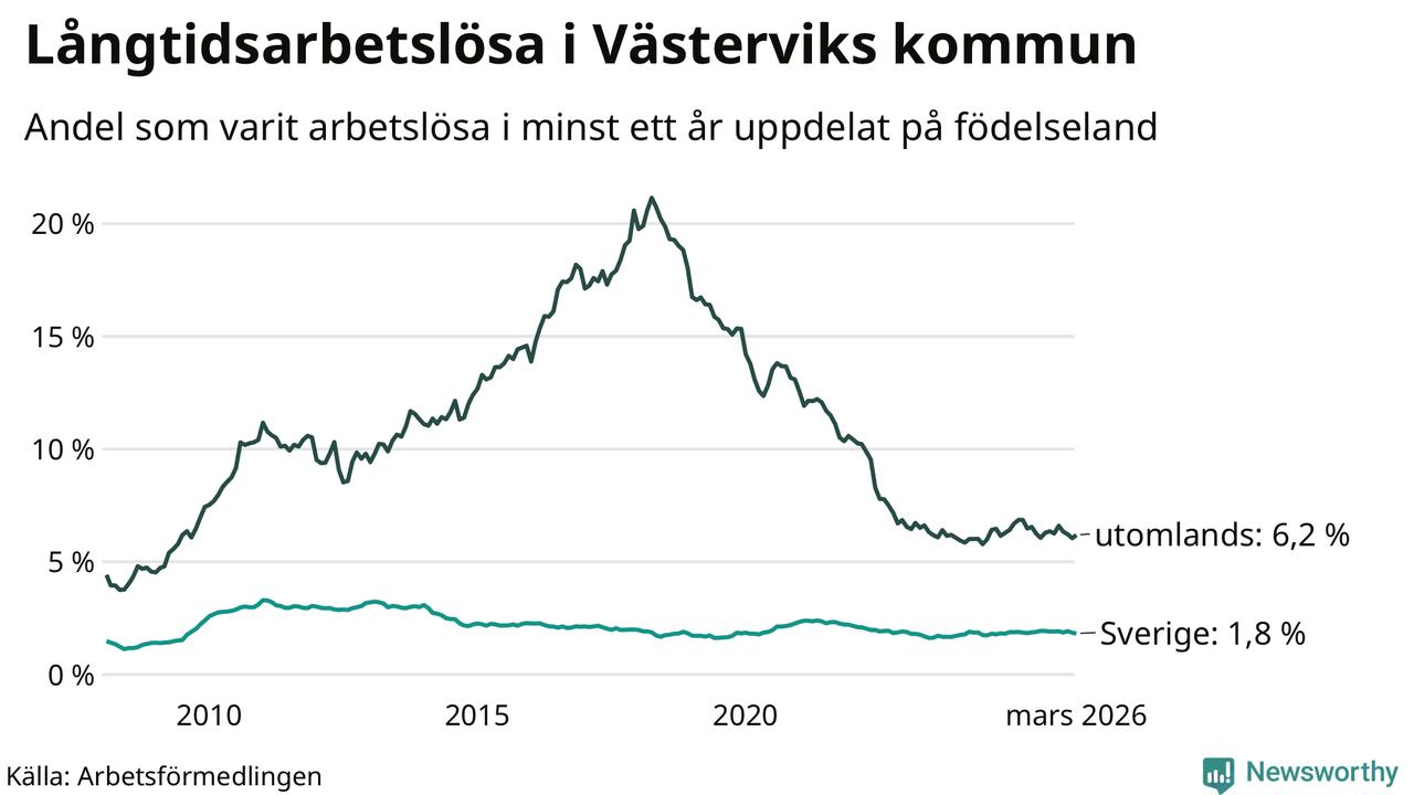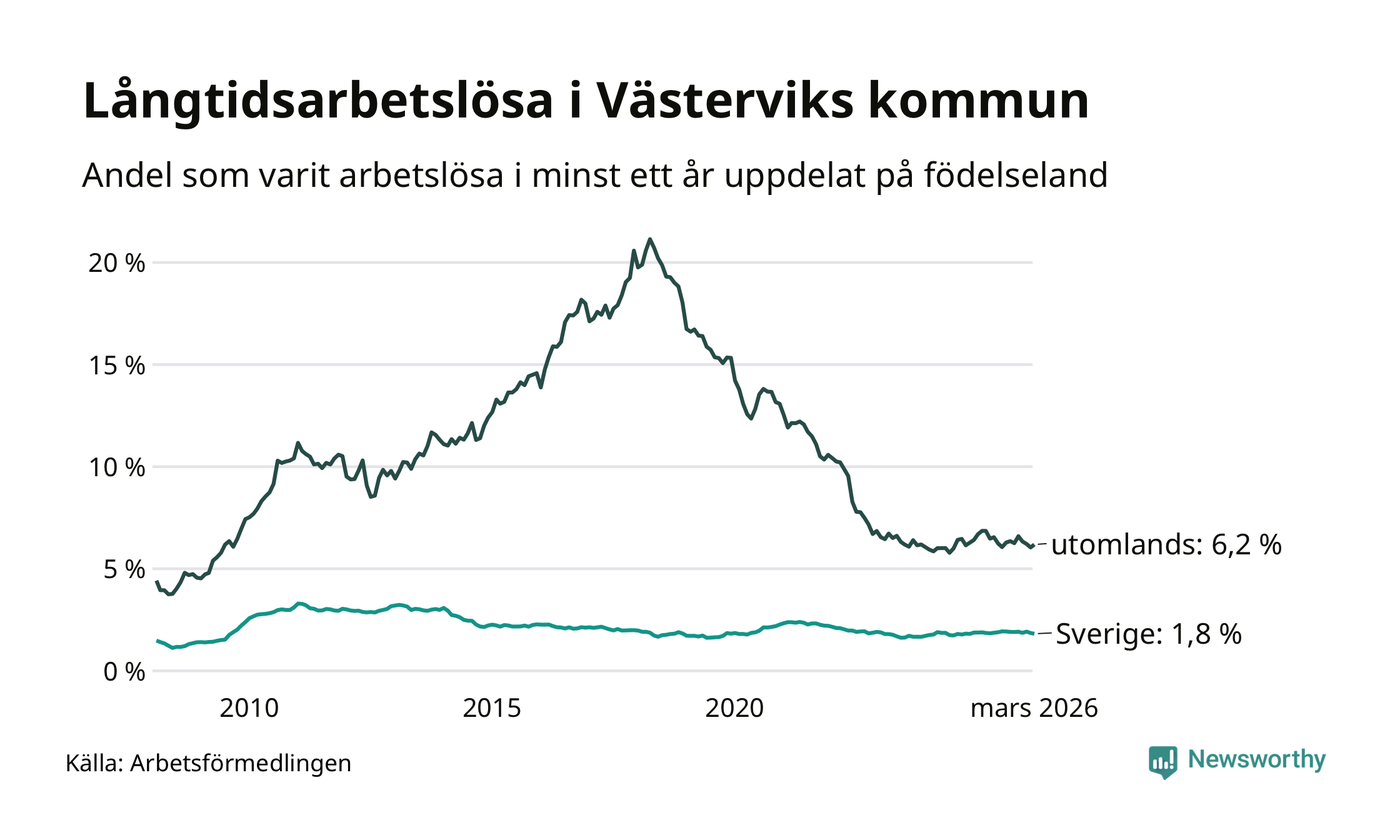 254 av de långtidsarbetslösa i Västervik är födda i Sverige, medan 157 är födda utomlands. Det innebär att långtidsarbetslösheten bland Sverigefödda är 1,8 procent, medan den är tre gånger så hög – 6,2 procent – bland födda utomlands. Även i riket som helhet är arbetslösheten högre bland utrikesfödda.