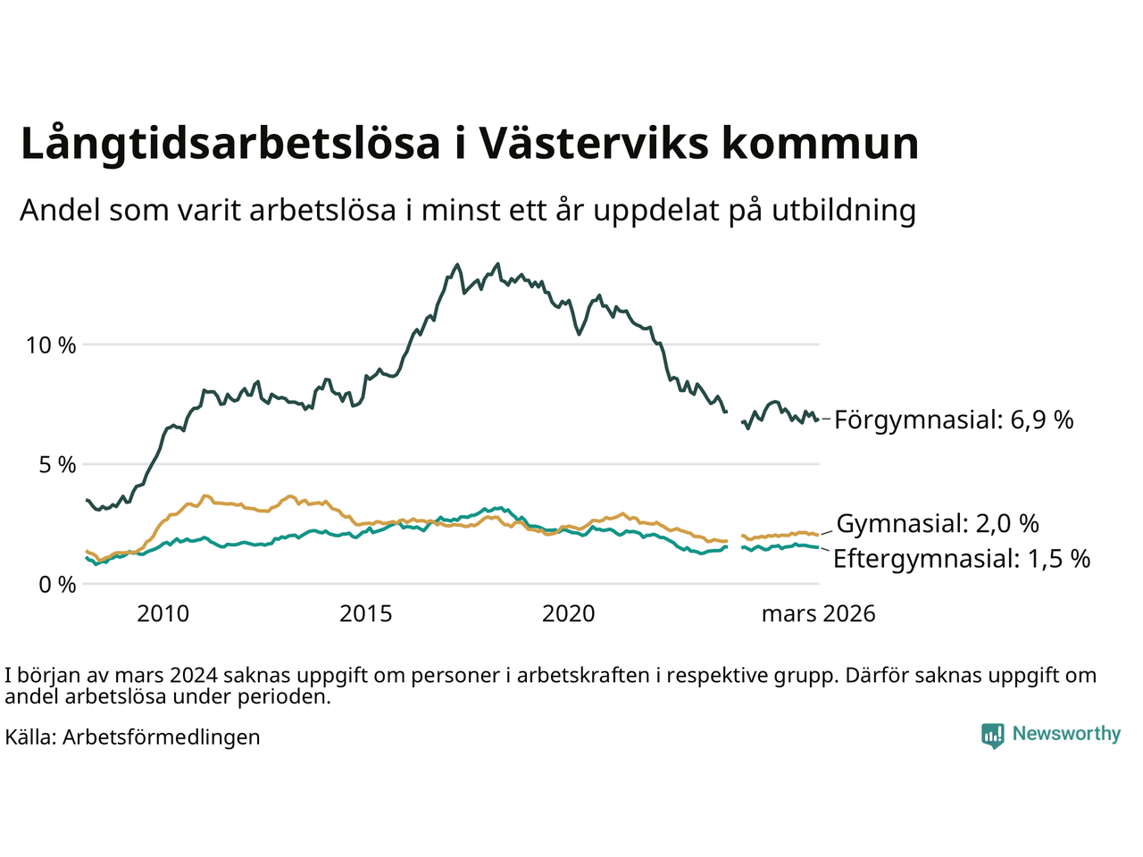 | Andel arbetslösa i minst två år | 1,4 % | 1,5 % | 1,6 % |