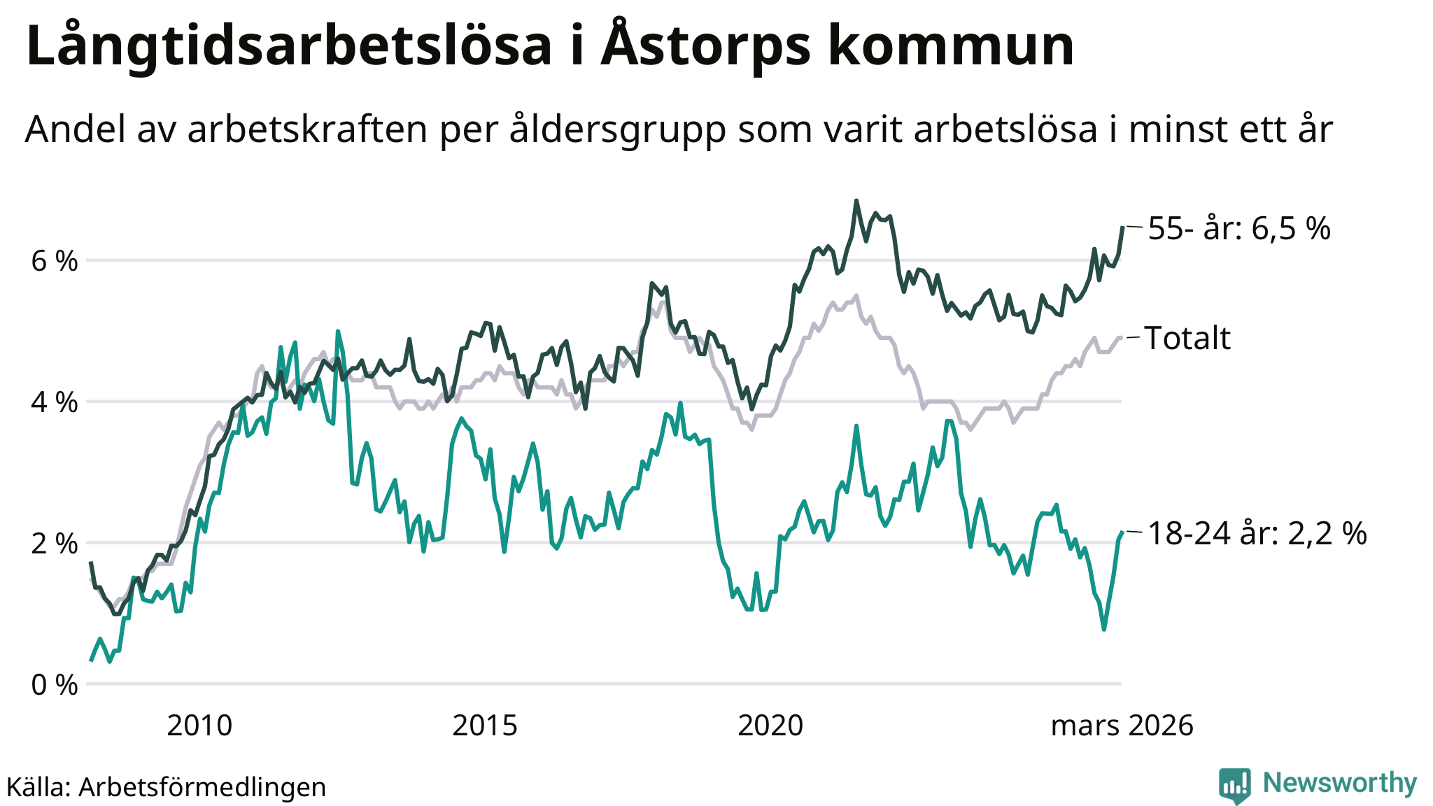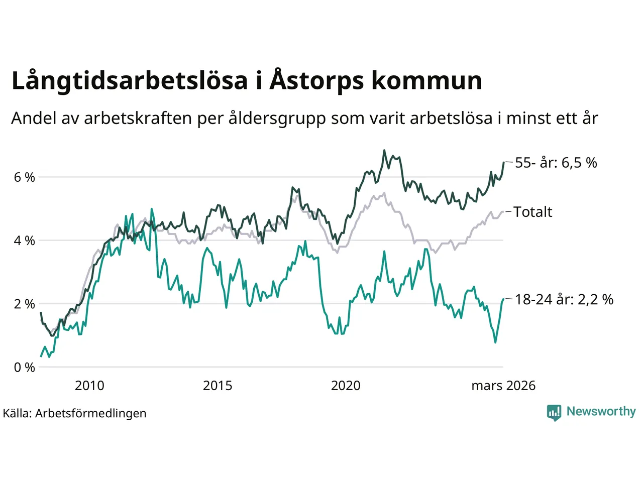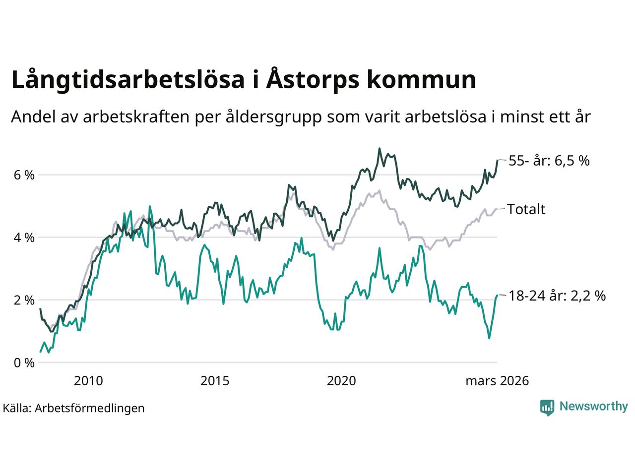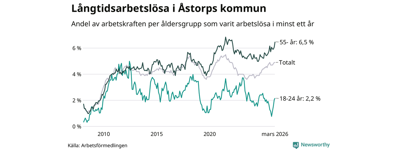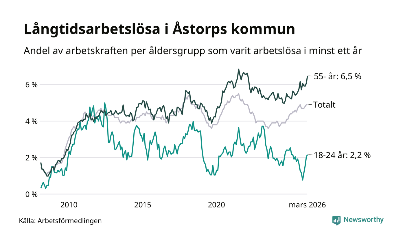 Av de 400 personerna som varit arbetslösa i mer än ett år i Åstorps kommun är 108 personer mellan 55 och 661 år och 17 är mellan 18 och 24 år. För den äldre gruppen är andelen arbetslösa 6,5 procent medan den i den yngre gruppen är 2,2 procent. Även i riket som helhet är långtidsarbetslösheten högre i gruppen äldre.