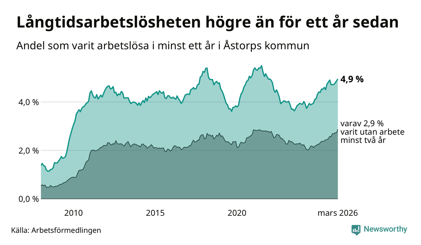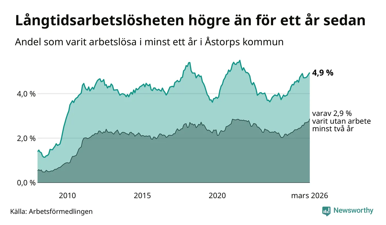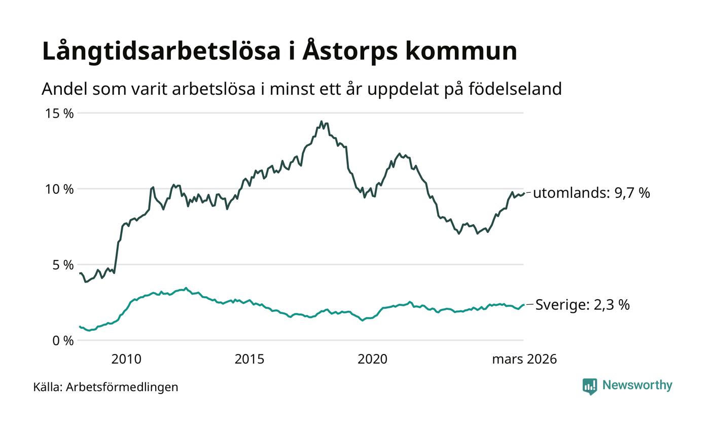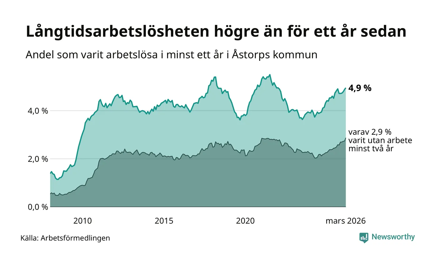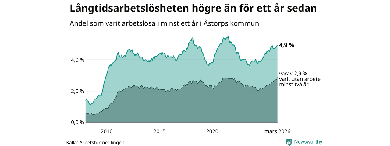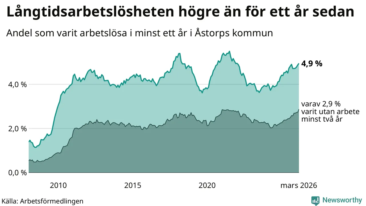 I mars hade 400 Åstorpsbor varit arbetslösa i minst ett år, vilket är sex fler än månaden innan. Det är den fjärde månaden i rad med ökande antal långtidsarbetslösa. 400 personer motsvarar 4,9 procent av arbetskraften i kommunen – andelen långtidsarbetslösa är 0,4 procentenheter högre än samma månad för ett år sedan. Åstorp tillhör de kommuner som har högst andel långtidsarbetslösa i hela landet just nu.