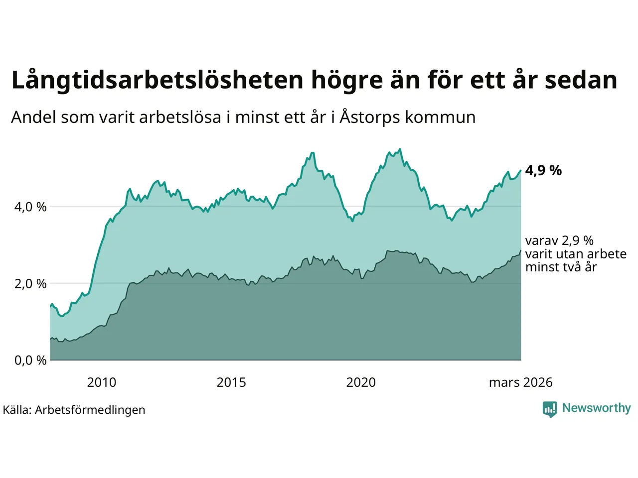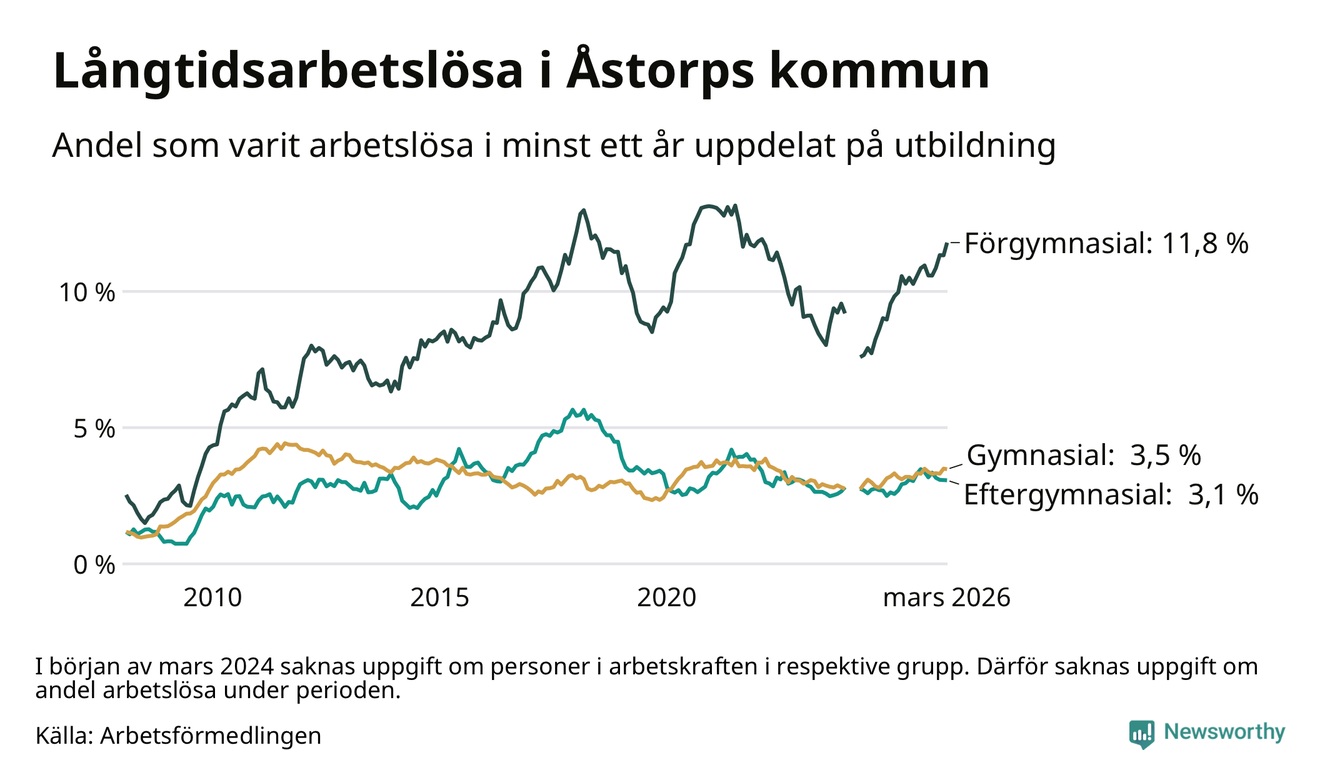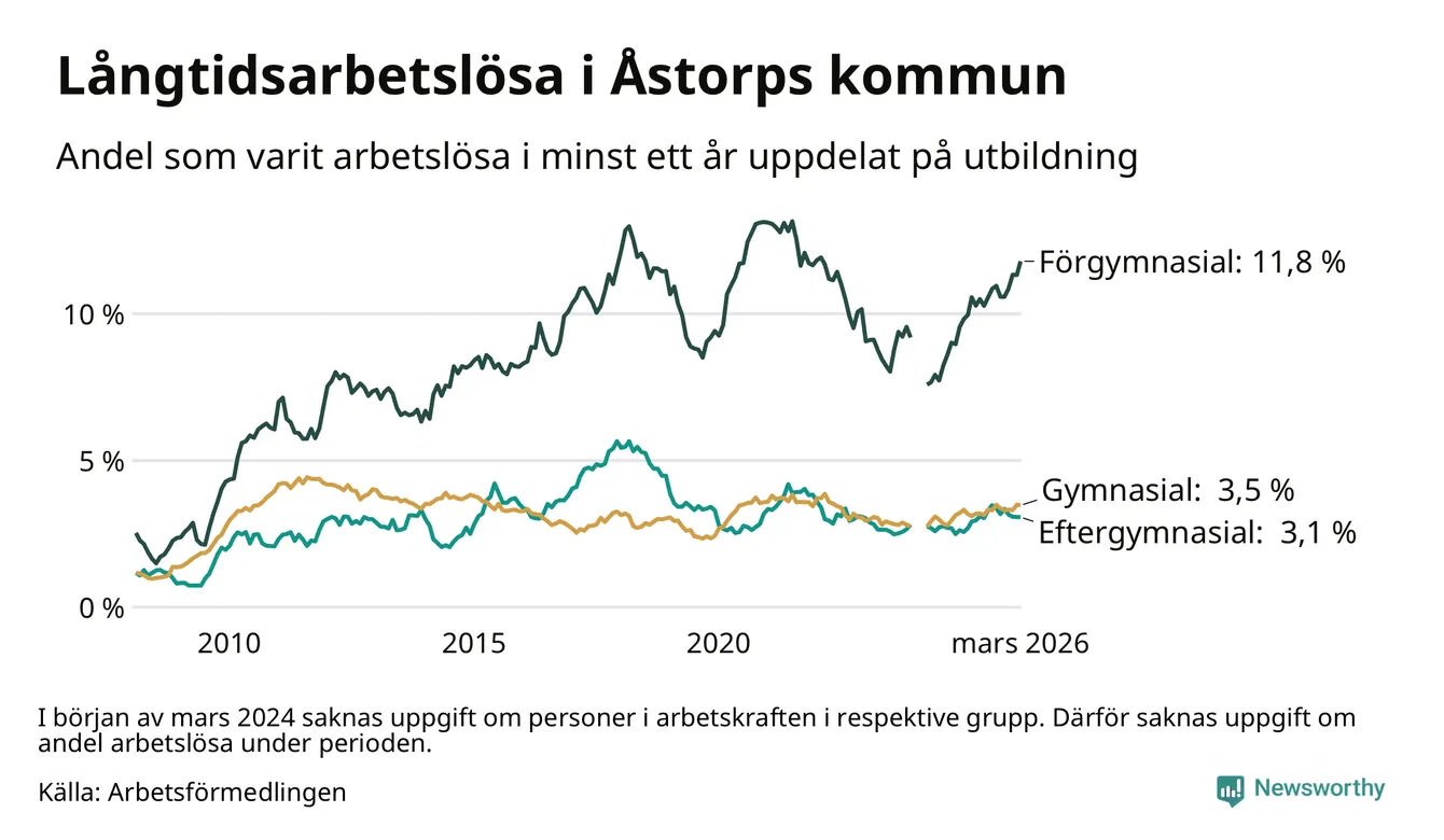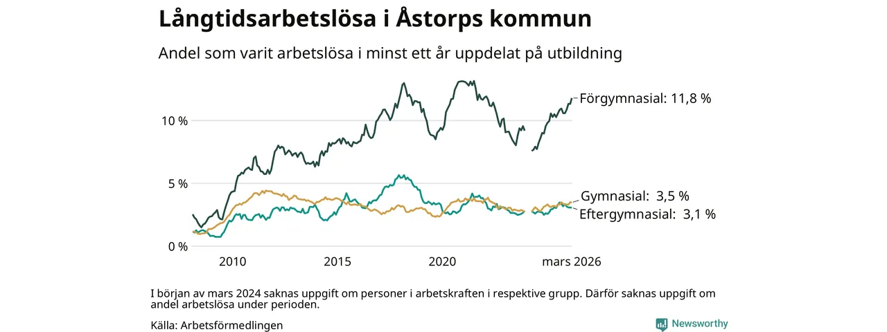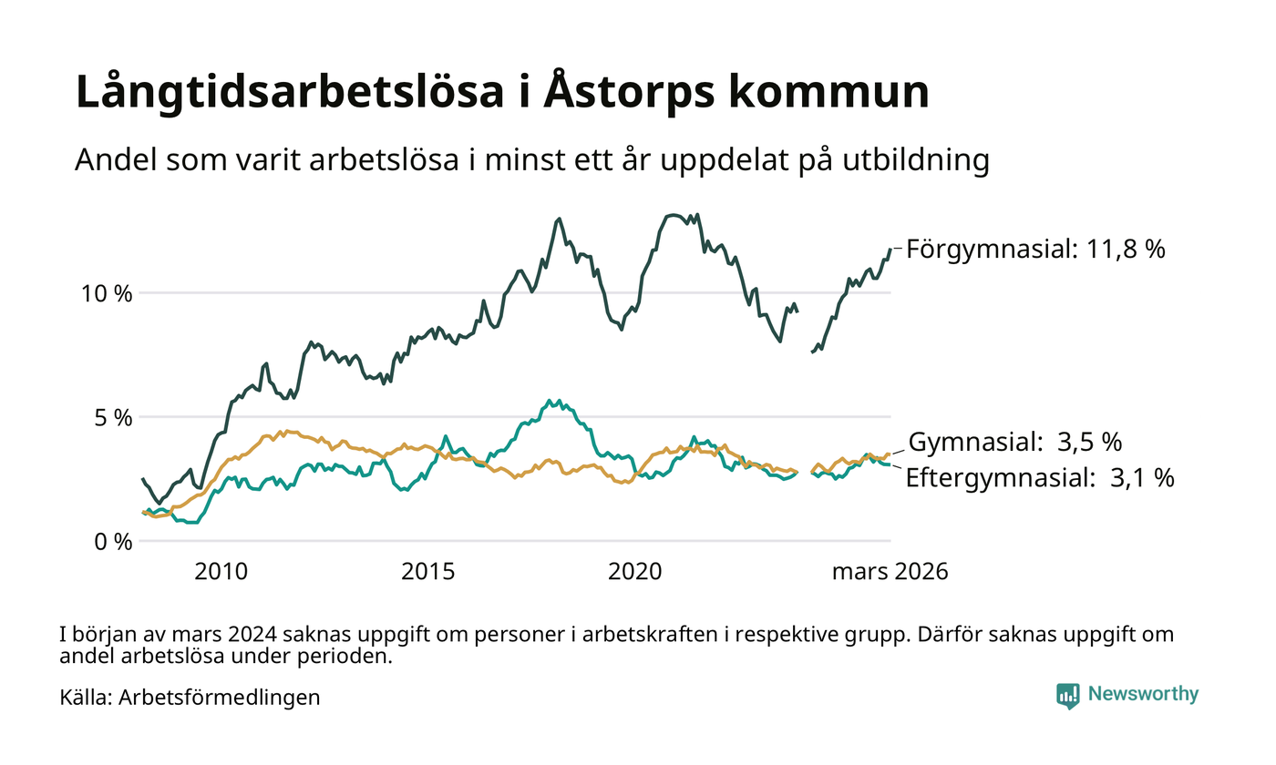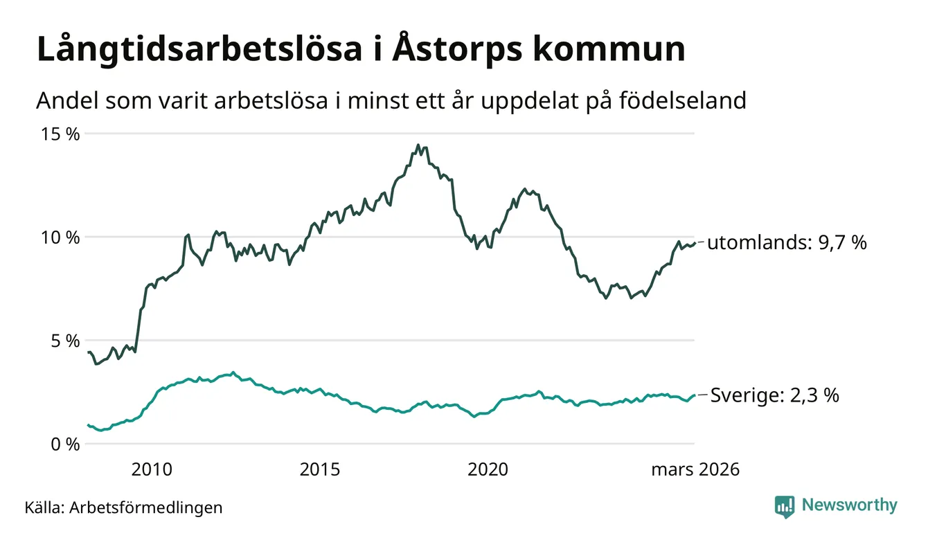 I mars hade 400 Åstorpsbor varit arbetslösa i minst ett år, vilket är sex fler än månaden innan. Det är den fjärde månaden i rad med ökande antal långtidsarbetslösa. 400 personer motsvarar 4,9 procent av arbetskraften i kommunen – andelen långtidsarbetslösa är 0,4 procentenheter högre än samma månad för ett år sedan. Åstorp tillhör de kommuner som har högst andel långtidsarbetslösa i hela landet just nu.