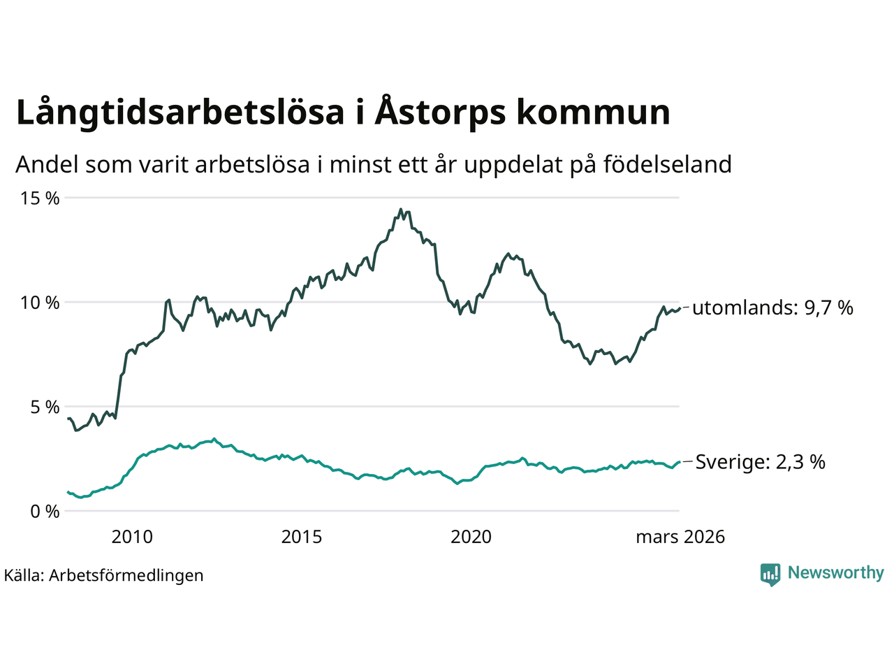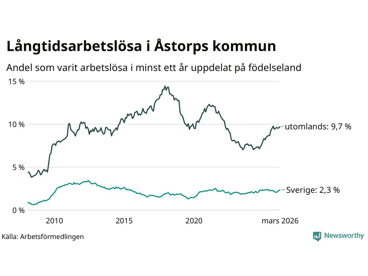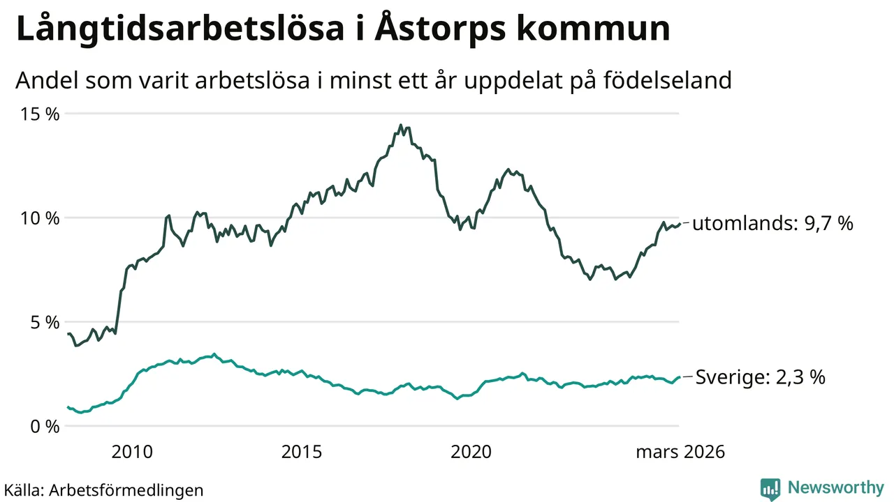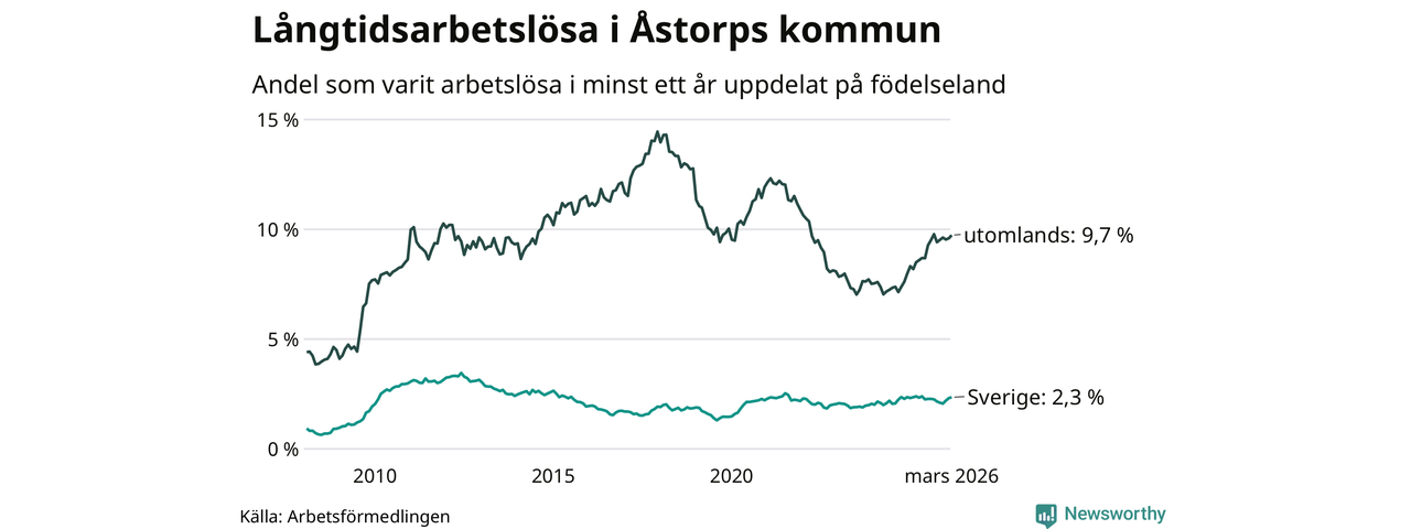 123 av de långtidsarbetslösa i Åstorp är födda i Sverige, medan 277 är födda utomlands. Det innebär att långtidsarbetslösheten bland Sverigefödda är 2,3 procent, medan den är fyra gånger så hög – 9,7 procent – bland födda utomlands. Även i riket som helhet är arbetslösheten högre bland utrikesfödda.