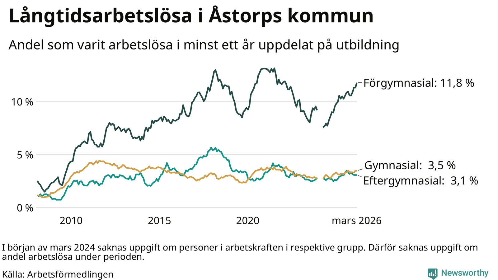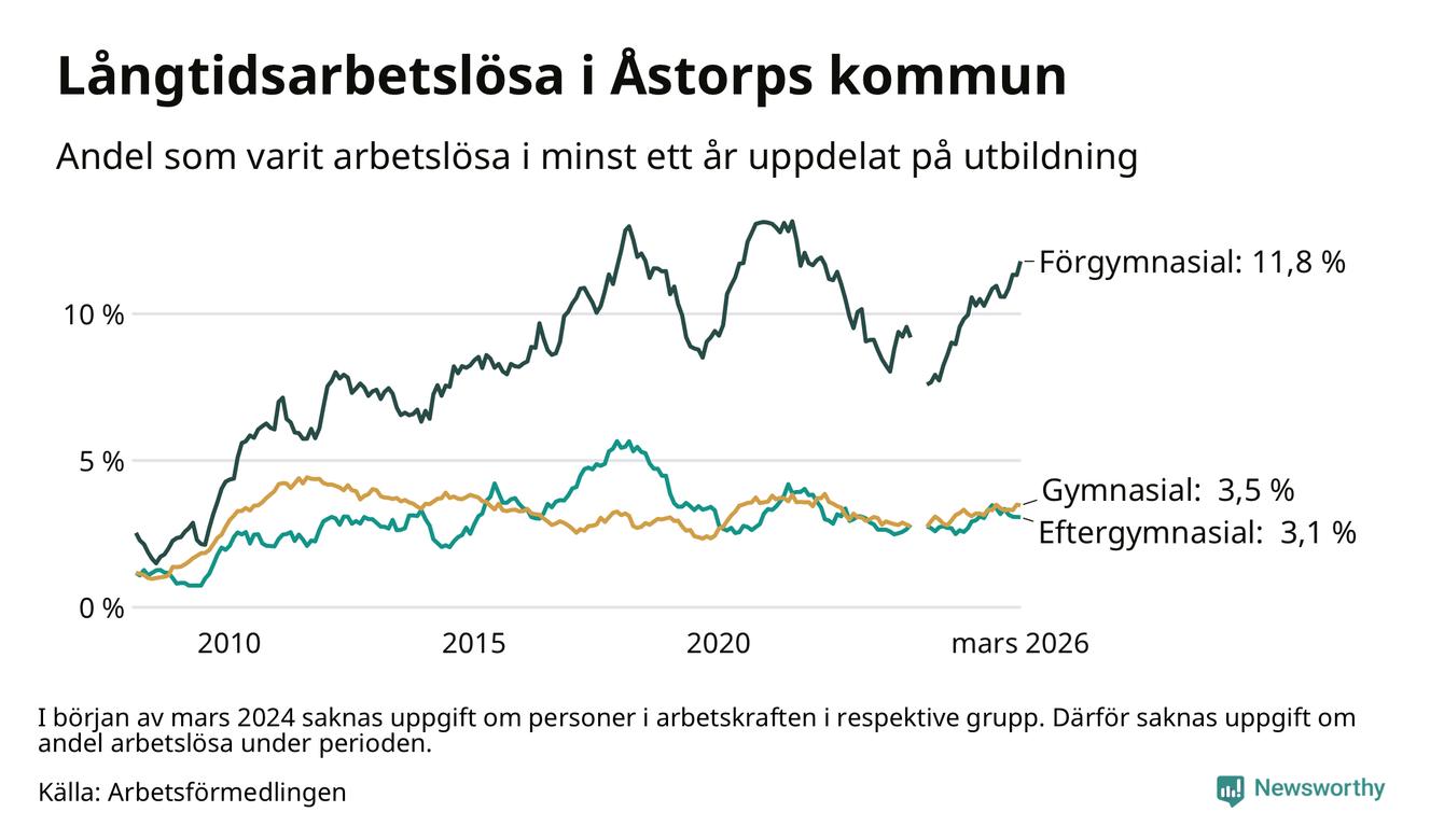 Långtidsarbetslösheten ökar i Åstorp jämfört med förra året. Samtidigt har andelen som står allra längst från arbetsmarknaden – som varit utan arbete i över två år – inte varit högre på åtminstone 15 år. Det visar Arbetsförmedlingens senaste månadsstatistik.