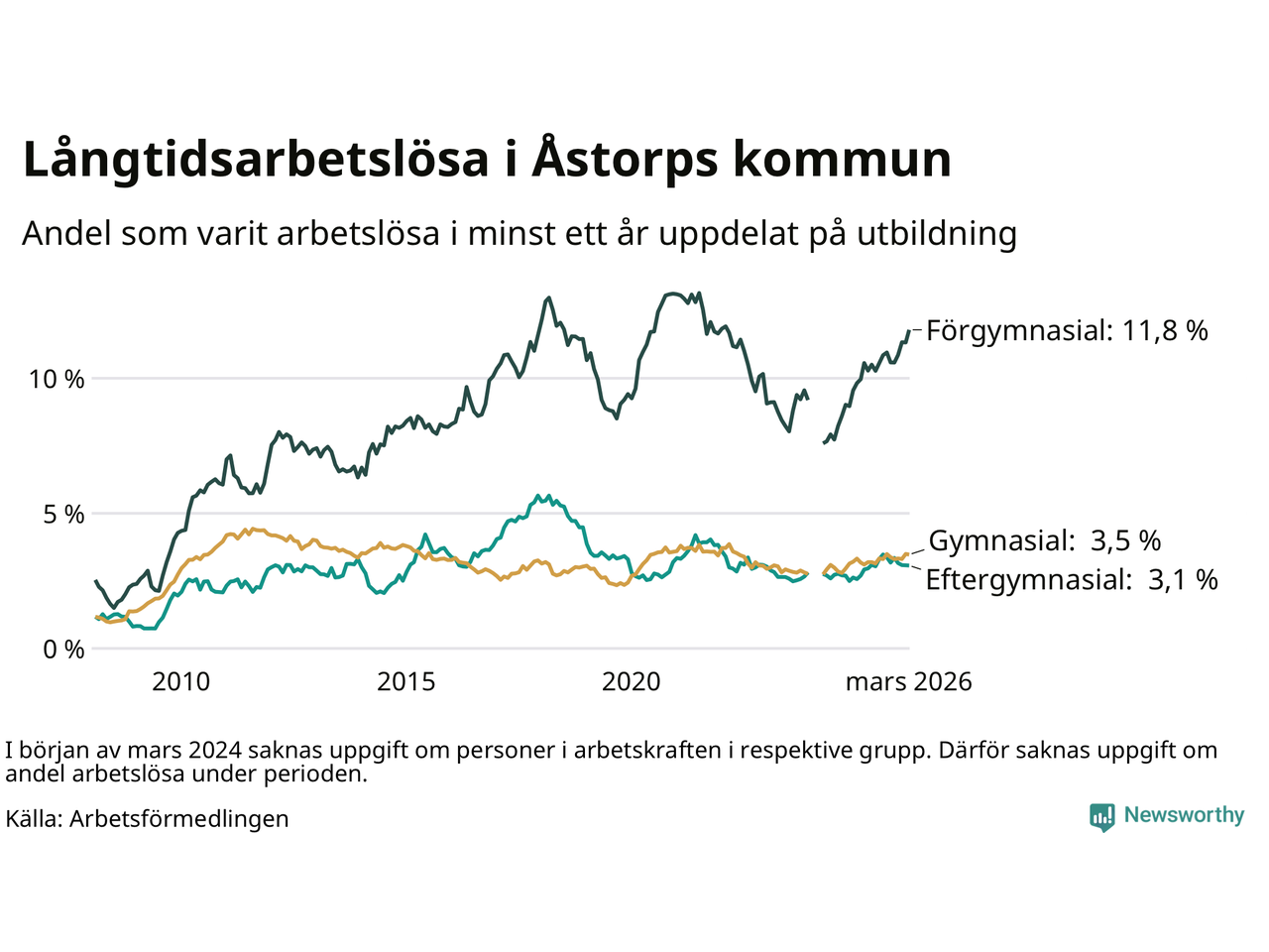 Antalet som står allra längst från arbetsmarknaden – som varit utan arbete utan i minst två år – har ökat jämfört med samma månad för ett år sedan: från 190 till 232, eller 2,9 procent av arbetskraften i mars 2026. Det är den högsta andelen under de senaste 15 åren.