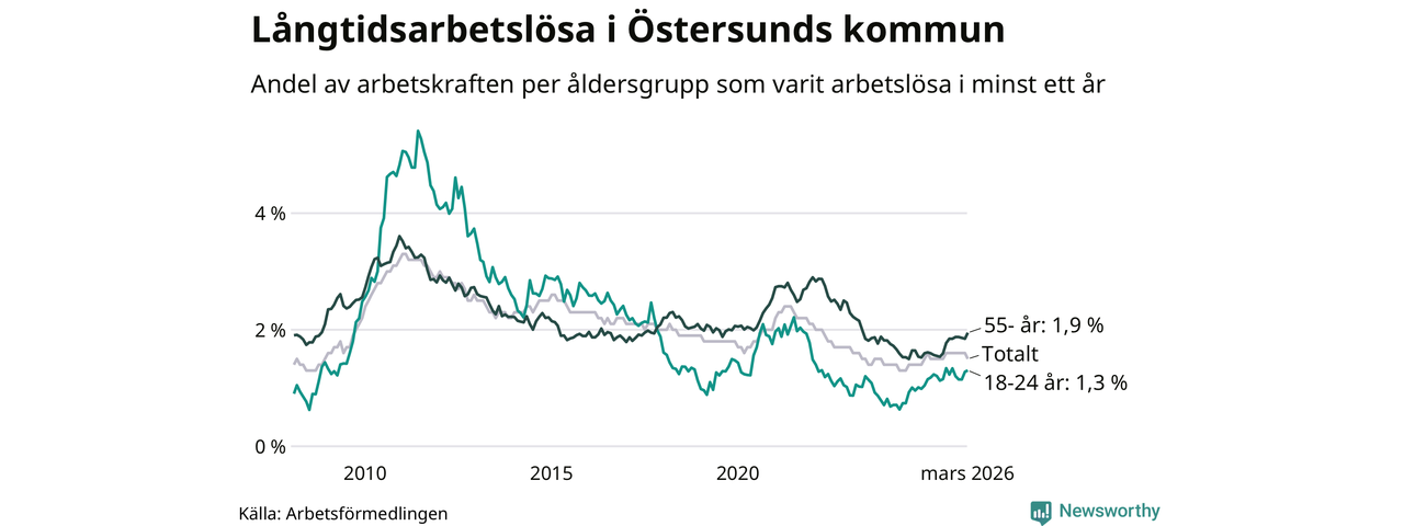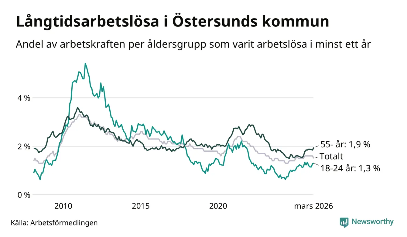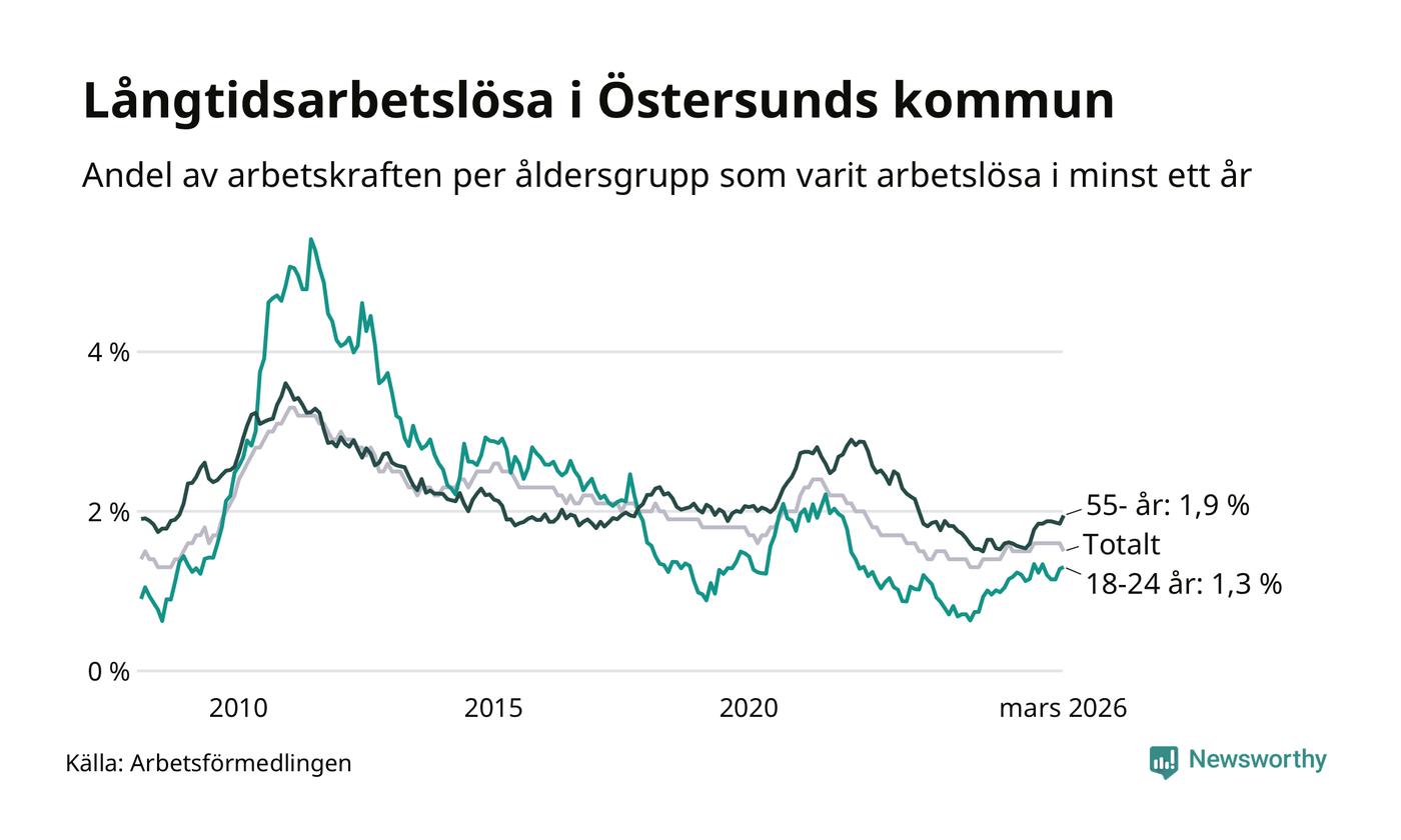 Av de 508 personerna som varit arbetslösa i mer än ett år i Östersunds kommun är 132 personer mellan 55 och 661 år och 49 är mellan 18 och 24 år. För den äldre gruppen är andelen arbetslösa 1,9 procent medan den i den yngre gruppen är 1,3 procent. Även i riket som helhet är långtidsarbetslösheten högre i gruppen äldre.