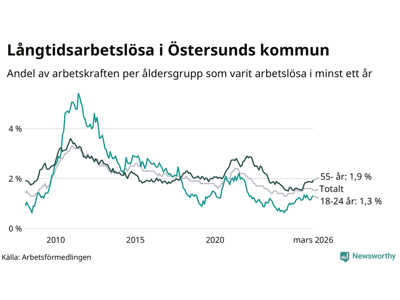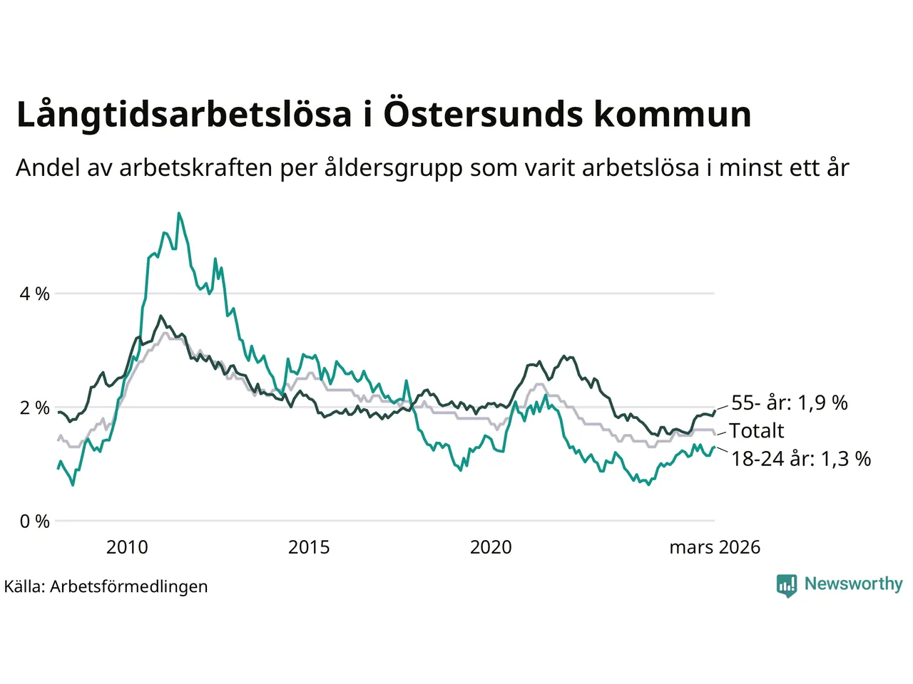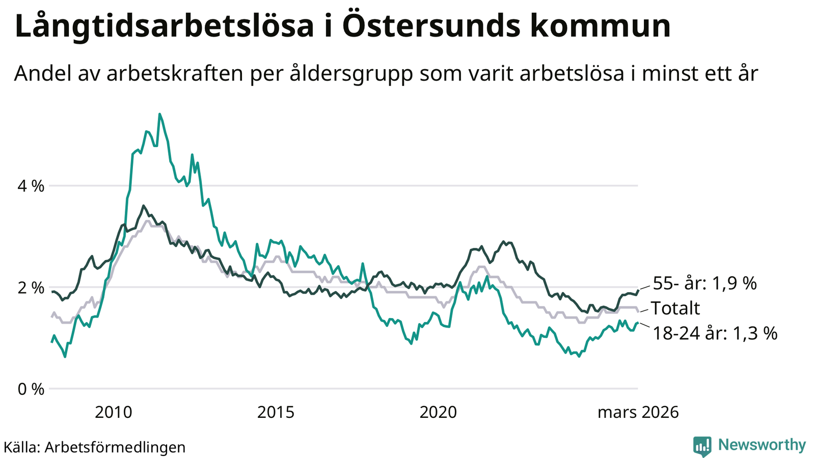 Av de 508 personerna som varit arbetslösa i mer än ett år i Östersunds kommun är 132 personer mellan 55 och 661 år och 49 är mellan 18 och 24 år. För den äldre gruppen är andelen arbetslösa 1,9 procent medan den i den yngre gruppen är 1,3 procent. Även i riket som helhet är långtidsarbetslösheten högre i gruppen äldre.