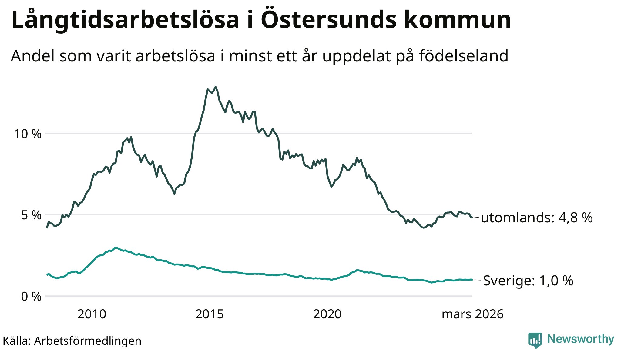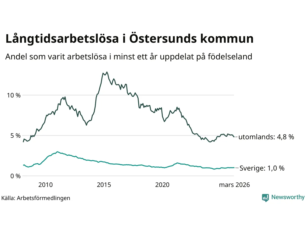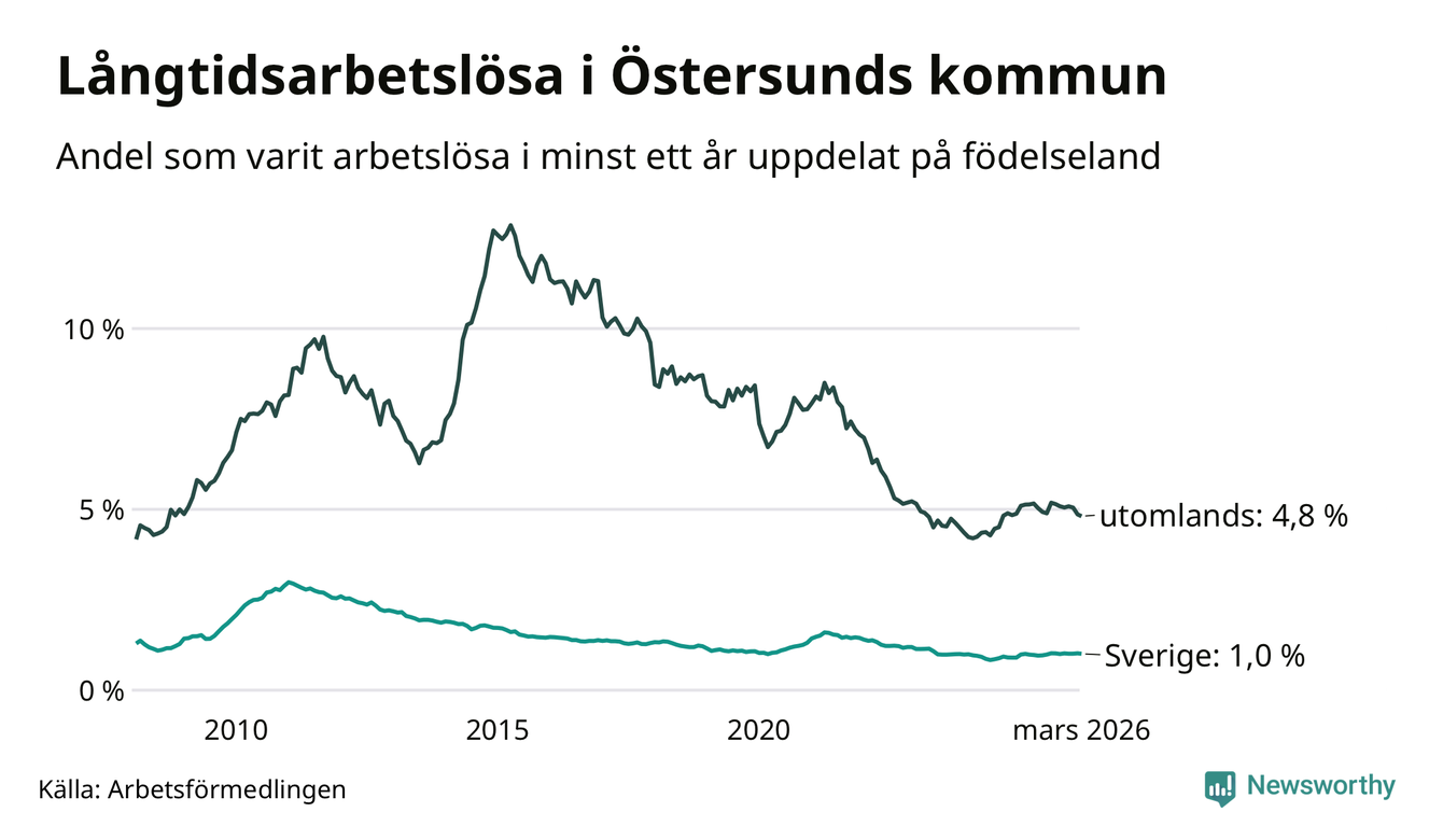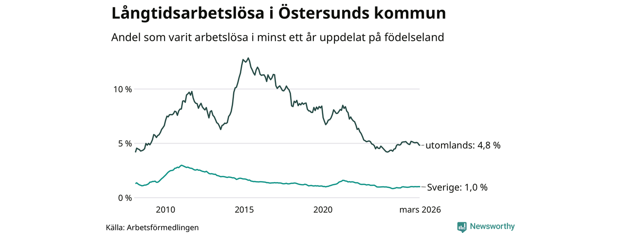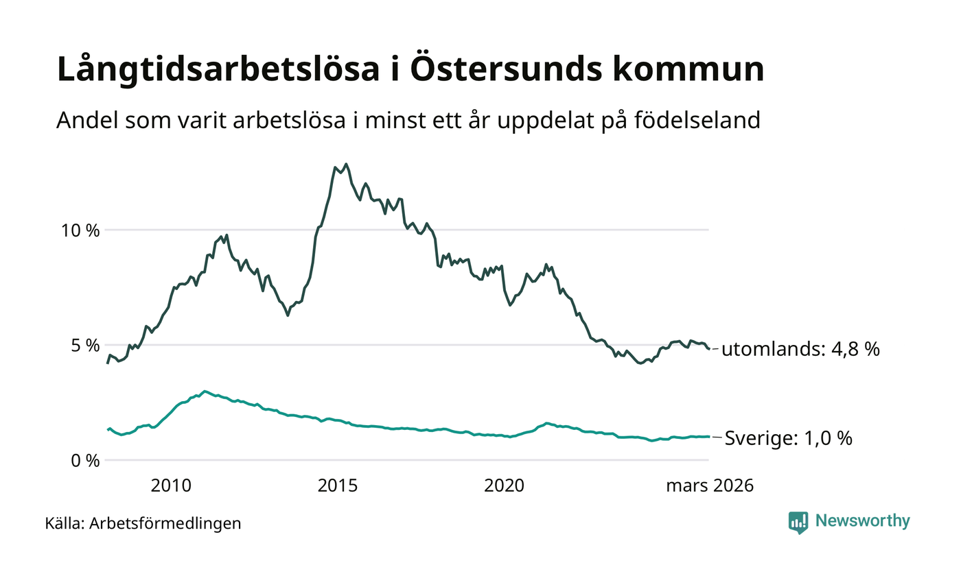 287 av de långtidsarbetslösa i Östersund är födda i Sverige, medan 221 är födda utomlands. Det innebär att långtidsarbetslösheten bland Sverigefödda är 1,0 procent, medan den är fem gånger så hög – 4,8 procent – bland födda utomlands. Även i riket som helhet är arbetslösheten högre bland utrikesfödda.