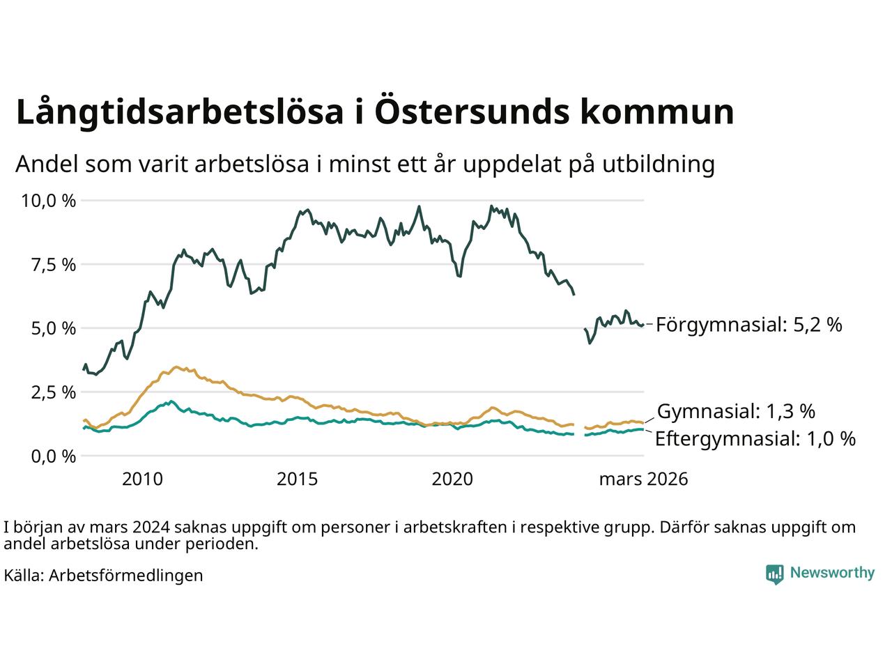 Graf: Andel arbetslösa i Östersund som varit utan arbete i minst 12 månader