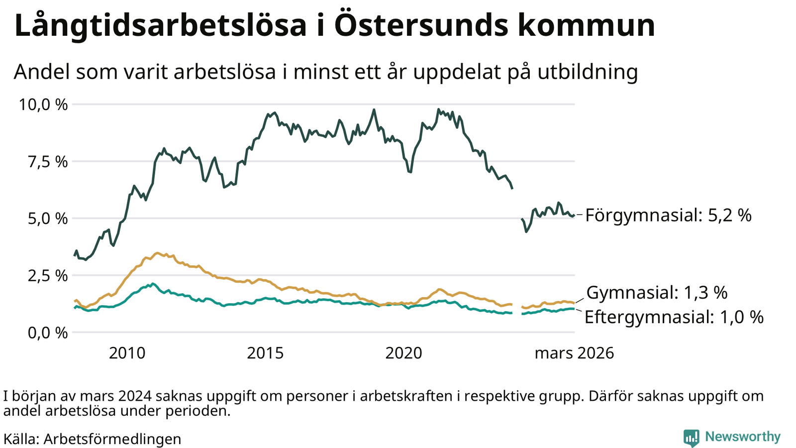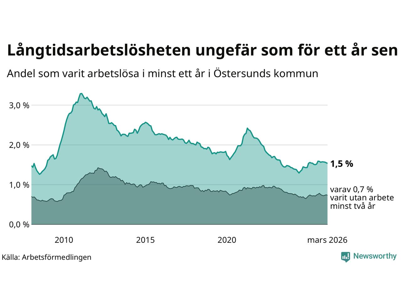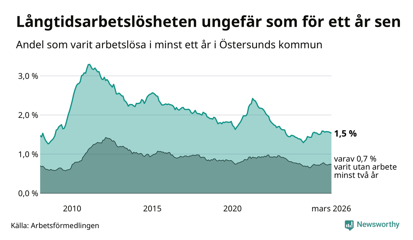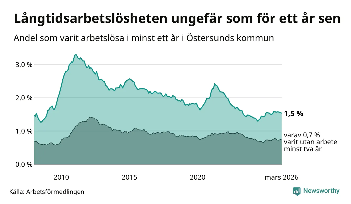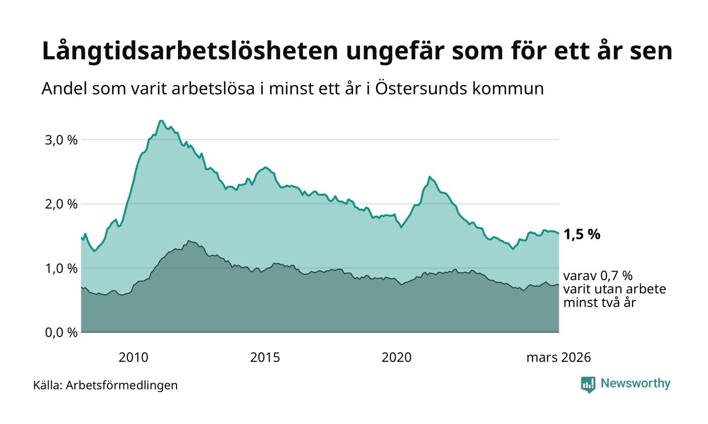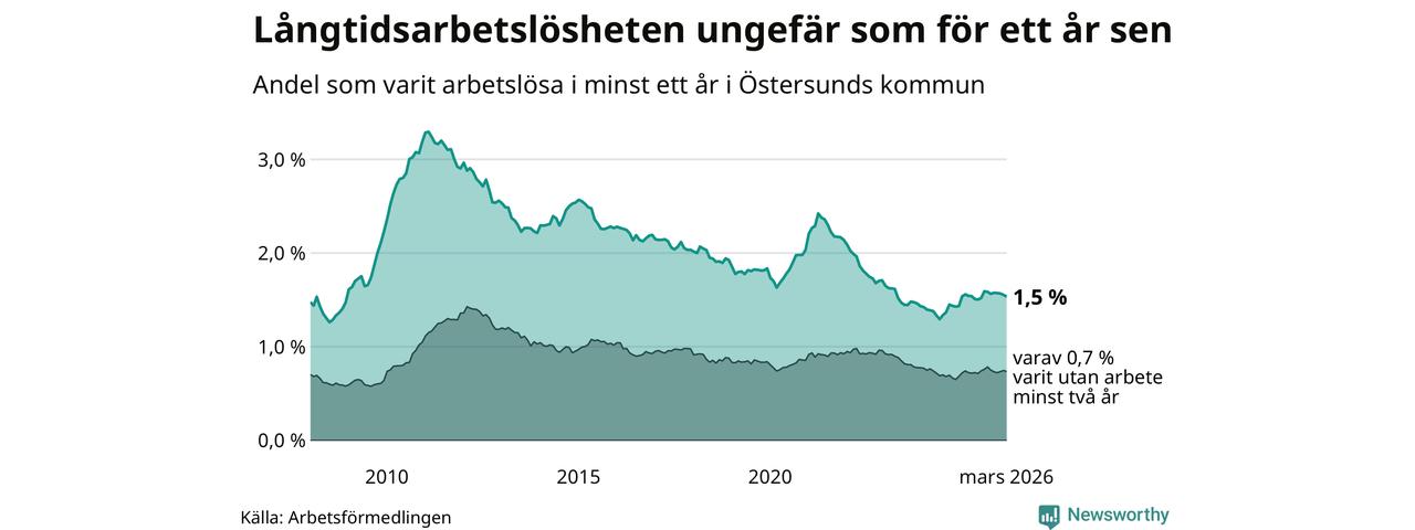 I mars hade 508 Östersundsbor varit arbetslösa i minst ett år, vilket är sex färre än månaden innan. 508 personer motsvarar 1,5 procent av arbetskraften i kommunen – andelen långtidsarbetslösa är ungefär på samma nivå som för ett år sedan.