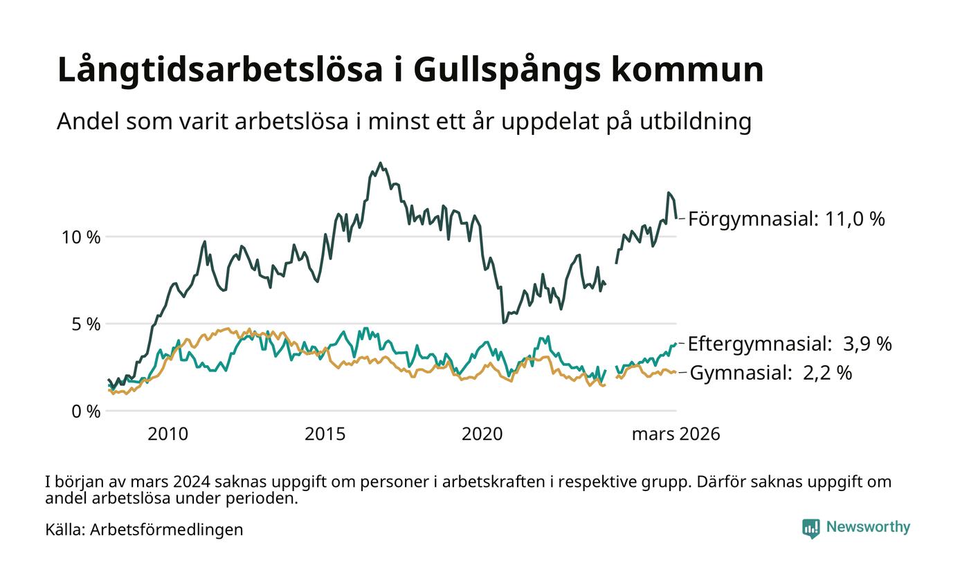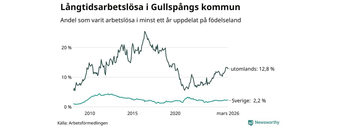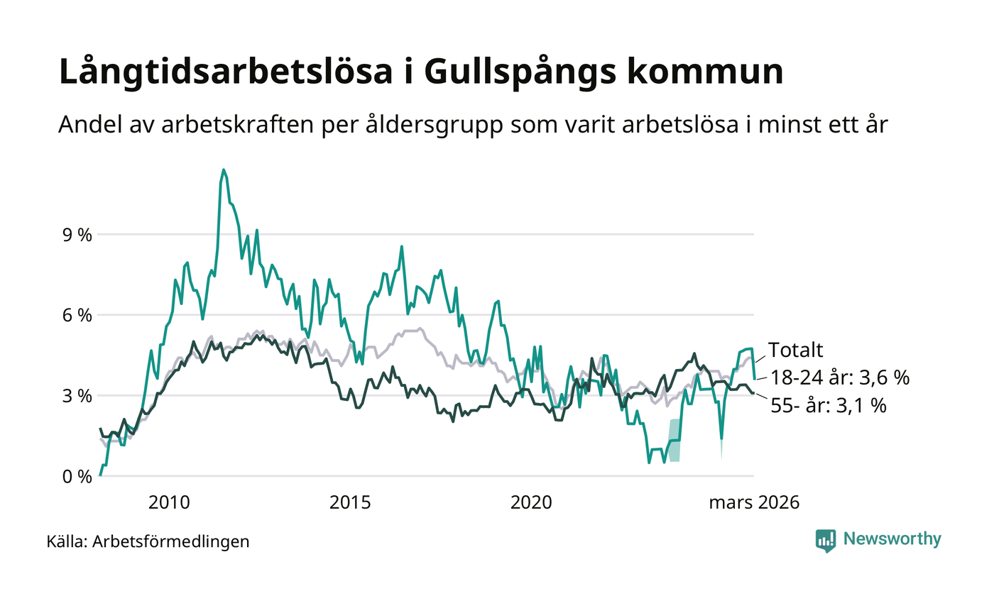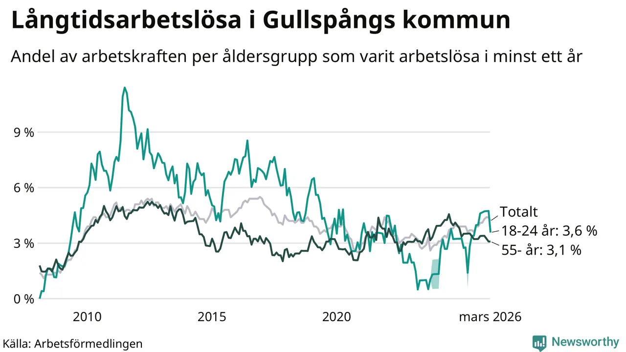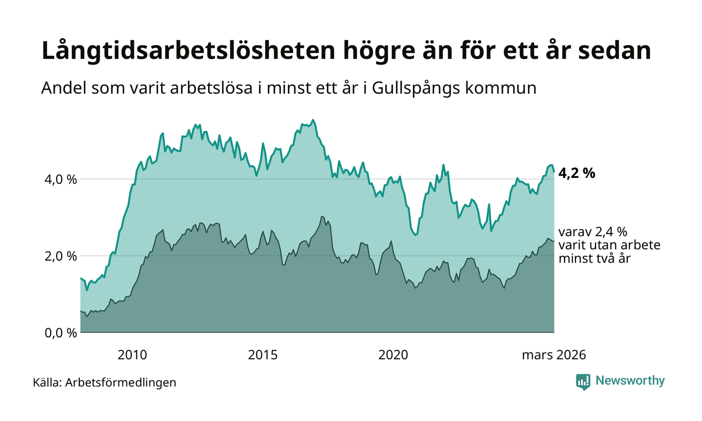 I mars hade 84 Gullspångsbor varit arbetslösa i minst ett år, vilket är fyra färre än månaden innan. Det är den första månaden sedan juli 2025 som antalet arbetslösa minskar. 84 personer motsvarar 4,2 procent av arbetskraften i kommunen – andelen långtidsarbetslösa är 0,3 procentenheter högre än samma månad för ett år sedan. Gullspång tillhör de kommuner som har högst andel långtidsarbetslösa i hela landet just nu.