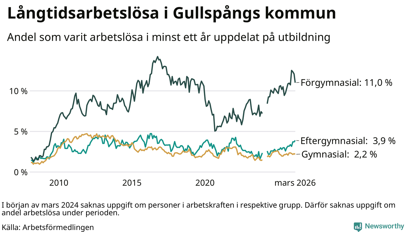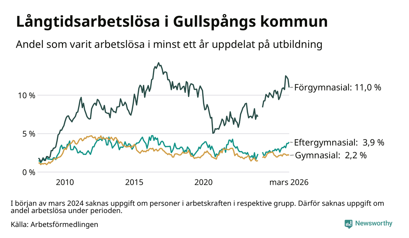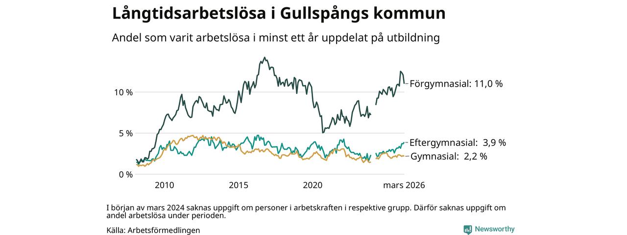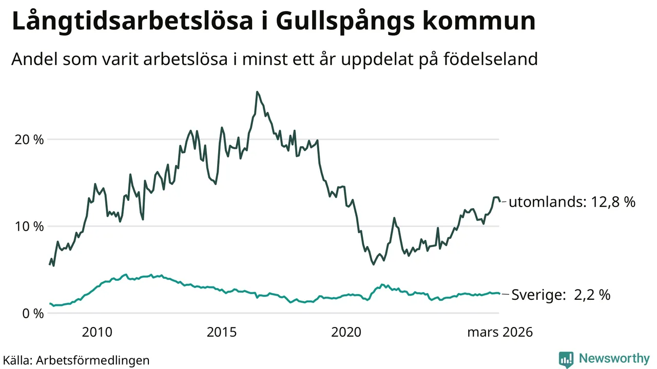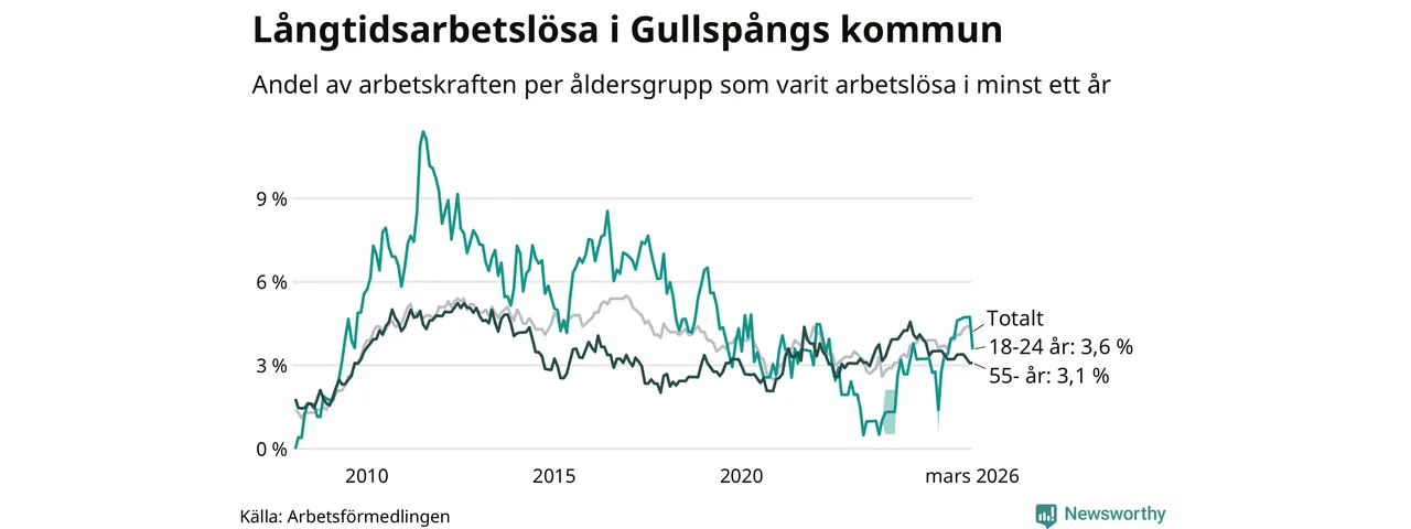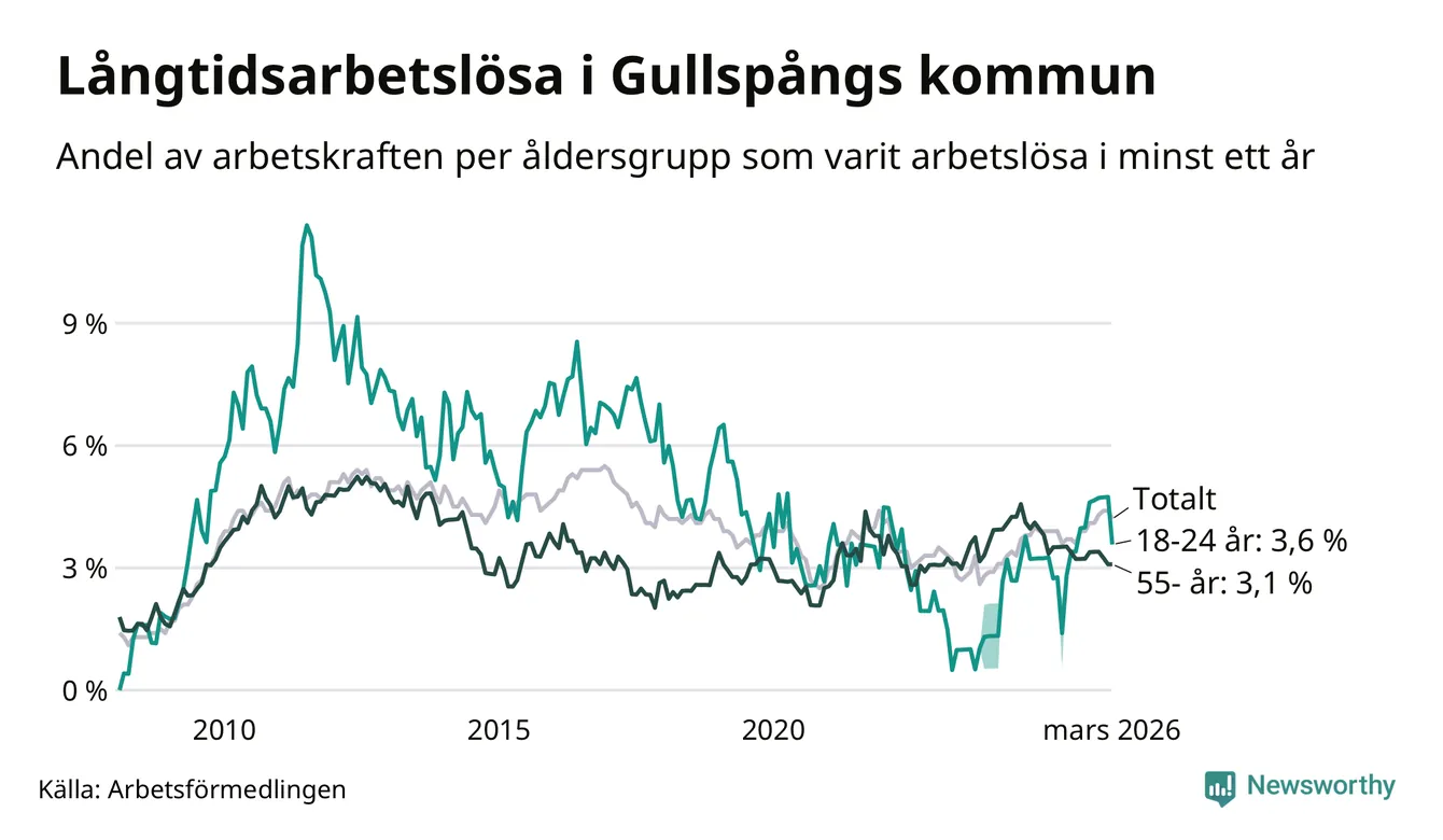 I mars hade 84 Gullspångsbor varit arbetslösa i minst ett år, vilket är fyra färre än månaden innan. Det är den första månaden sedan juli 2025 som antalet arbetslösa minskar. 84 personer motsvarar 4,2 procent av arbetskraften i kommunen – andelen långtidsarbetslösa är 0,3 procentenheter högre än samma månad för ett år sedan. Gullspång tillhör de kommuner som har högst andel långtidsarbetslösa i hela landet just nu.