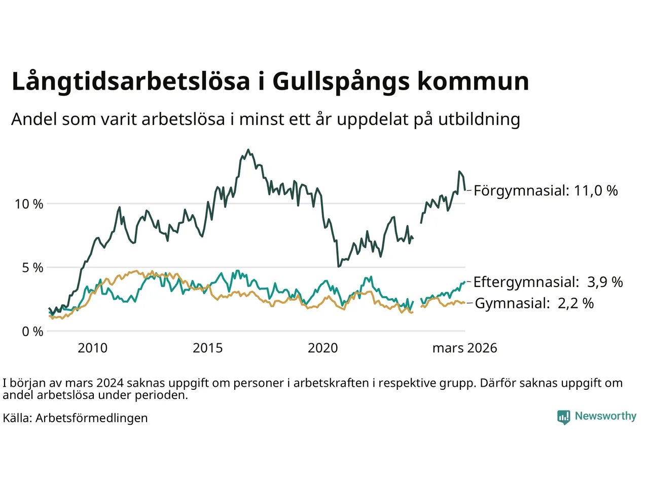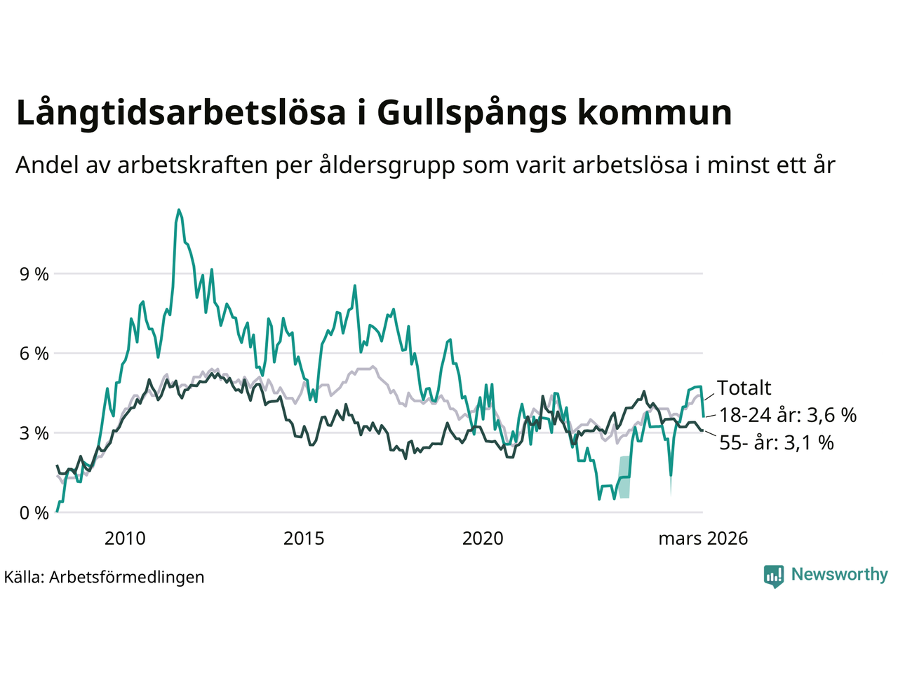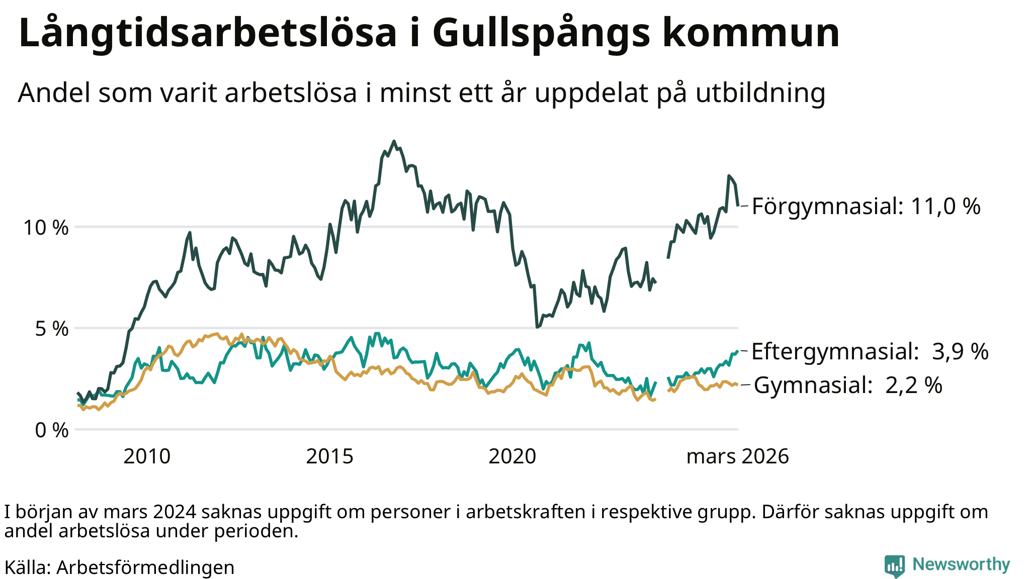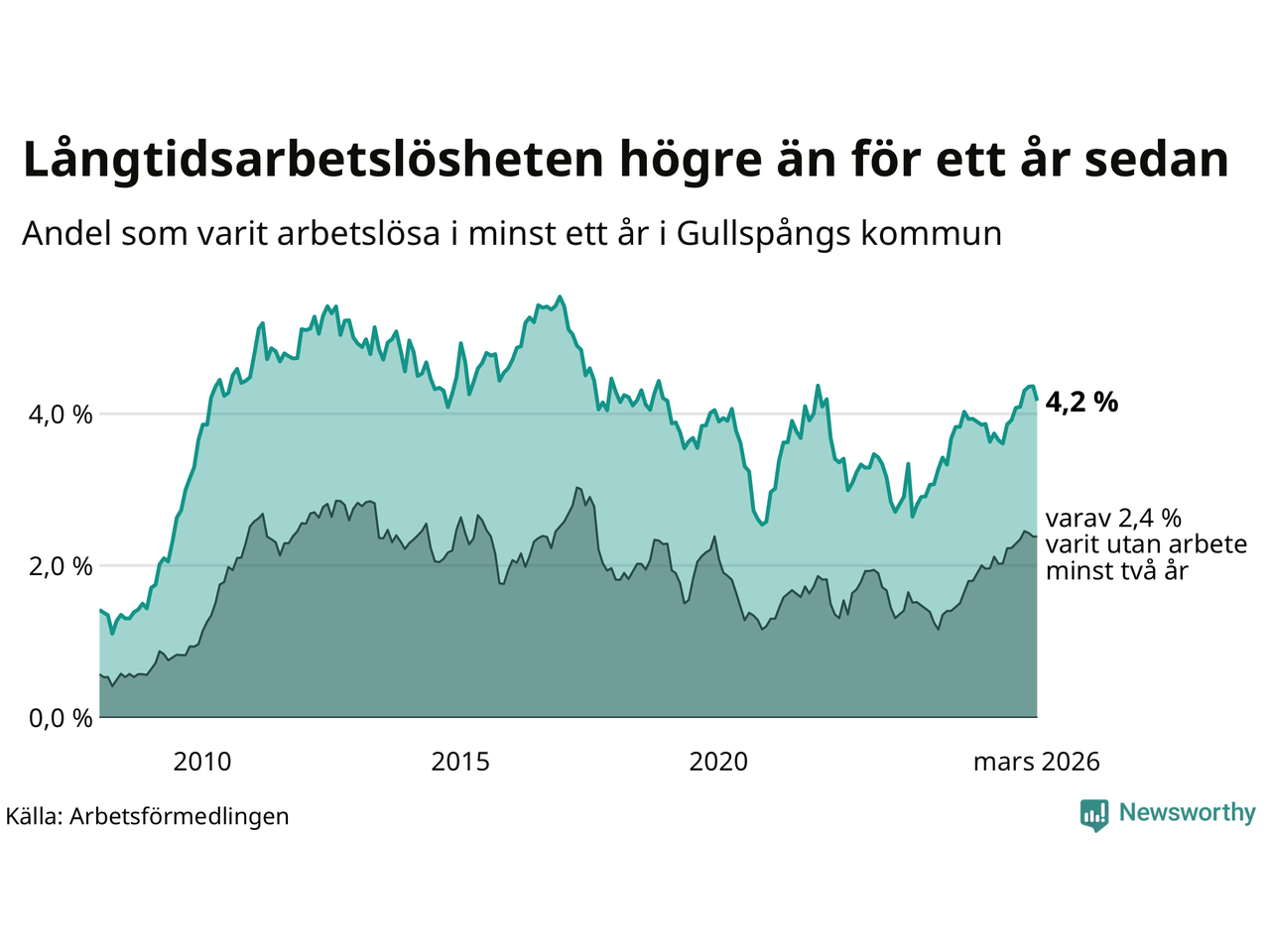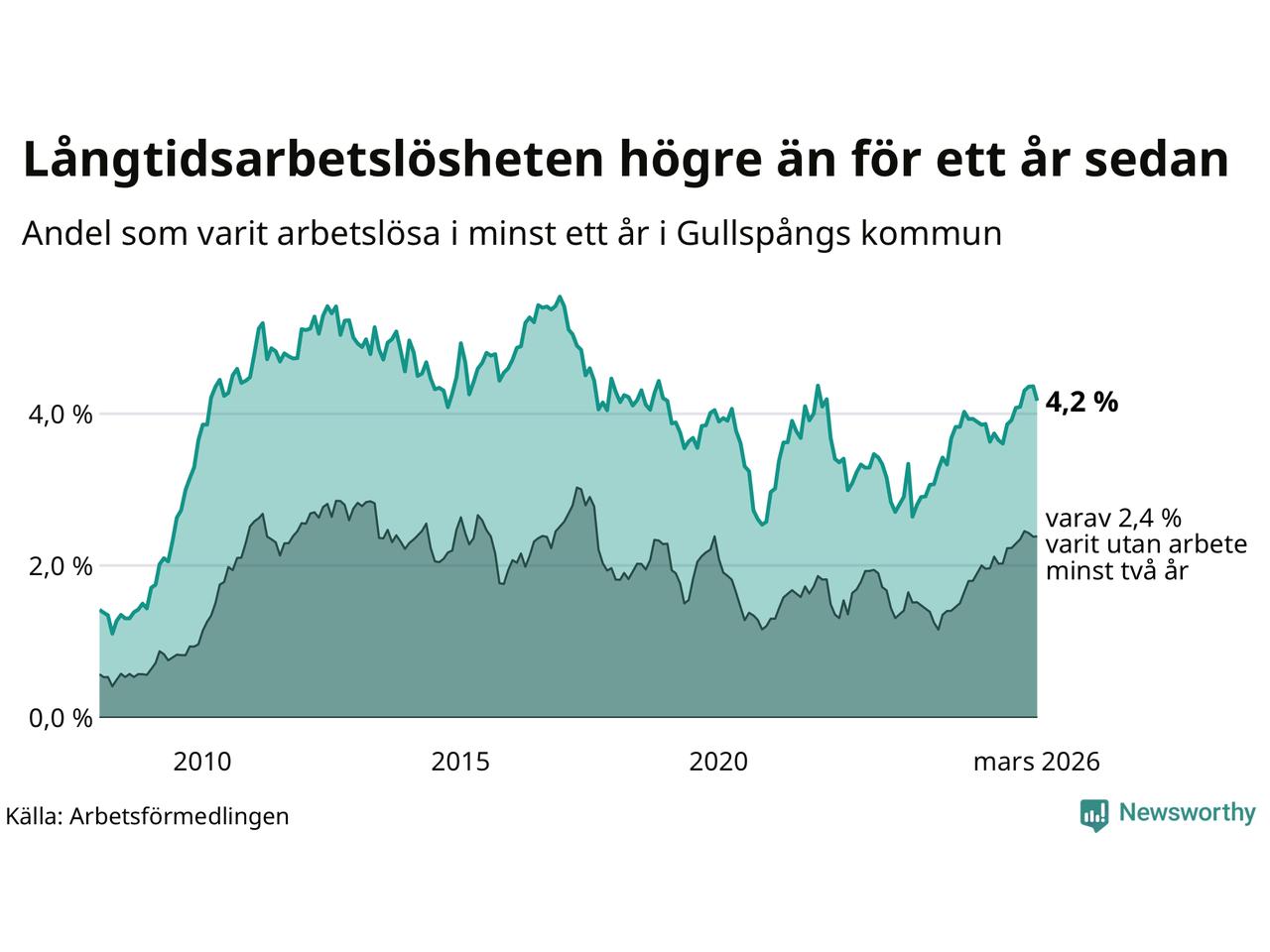 | Andel arbetslösa i minst ett år | 4,2 % | 2,5 % | 2,9 % |